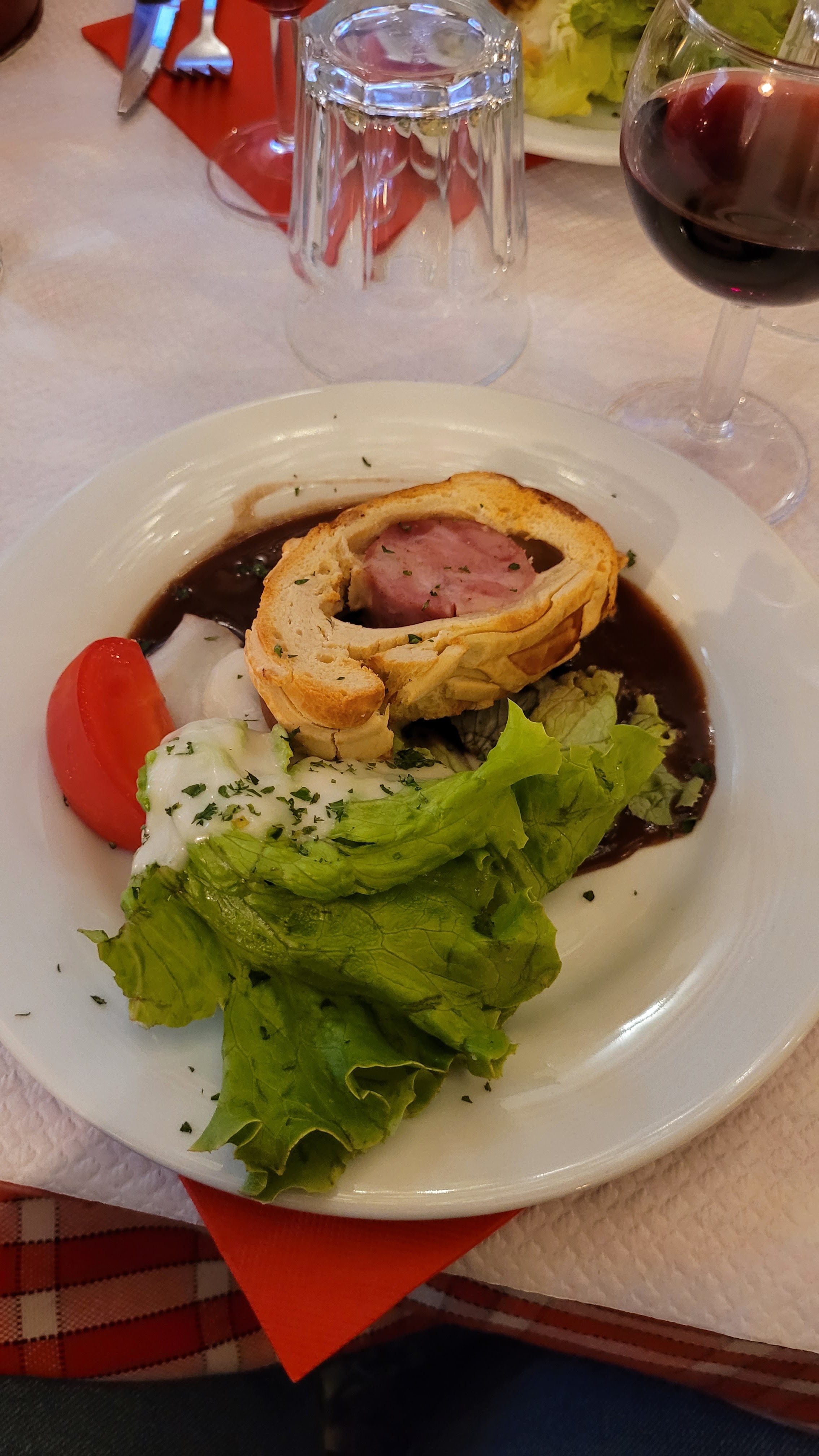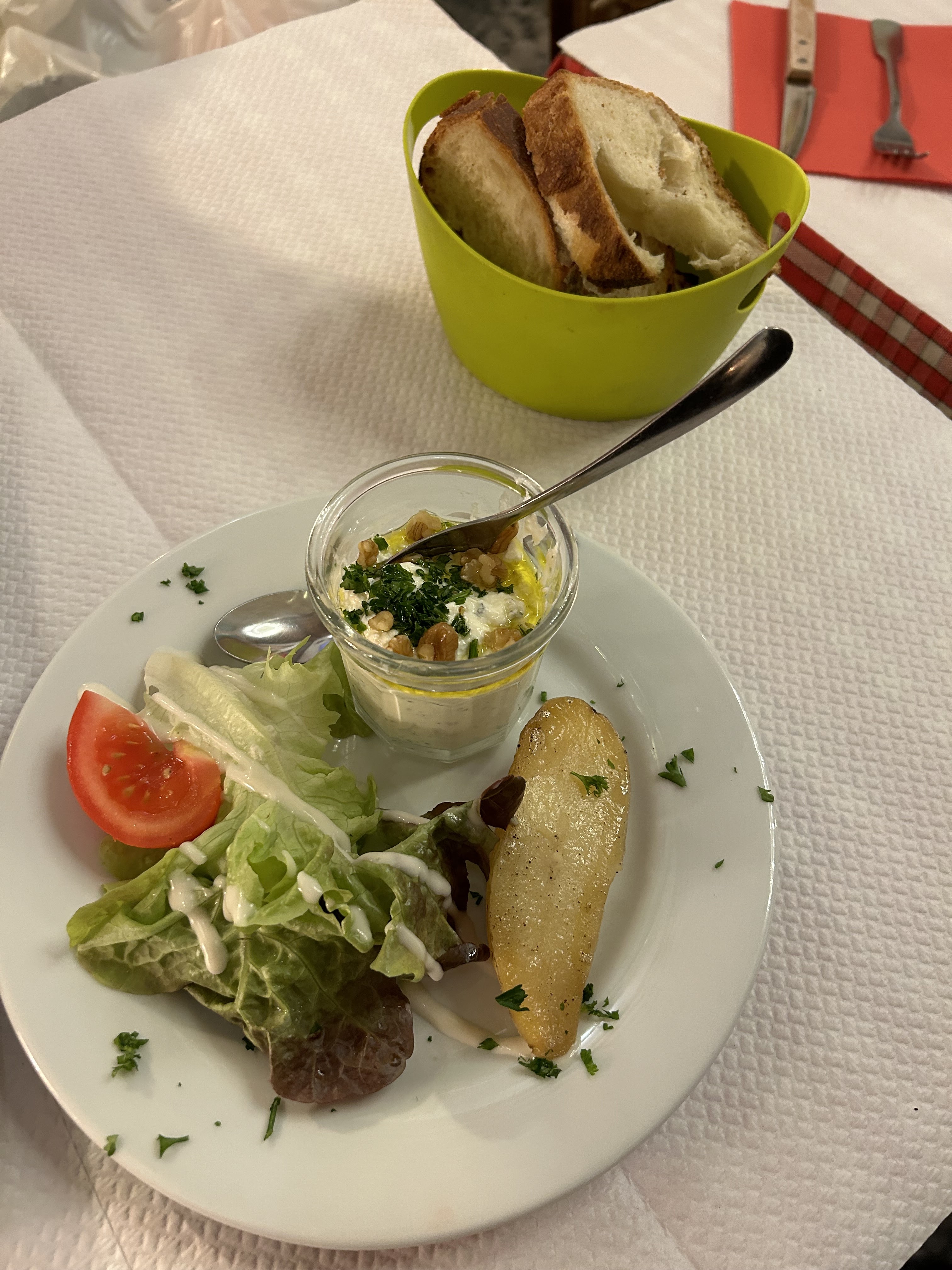 Pas une super expérience. Je ne comprends vraiment pas la note de 4,6. Nous avons été accueillis par la dame devant le restaurant d'en face Chez Marie (bizarre). J'ai demandé une eau Perrier et on m'a donné une bouteille ouverte contenant de l'eau plate (encore plus bizarre). Les salades que nous avons reçues sont arrivées en une fraction de seconde (jamais un bon signe). Tout était préparé à l'avance, rien de créatif. juste une salade verte avec une vinaigrette et les garnitures. Le serveur s'excusait et souriait, mais quelque chose n'allait pas dans cet endroit. Difficile de mettre le doigt dessus.