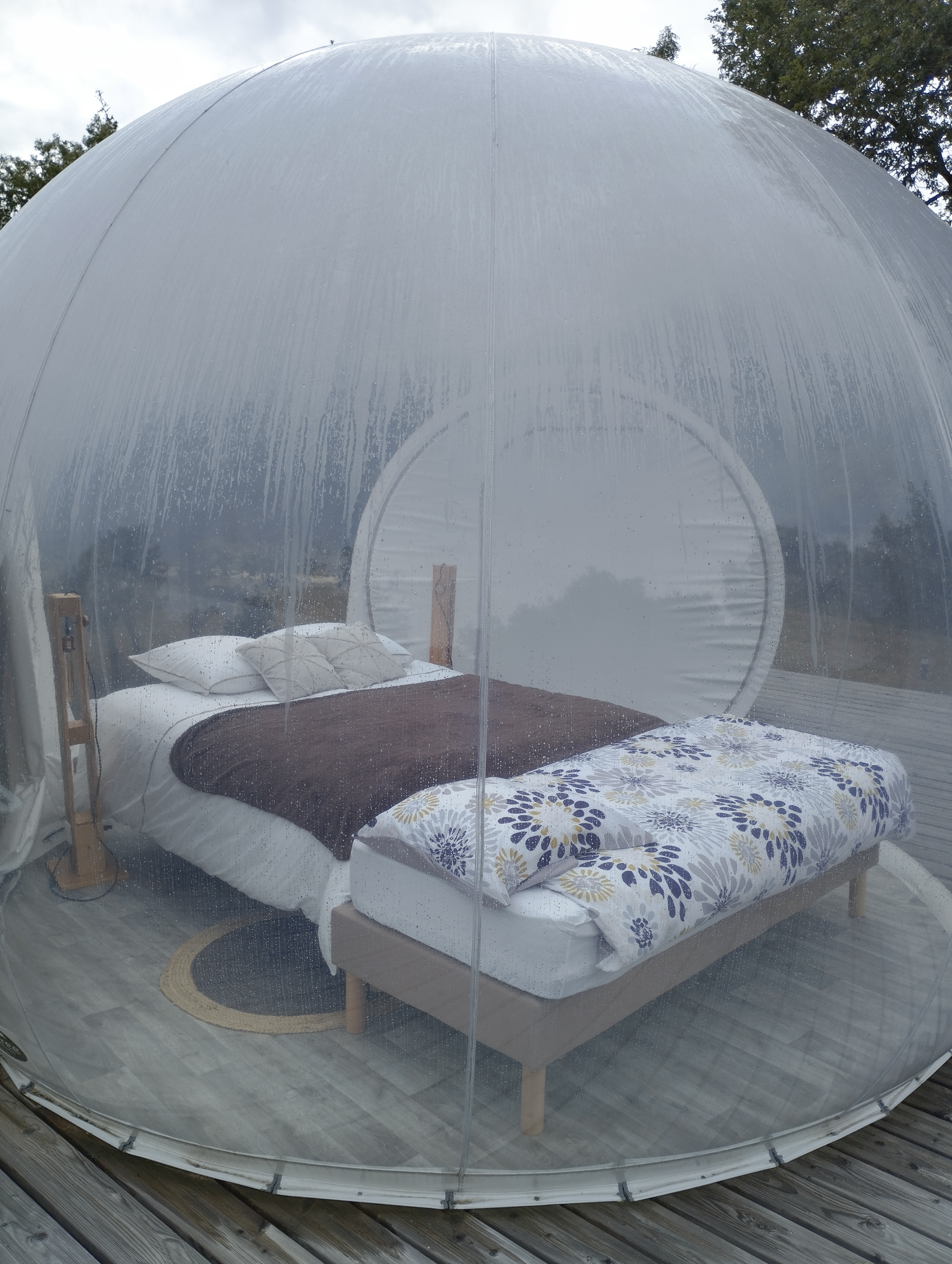 Petit séjour reposant, ressourçant, apaisant 😌 une bulle de bonheur avec votre moitié! Un lit super confortable, douillet, des draps tous doux qui sentent bon 😊 Quel plaisir d'observer la nuit tomber depuis ce doux nid, hypnotique. Lâcher prise assuré. Le repas surprise puisque produits de saison, bien cuisiné et copieux. Une petite toilette seulement est possible dans la bulle mais une douche est à disposition à l'accueil. Hôtes très accueillante, chaleureuses, sans chichi. Plaisir simple, à faire absolument 😍