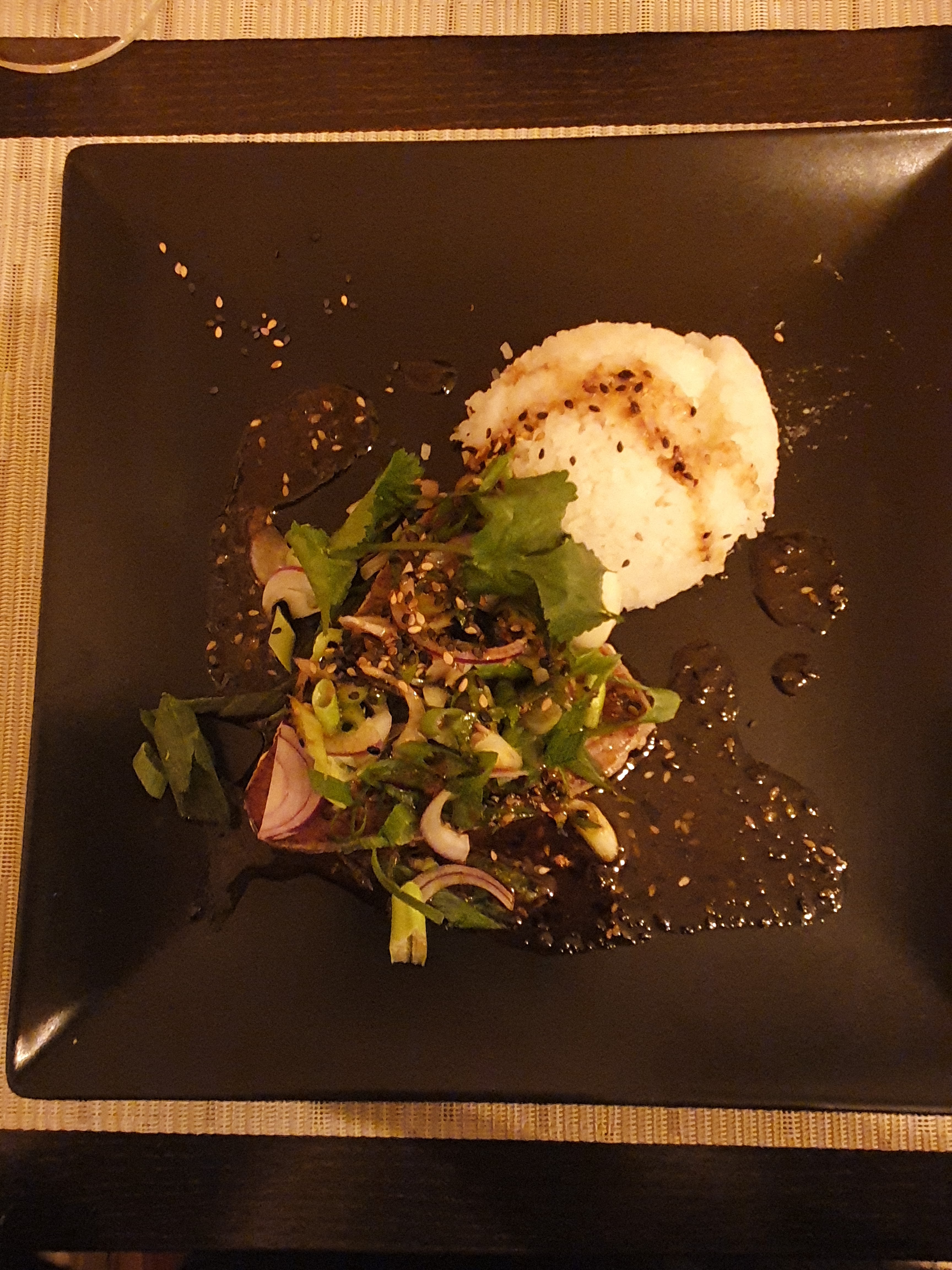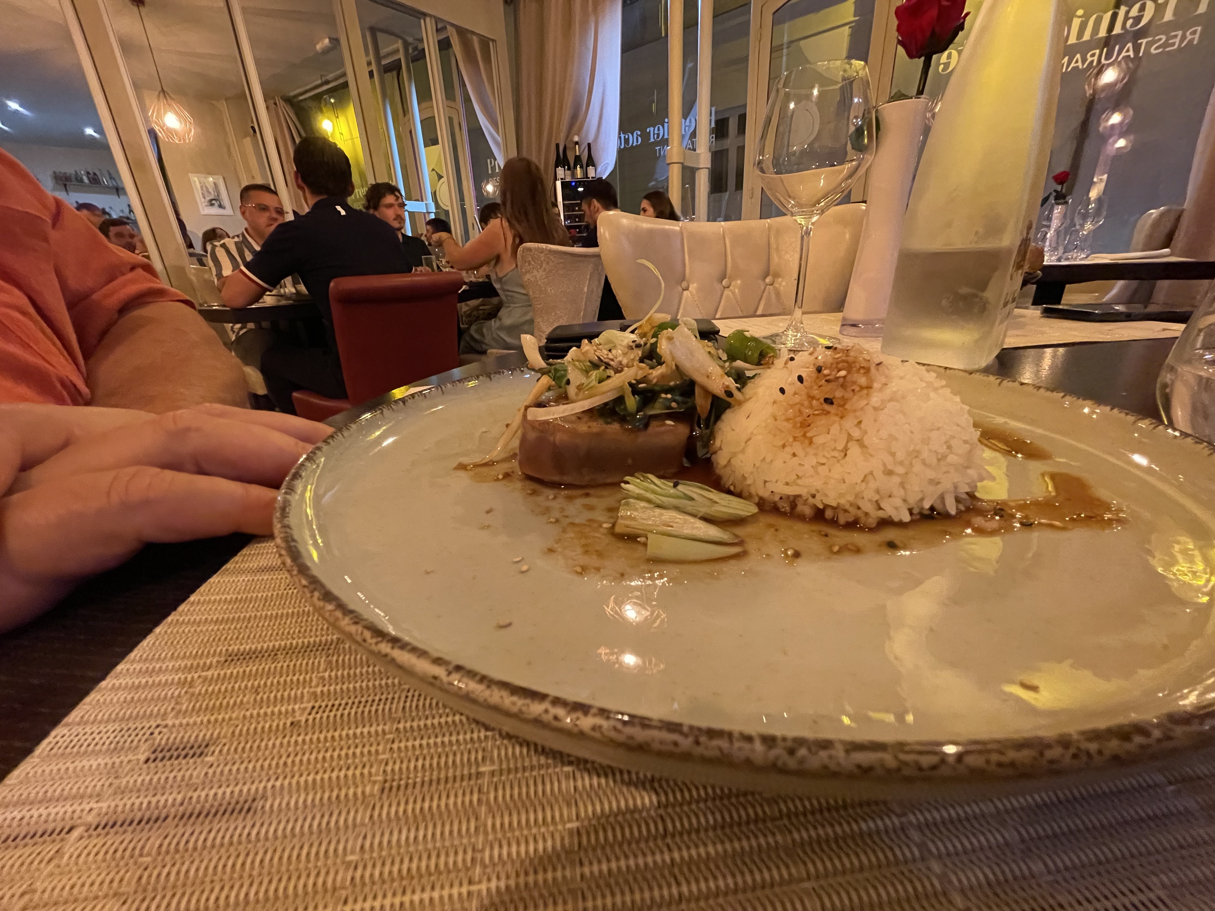 Joli cadre, service réactif et sympathique, nos entrées (salade asiatique aux crevettes) étaient délicieuses, le pavé et le tartare de thon étaient bons.