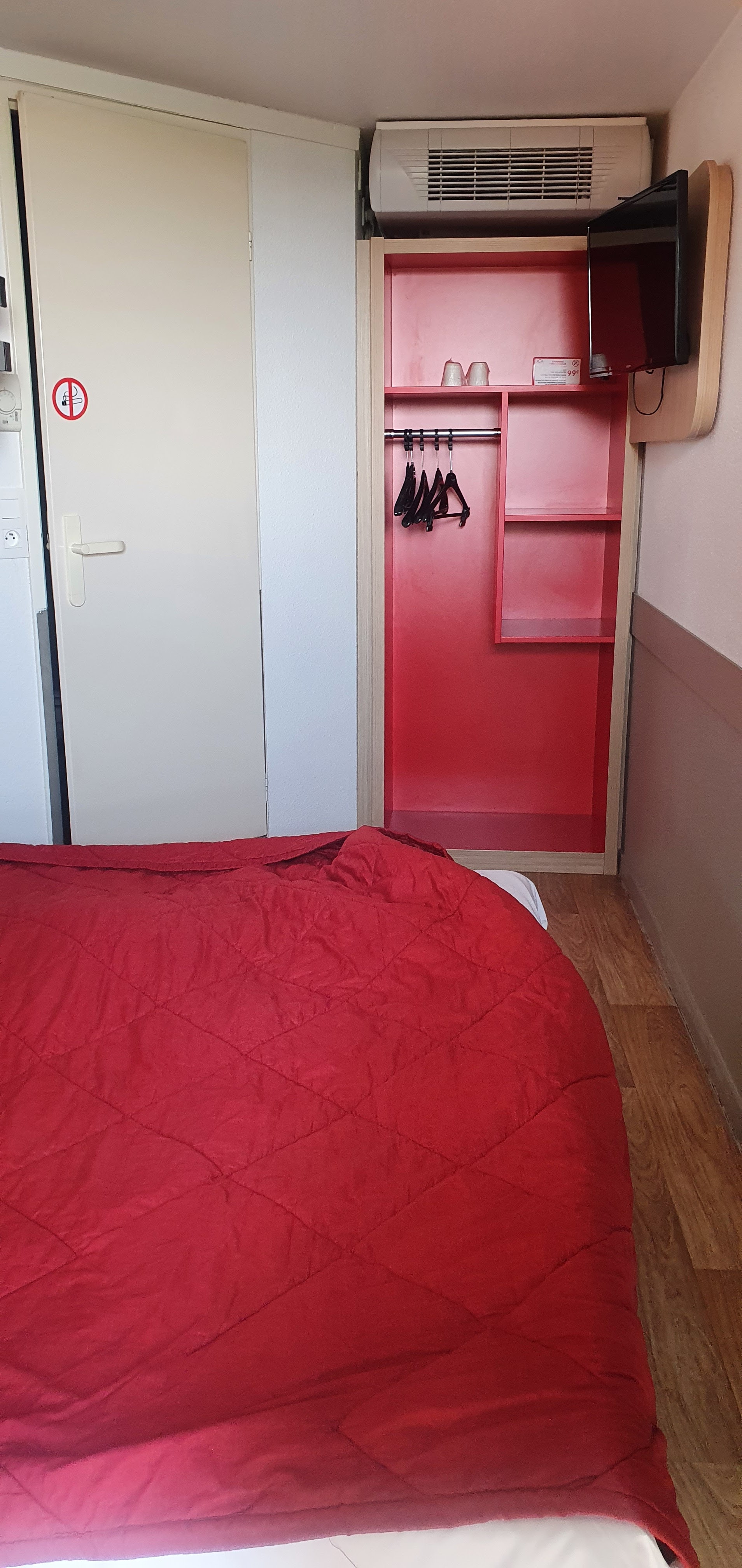 Hôtels mal isolé phonique et thermique surtout la chambre 108 avec le impression de dormir la porte ouverte avec la route a côté avec beaucoup de passages, salle de bain très petite faite pour les anorexique,pas de mitigeur pour la douche et lavabo du coup robinet sans indiquer l' eau chaude au froide par conséquent douche brûlante ,lit double pas à la même auteur,couvre lit avec des trous de cigarettes,porte de entrée de la chambre qui se ferme mal il faut la claquer fort pour entrer c' est pas insérer la carte mais juste un contact ,trace de sang sur la poignée de la salle de bain qui a été mal nettoyé car orange, marche pour accéder à la salle de bain, on entend le voisin du dessus avec la chaise sûrement dû au manque de patin au pieds de chaise,radiateur avec des traces de vêtements fondus, luminaire avec l'interrupteur comme veilleuse dont un qui clignote, télévision se coupe par moment, réveil par un voisin qui se lève à 6h avec impossibilité de se rendormir , poubelle des WC pour les serviettes périodique des femmes ouvert qui parfume la salle de bain, tâche blanche au rideau rouge et froissé, sur le protège matelas des cheveux ou poils. Bref ne recommande pas