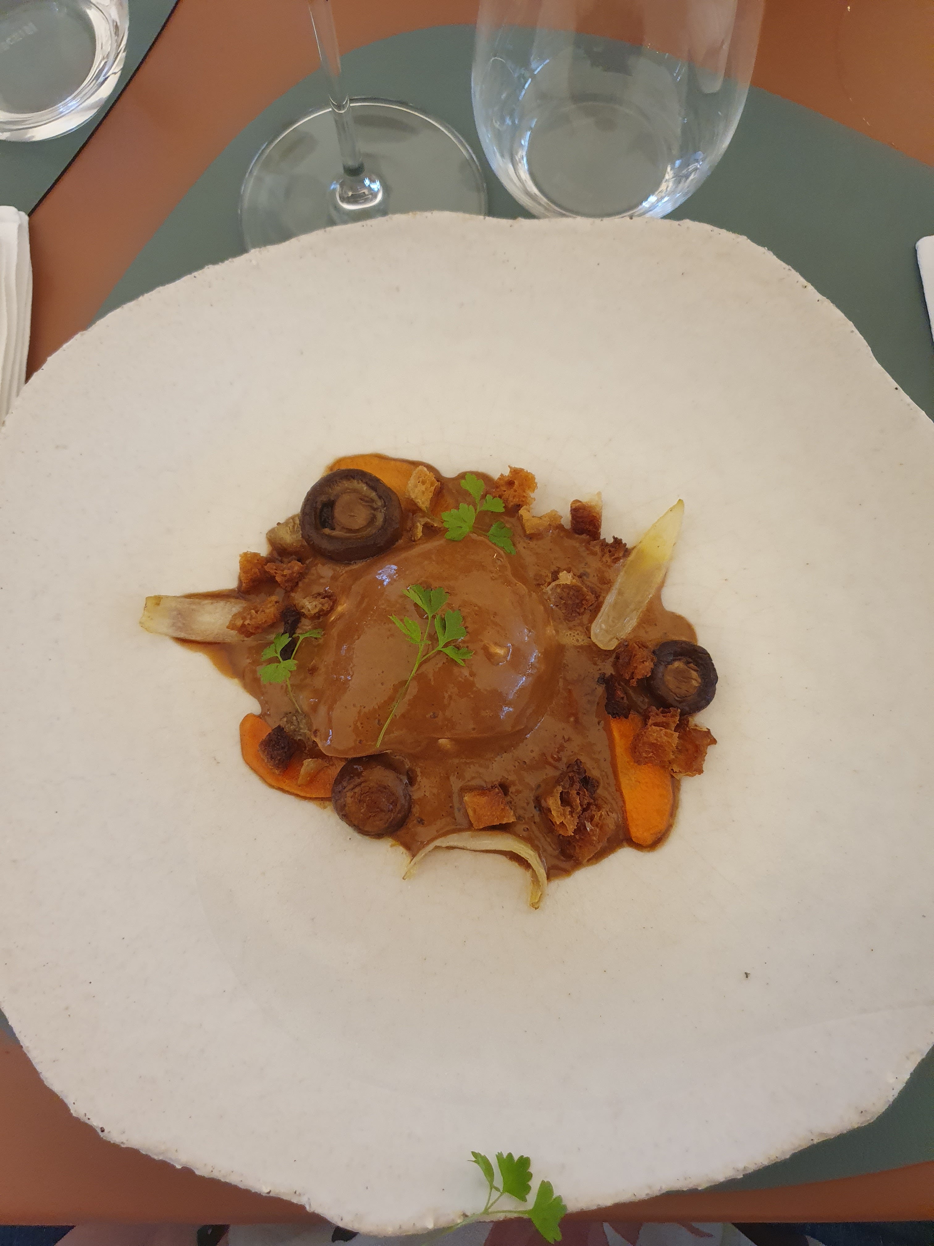 Tout est parfait! Nourriture incroyable et meilleur dessert que Lameloise. Nous avons également eu un vin brut recommandé par le sommelier, ce qui était surréaliste. Et le restaurant est frit pour animaux de compagnie, ils ont même apporté de l'eau pour Kim.