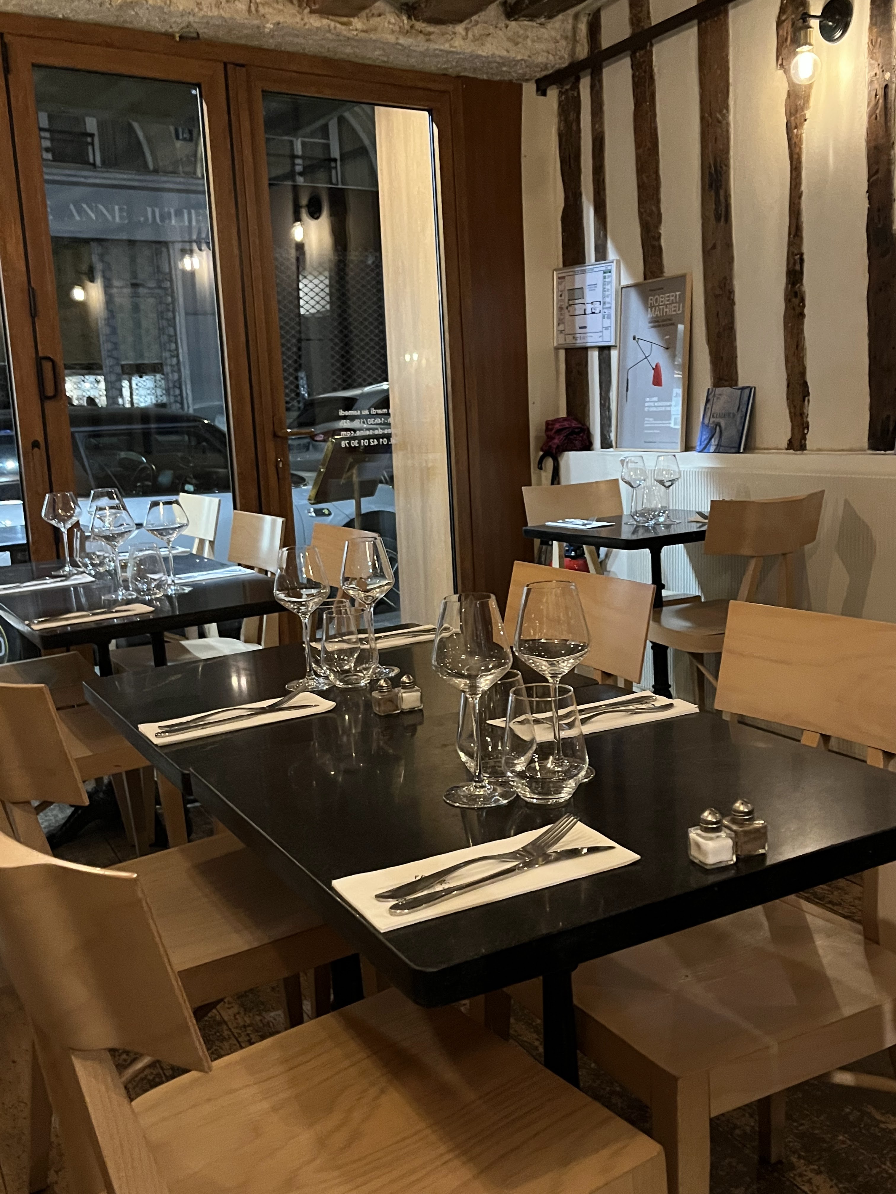 Nous sommes tombés sur ce restaurant lors d'une promenade dans la rue. Germaine et avons décidé de faire une réservation. Le restaurant est pittoresque et nous avons adoré l'atmosphère créée par ses poutres en bois fraîches et son intérieur en pierres apparentes. Nous nous considérons définitivement comme des gourmets et aimons les menus intéressants. Près de Seine n'a pas déçu. Leur menu était petit avec des options que vous ne trouverez pas ailleurs, ce qui fait que ce restaurant vaut le détour et son prix. Nous avons tous commandé quelque chose de différent et nous avons tous adoré nos repas (veau, steak et gnocchi), nos cocktails et nos desserts. La jeune femme devant la maison était si gentille et accueillante envers nous, les « Américains ennuyeux », qu'elle a rendu notre expérience encore meilleure. Nous recommandons vivement ce restaurant et le recommanderons à nos amis et à notre famille en visite à Paris. Merci d'avoir préparé un repas mémorable pour nous.