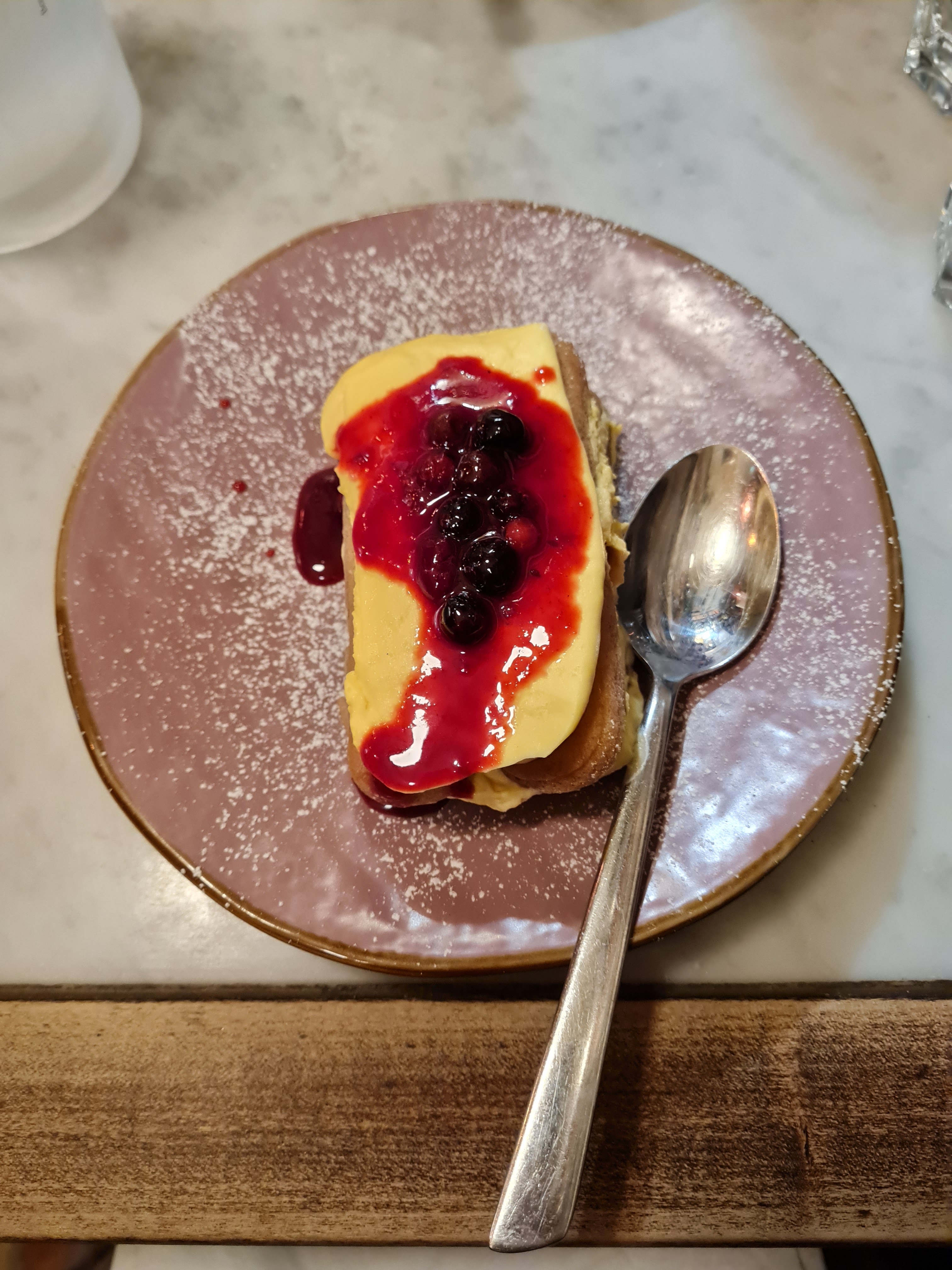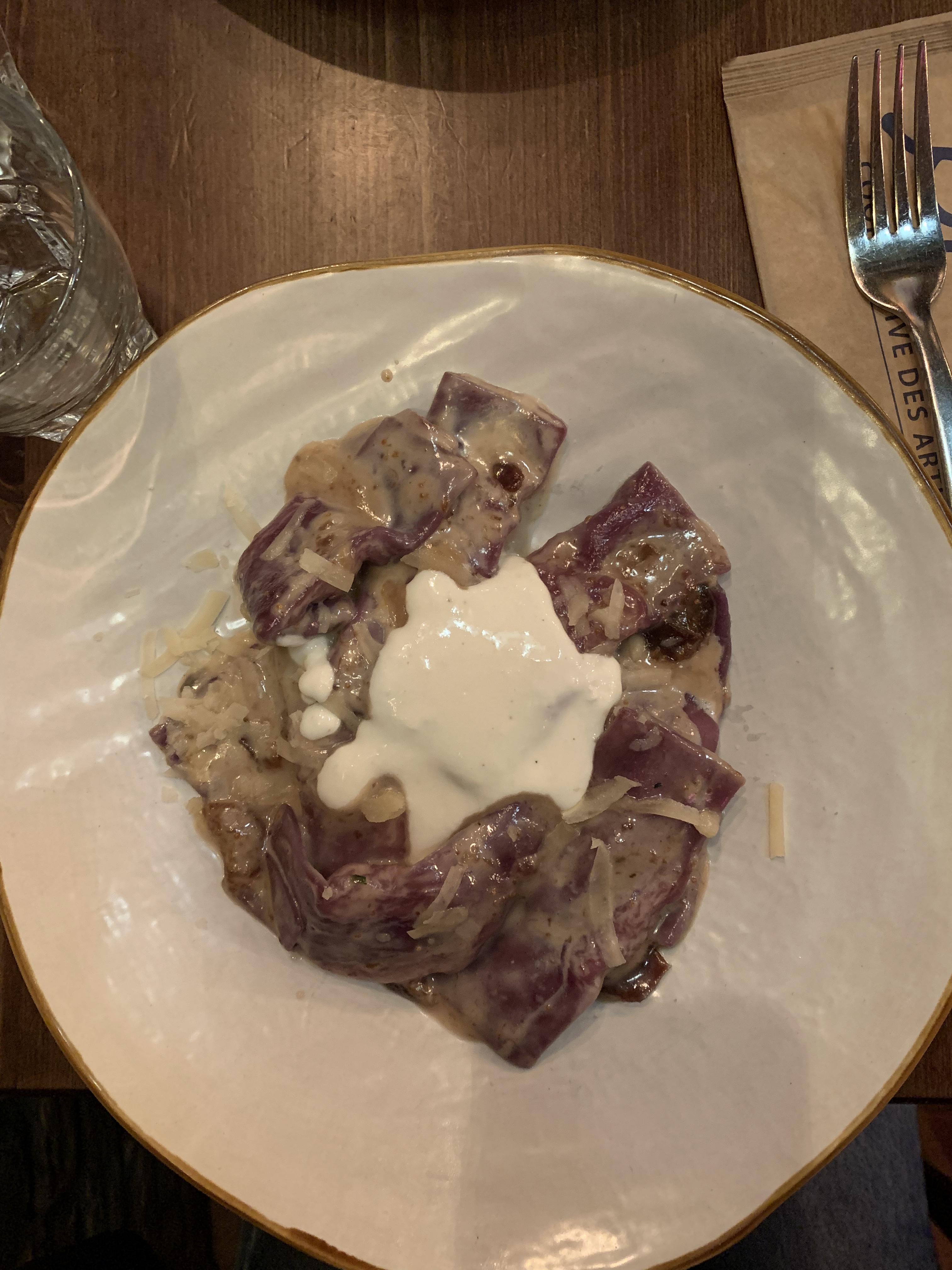 Après avoir regardé de nombreux influenceurs sur les réseaux conseillant de tester ce restaurant, je vais donc un lundi soir à 21h pour le tester. Je me fais installer sans réservation dans les 10mn après mon arrivée, on a l'impression que le restaurant est plein mais il y a une grande salle à l'étage! Je prends les raviolis aux figues: elles arrivent chaudes tout juste. Elles sont vraiment très bonnes mais pour 18 euros j'ai eu 9 raviolis... même s'ils ne sont pas petits j'ai trouvé cela très peu généreux surtout pour le prix et pourtant je suis une femme donc j'imagine un homme avec un bon appétit, je pense qu'il peut en prendre 2 ou 3 comme ça. Après la qualité est là, la cuisson était vraiment al dente parfaitement et le goût était là. Je ne pense pas y retourner cependant. Mention spéciale pour les toilettes magnifiques!