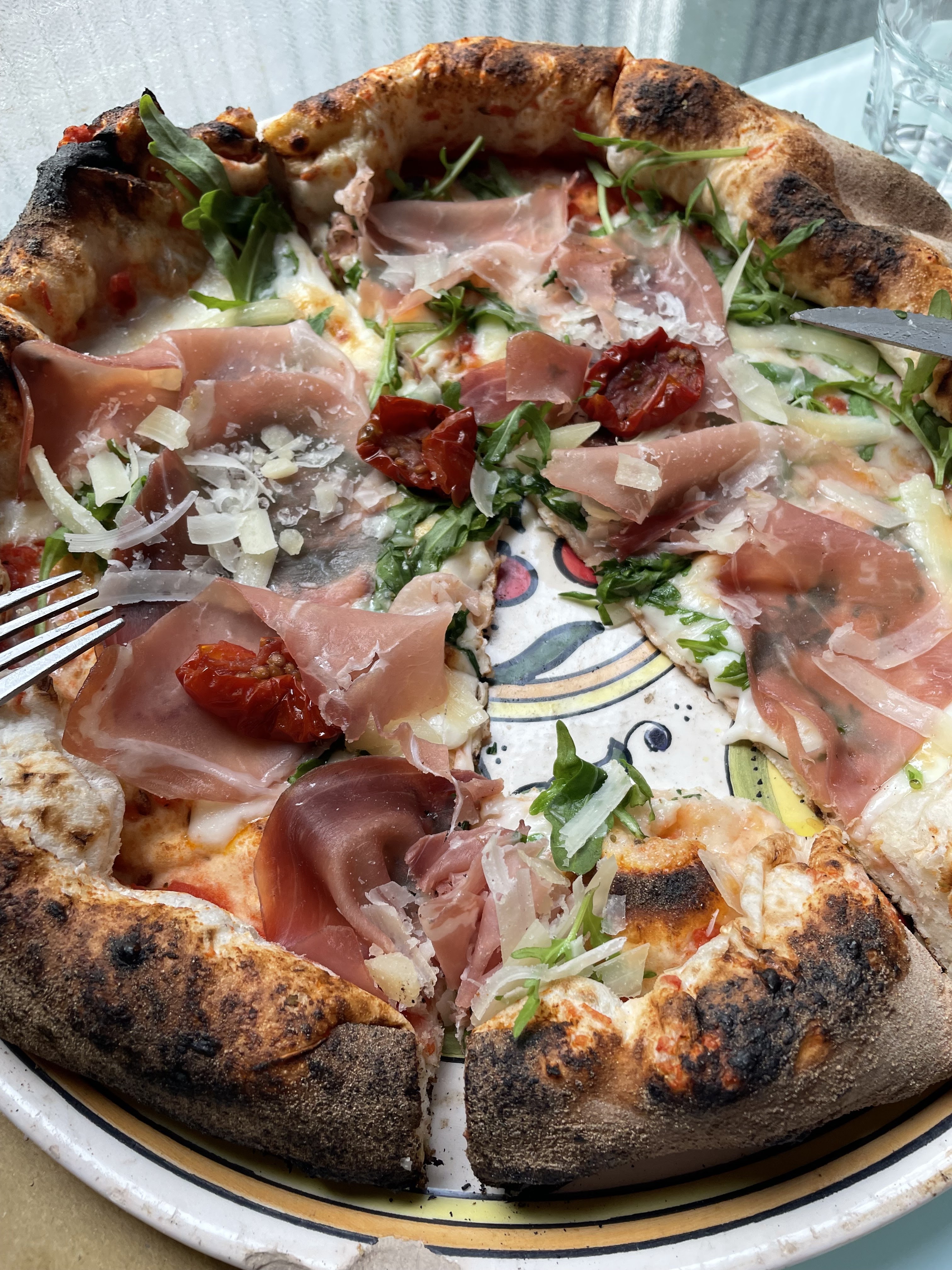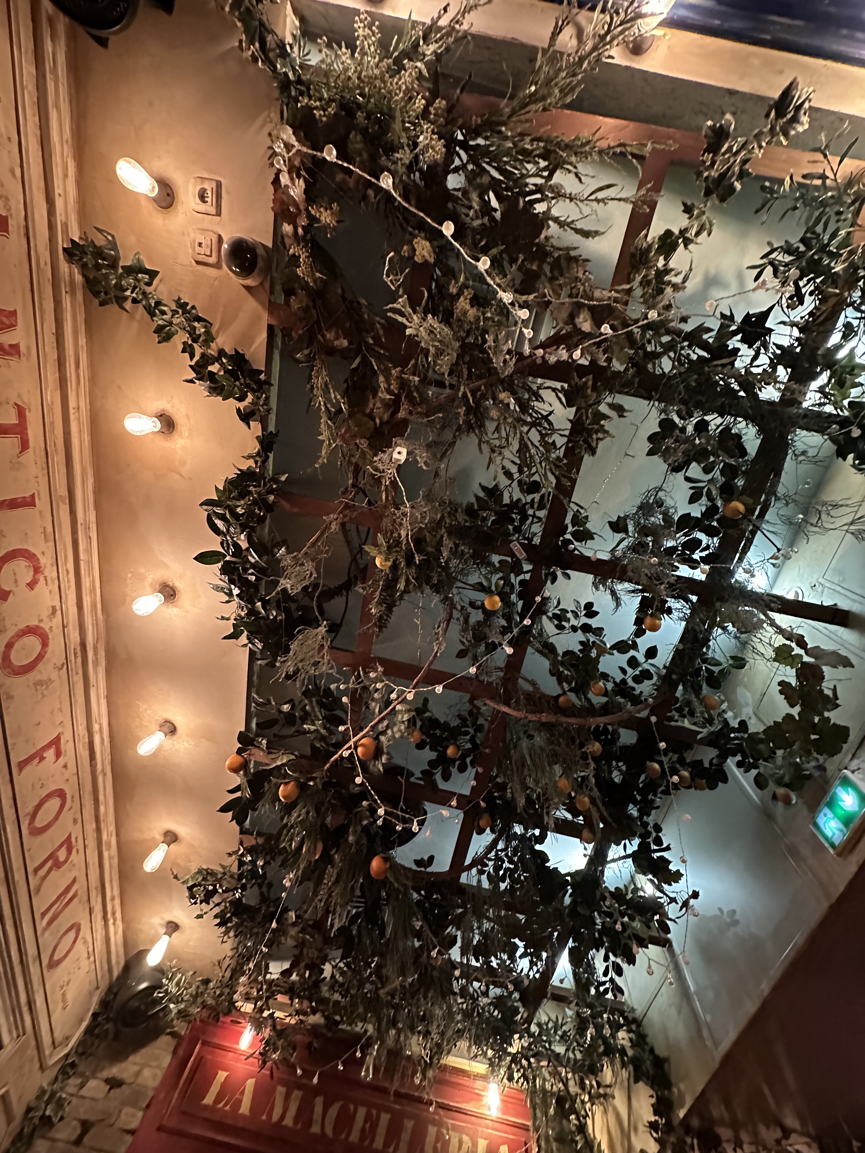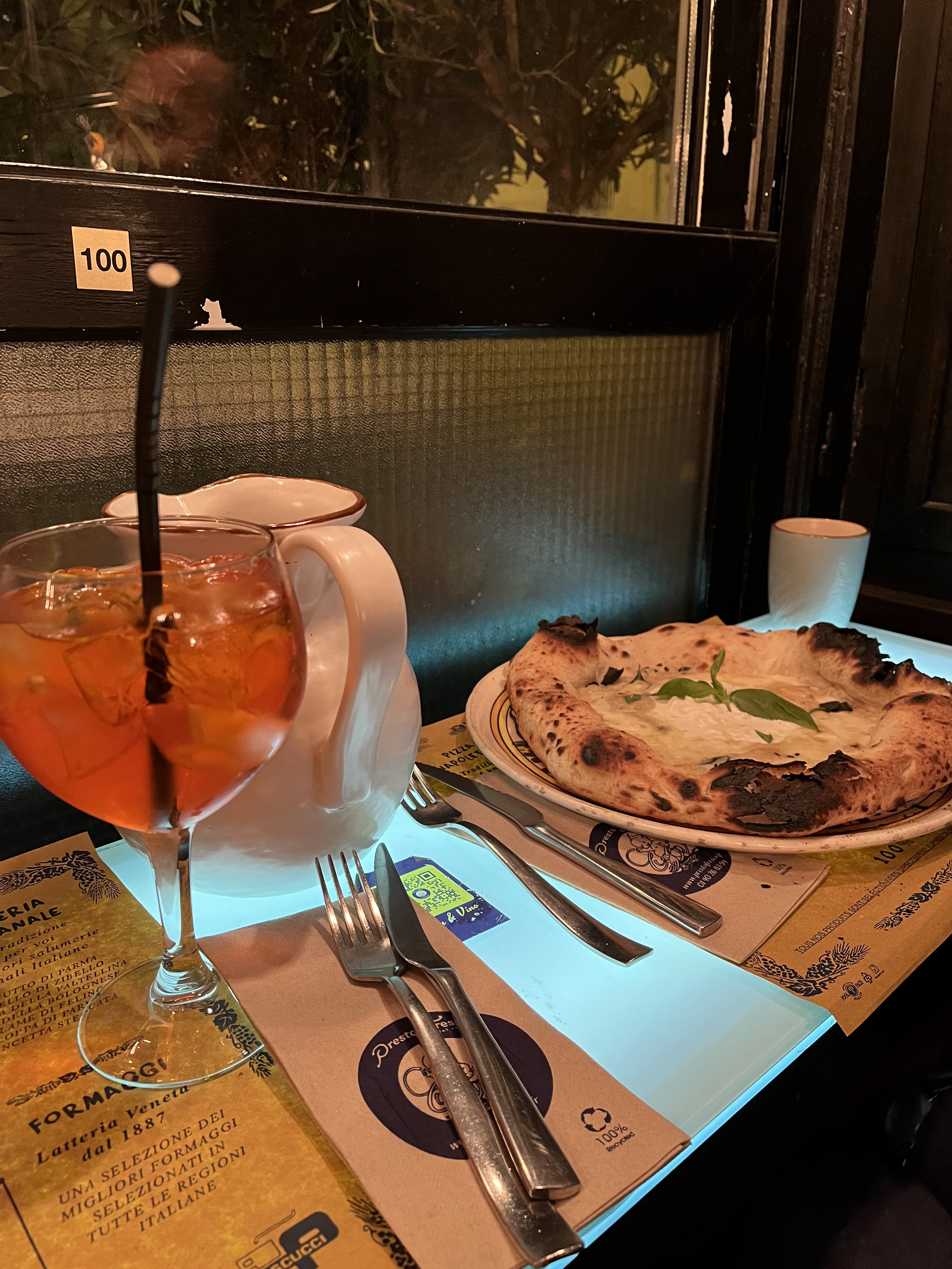C'était mon dernier restaurant post confinement. J'en gardais un souvenir festif et heureux. L'endroit reste atypique, et magnifique : les plafonds décorés par des rideaux de piments et d'ail, la charpente apparente, la vitrine avec les produits locaux qui nous fait de l'œil... La carte est large. On opte pour des pizzas et des Spritz. A peine installée, j'ai à peine le temps de revenir du toilette, que les pizzas arrivent en 3 minutes comme si elles avaient été préparé en un claquement de doigts. La rapidité c'est bien mais on sent qu'on n'a pas le temps sur place : une table en enchaîne une autre. Le service se divise entre chefs de rangs et runners pour aller encore plus vite. C'est une vraie fourmilière. Les pizzas étaient bonnes, la pâte surtout. Les Spritz pas dingues. Le moment était court, correct, mais pas exceptionnel. Je pense qu'il y a mieux pour profiter d'un restaurant italien sur Paris, où on prendra le temps d'apprécier.