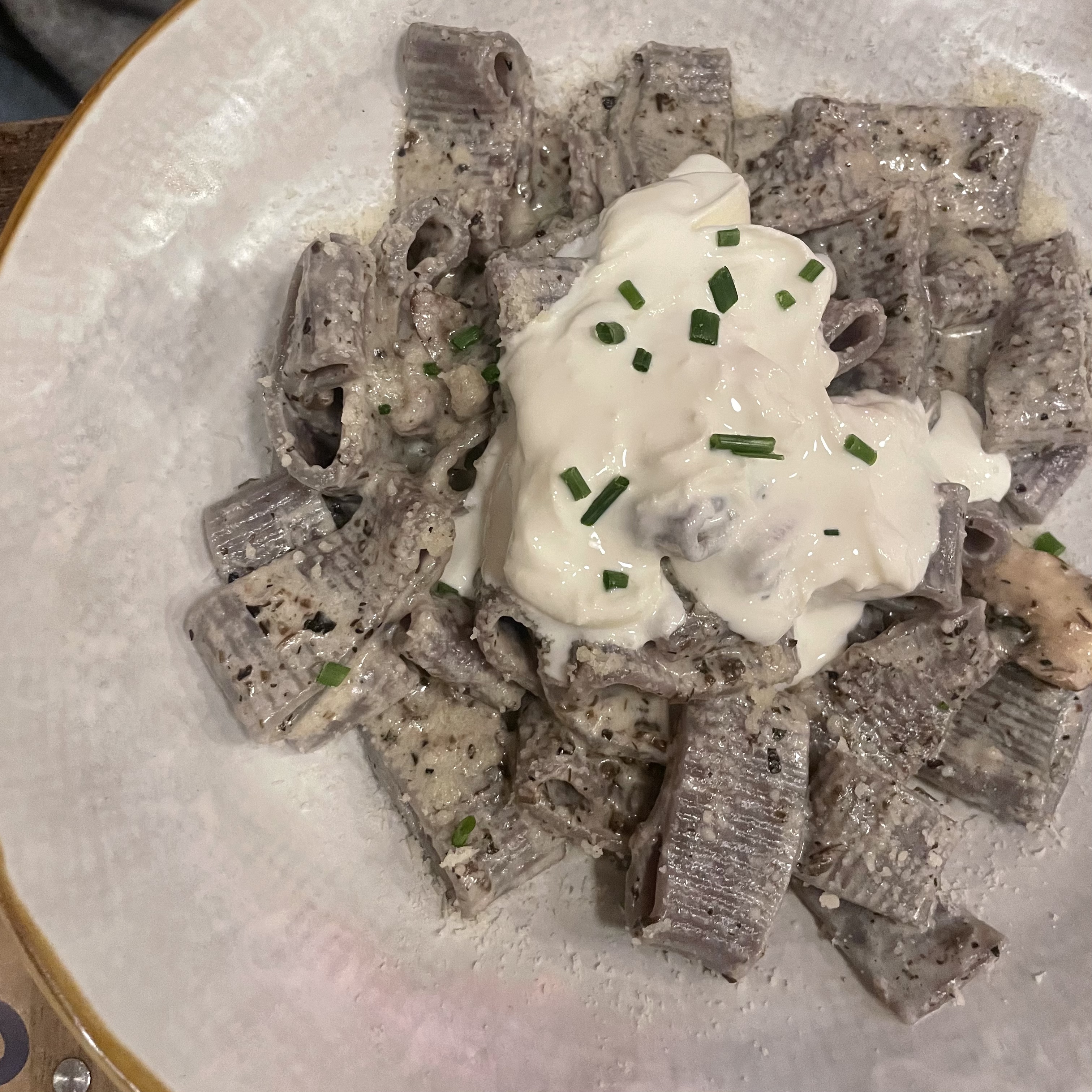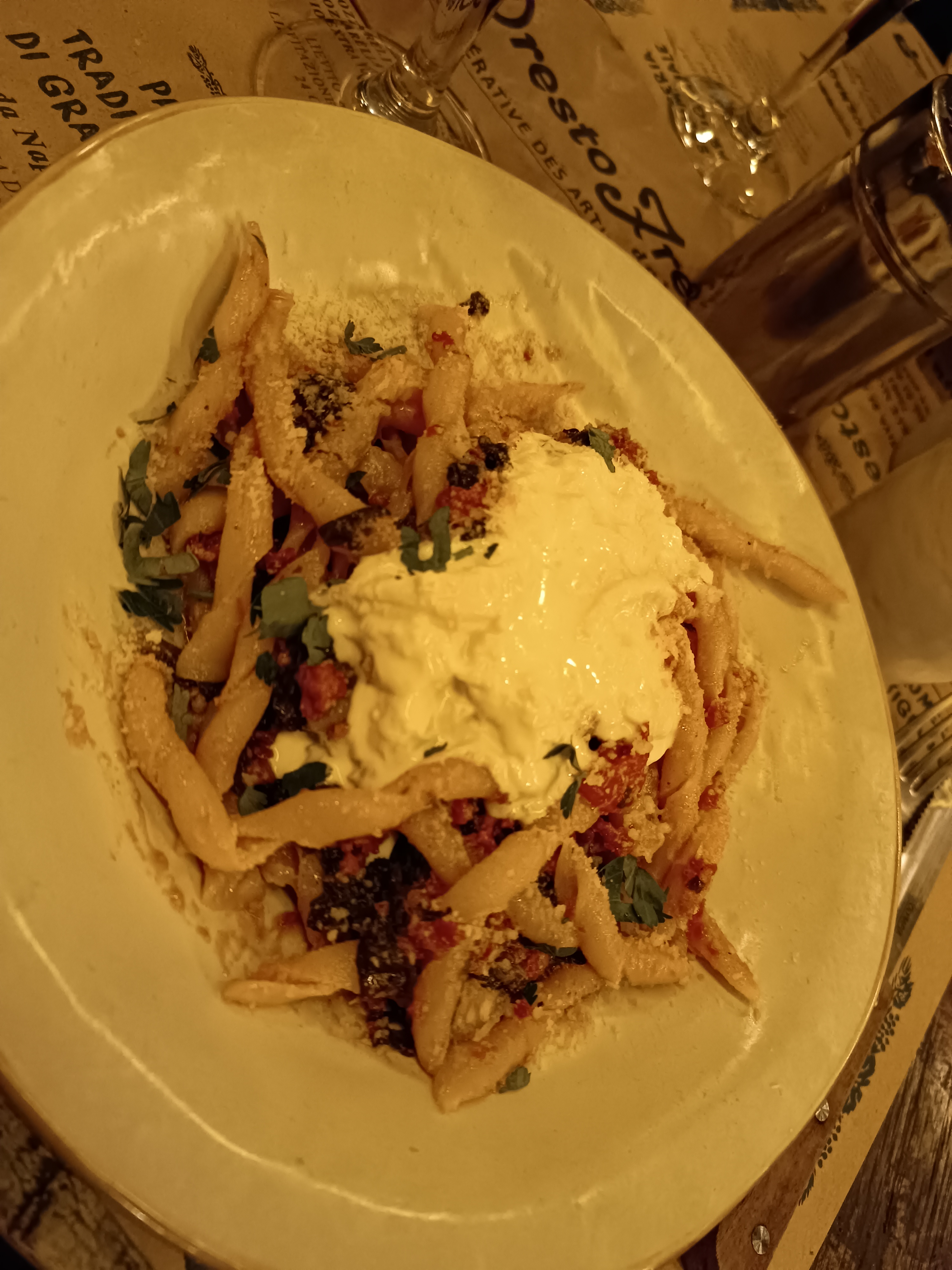 Arrivés pour le dernier service un vendredi soir, carte très alléchante, prix un peu élevé mais surement le prix de bons produits ! Nous avons pris les Raviolis buttafuoco et Calamarata tartufo, c’était très bon ! Malheureusement, on aurait bien pris des desserts mais après 20 minutes d’attente a la fin des plats personne n’est venu nous proposer d’en prendre un, et quand nous avons enfin eu la serveuse il était trop tard.. mais surement dû a la fin du service :)