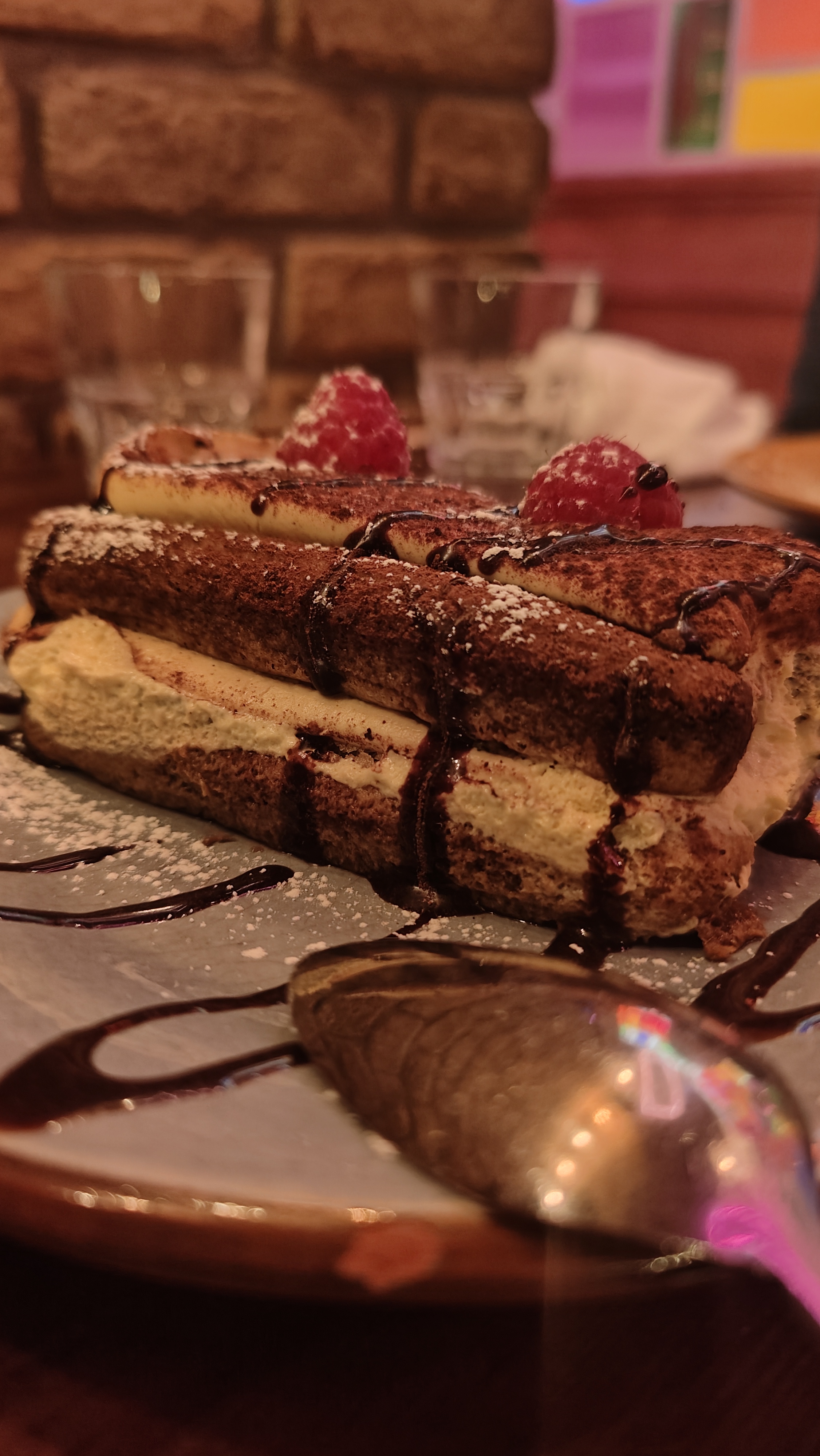 Le lieu est très bien décoré! J’ai bien aimé les piments suspendus au plafond. La nourriture était très très bonne également. J’ai pris une pizza 4 fromages supplément jambon de parme et je me suis régalée. Pareil pour la pizza à la truffe de mon amie. En dessert, nous avons pris les profiteroles à la pistache et un tiramisu. C’était excellent … les profiteroles était ouffisime et le tiramisu très fin aussi. Attention cependant on sent bien le café donc il faut aimer ça !