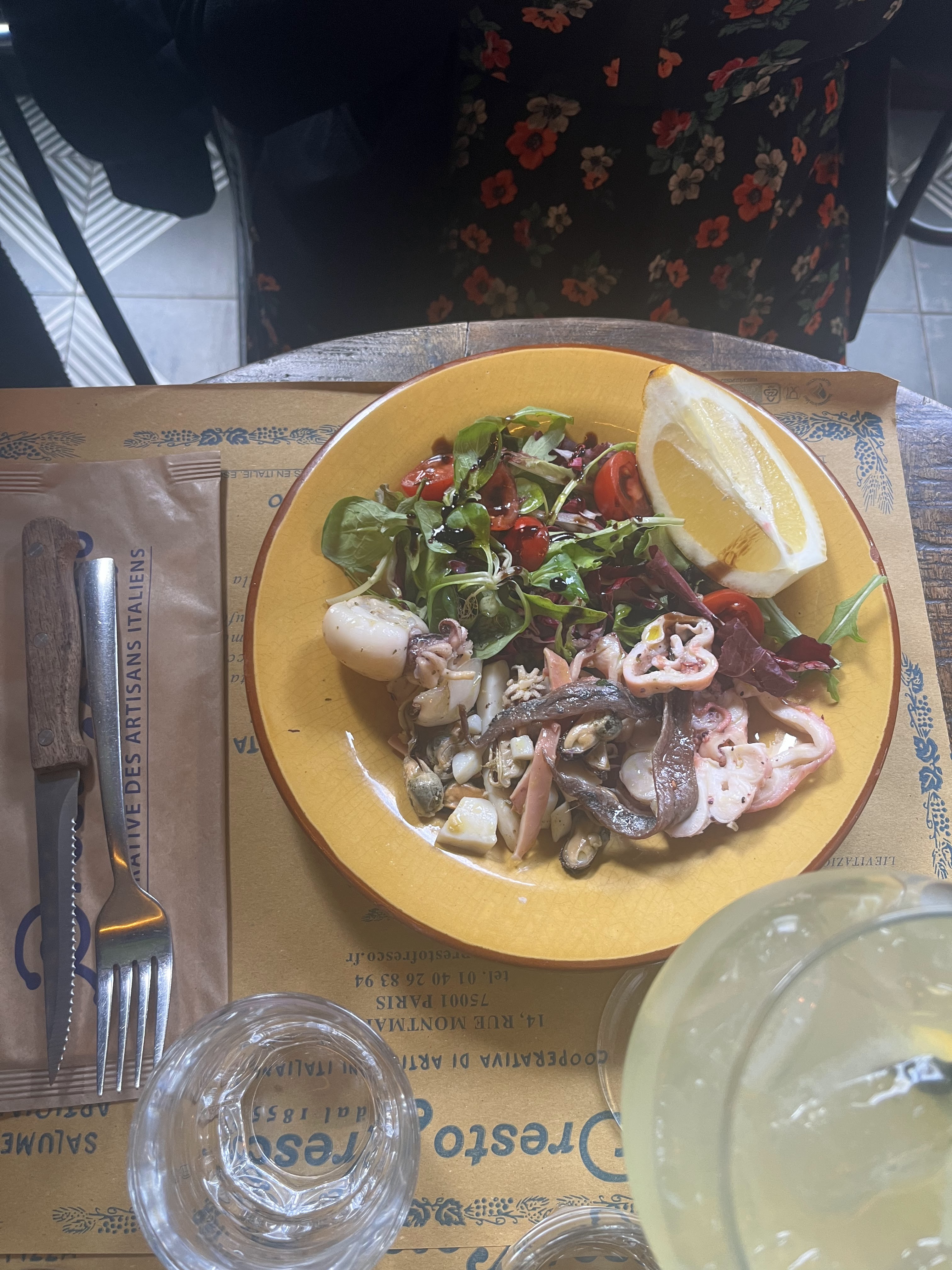 Très bonne adresse, belle décoration, les plats sont bons. Néanmoins, le service est à améliorer peut-être car c’est un peu long (pas la préparation mais la prise de commande etc) et on aurait voulu être informé des plats du jour. Pour la nourriture, on a prit une entrée fruits de mer, perso je suis pas fan mais c’est pas mal. Les pâtes étaient pas mal aussi et la tiramisu était trop bonne. Mais, la pépite c’était la pizza La Salmone, j’ai adoré 🤌🏻 bien garnie avec du saumon fumé, la burrata, le vinaigre balsamique, les tomates cerise, et de la roquette. Le mélange de saveur est juste top 🤤 Un autre petit bémol, c’est le fait qu’on été serré à l’autre table et au comptoir mais bon c’est ✨Paris✨😅🤷🏻♀️