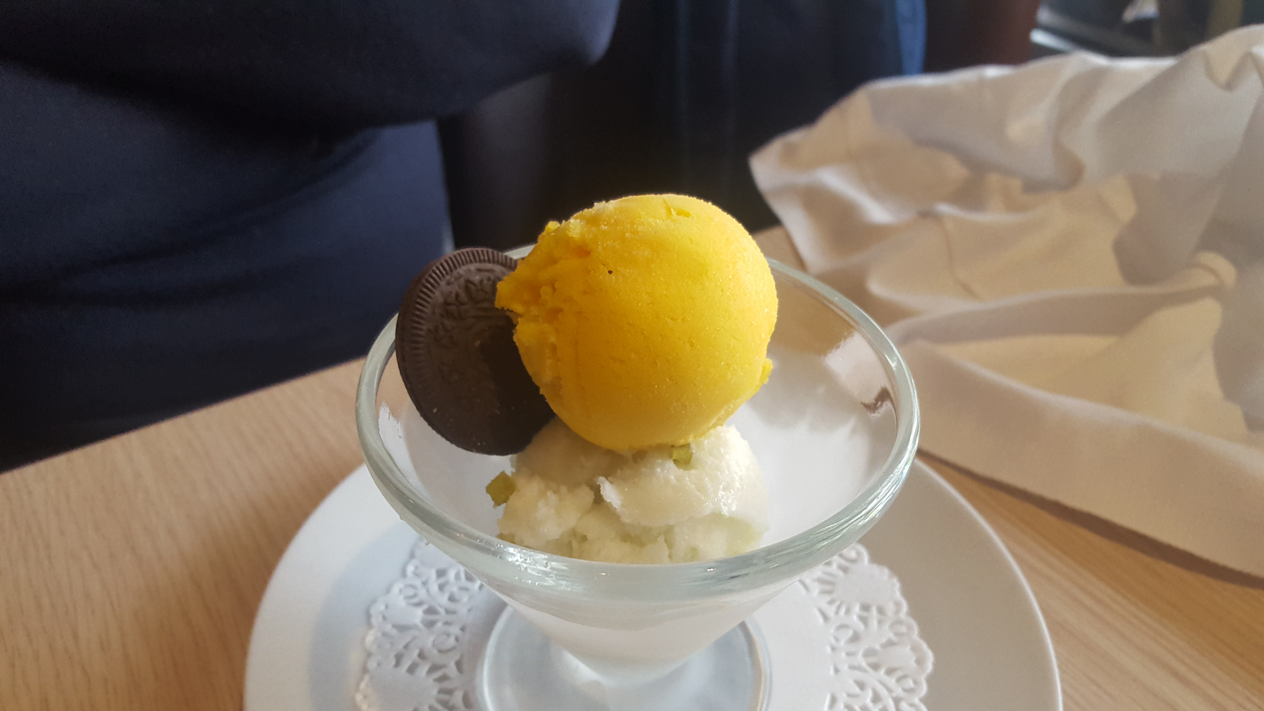 Excellente nourriture. Bon prix. Faire le ménage. Ils avaient un ventilateur, ce qui était bien car il faisait très chaud. Les sièges étaient à l'étroit. Quelqu'un à la table à côté de nous a renversé son champagne et il a atterri sur mon pied et ma jambe. Les tables ne devraient jamais être aussi rapprochées. Sinon, c'était un bon restaurant.