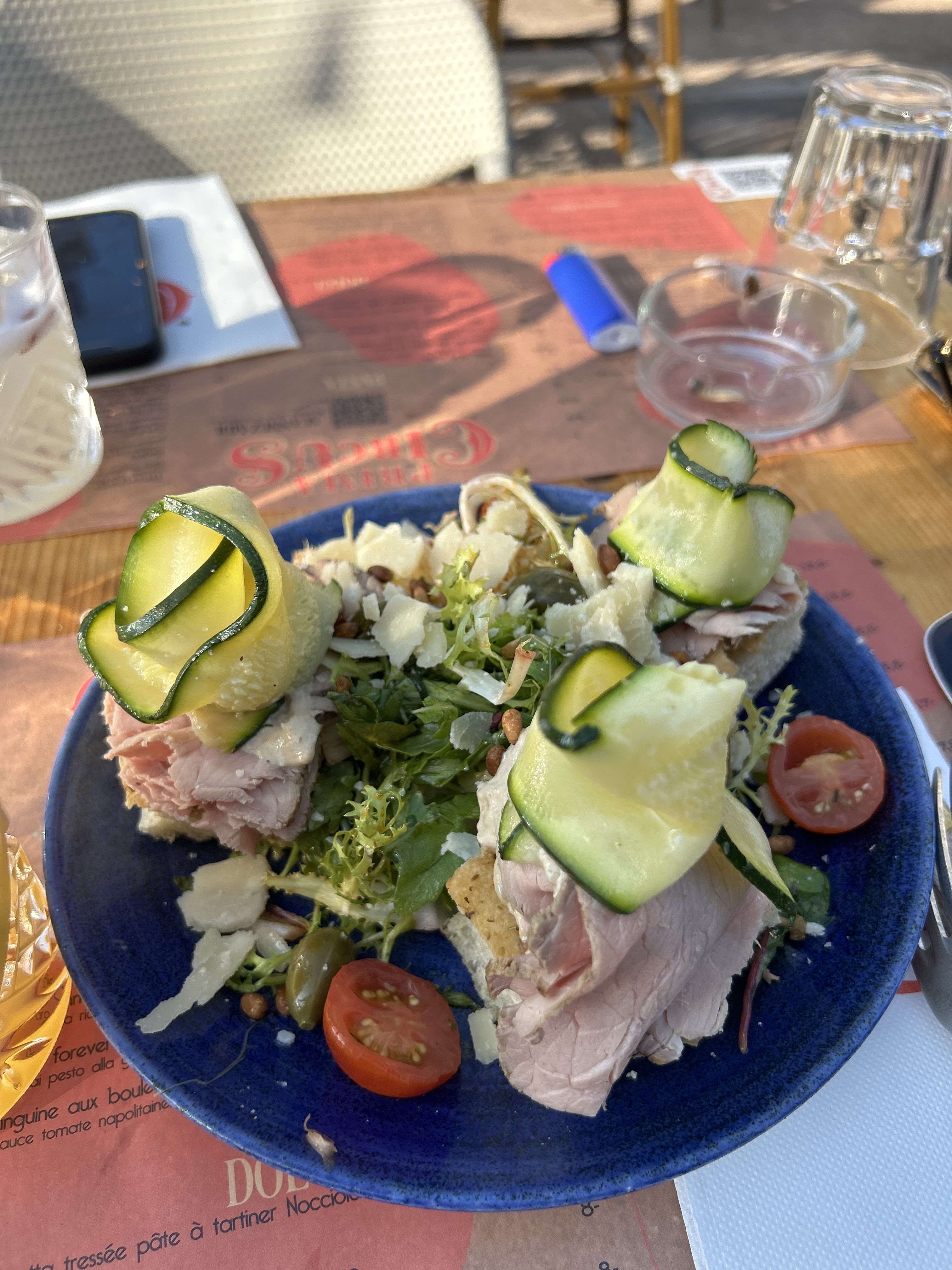 Nous sommes arrivées à 14h30, les cuisines fermaient à 15h, mais nous avons été accueillies avec bonne humeur 🙂. La salade caesar était délicieuse et vraiment copieuse. Nous avons mangé en terrasse, bien abritées sous de grands parasols. Les prix sont corrects pour la quantité et la qualité. C'est sûr nous y reviendrons.