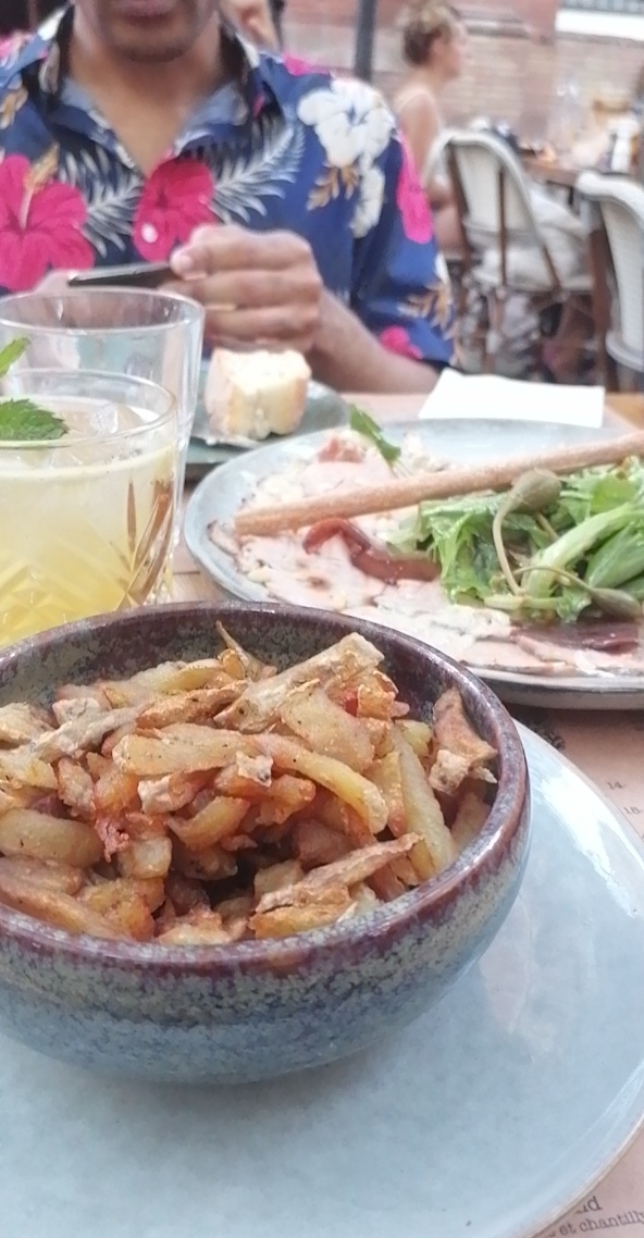 Nous avons dîné en terrasse sur la place de la bourse. Place un peu bruyante du au passage des voitures. Mais vite oublié par la bonne humeur du serveur que nous avons eu. Un vrai moment de rigolade, ça fait du bien au moral. Les plats sont servis de manière originale et copieusement. Le carpaccio est bon et les frites succulentes. Nous avons eu droit a un p'tit digestif offert, que demander de plus. Je recommande. Attention vite complet et pas de réservation possible.