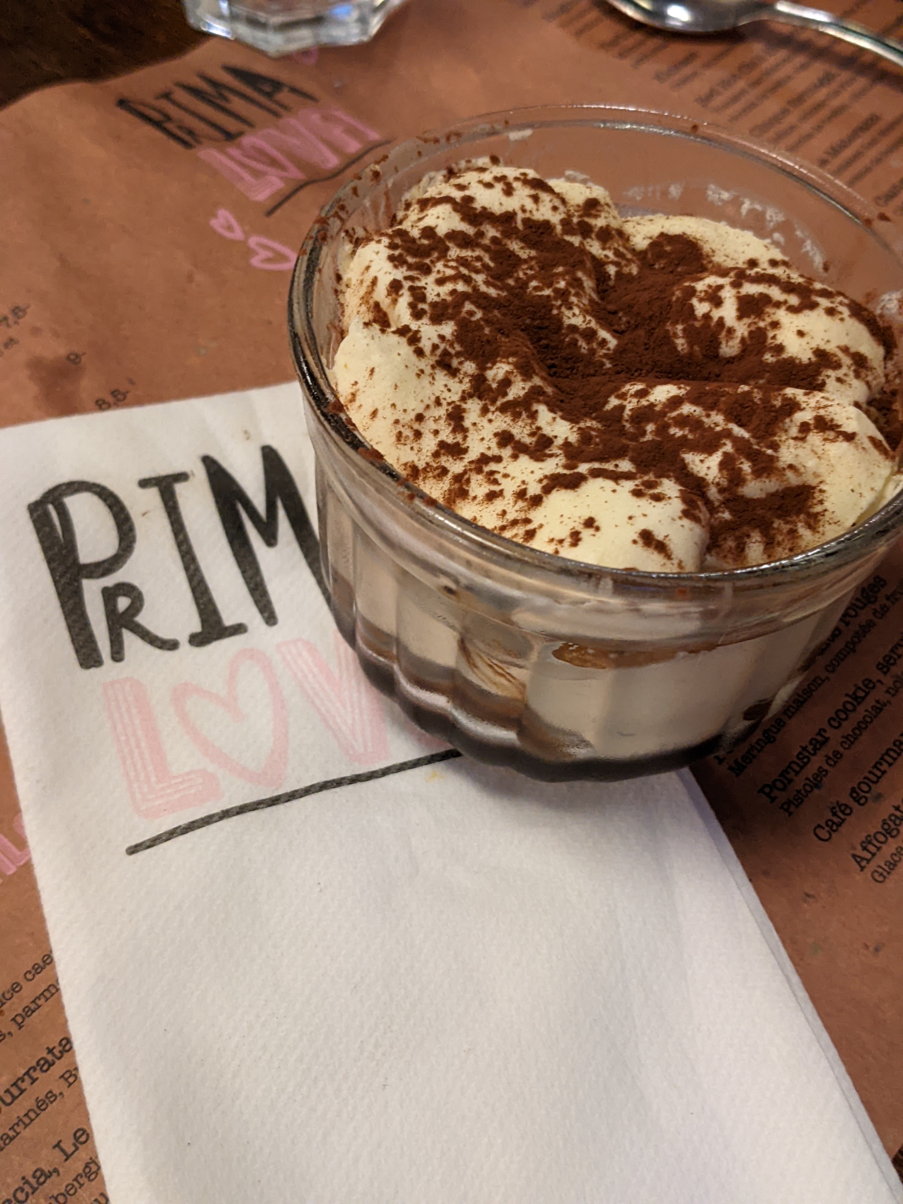 Un accueil enjoué et agréable vous plonge dans la superbe ambiance de Prima Lova. En intérieur ou en terrasse, l'atmosphère est chaleureuse et branchée. Les plats et desserts sont excellents et généreux, de quoi rassasier les plus gourmands. Malgré tout, l'attente se fait quelque fois ressentir et les speechs répétés d'une table à l'autre dévoilent une mécanique bien rodée qui amenuise le charme du contact humain.