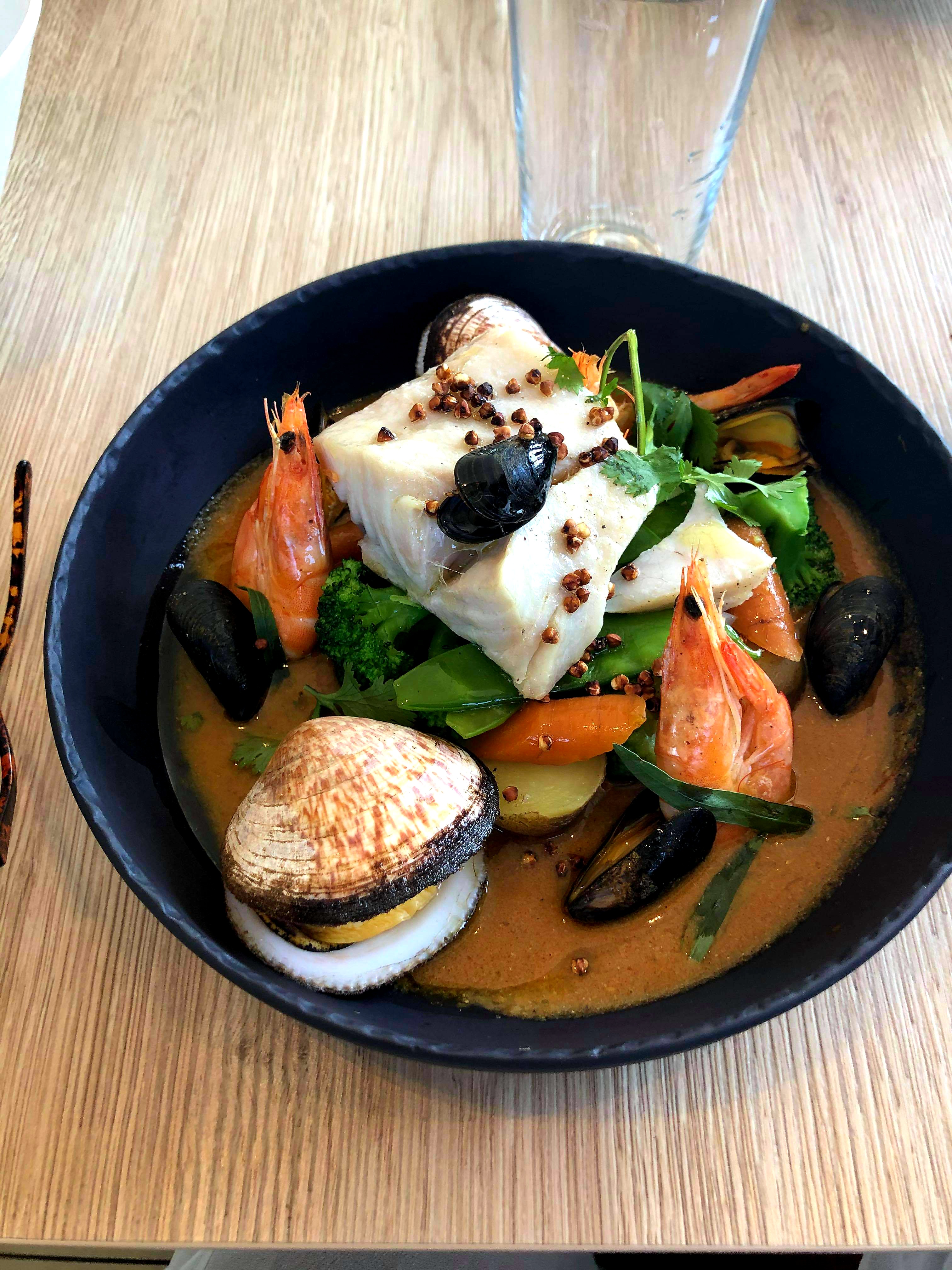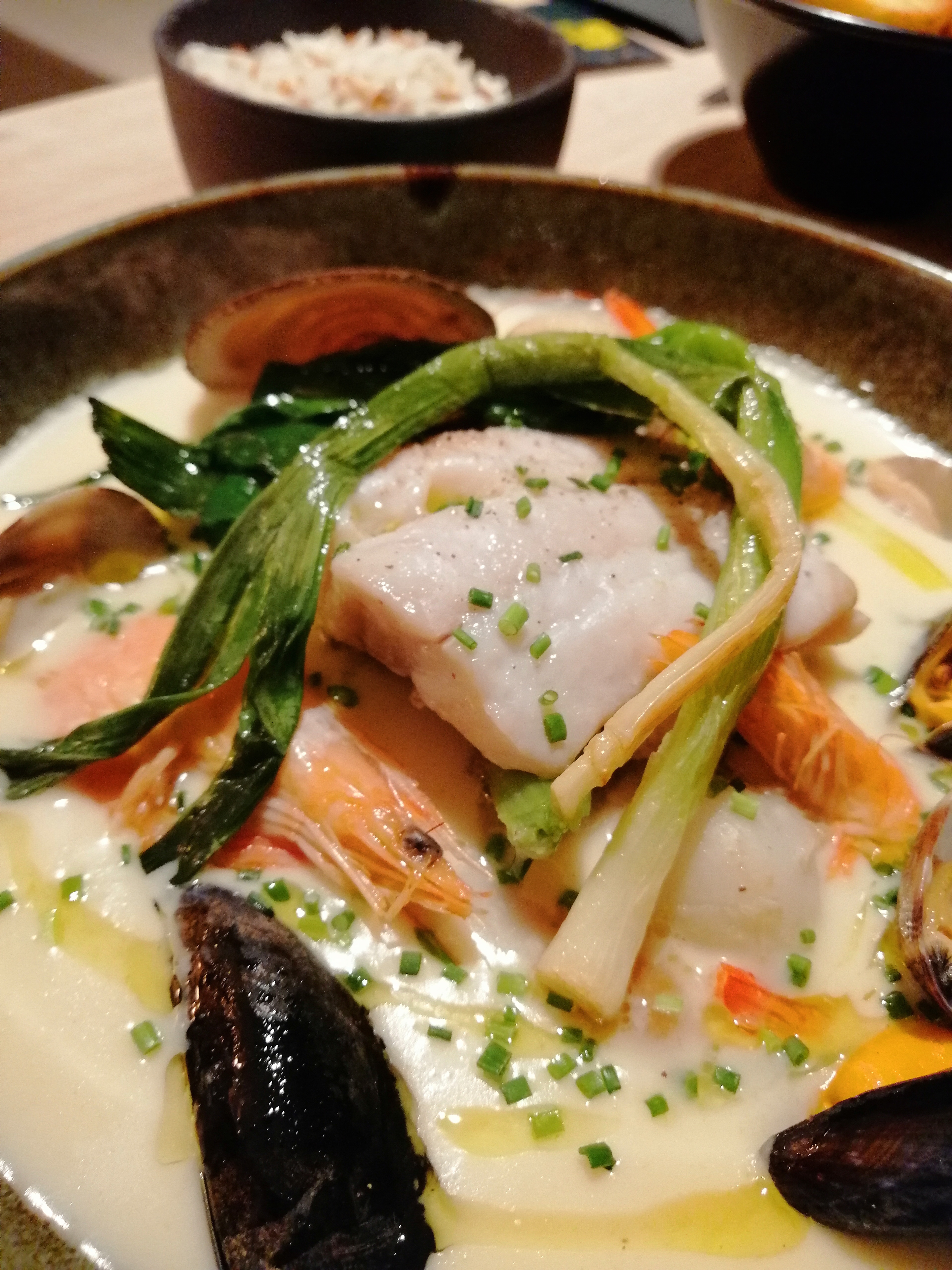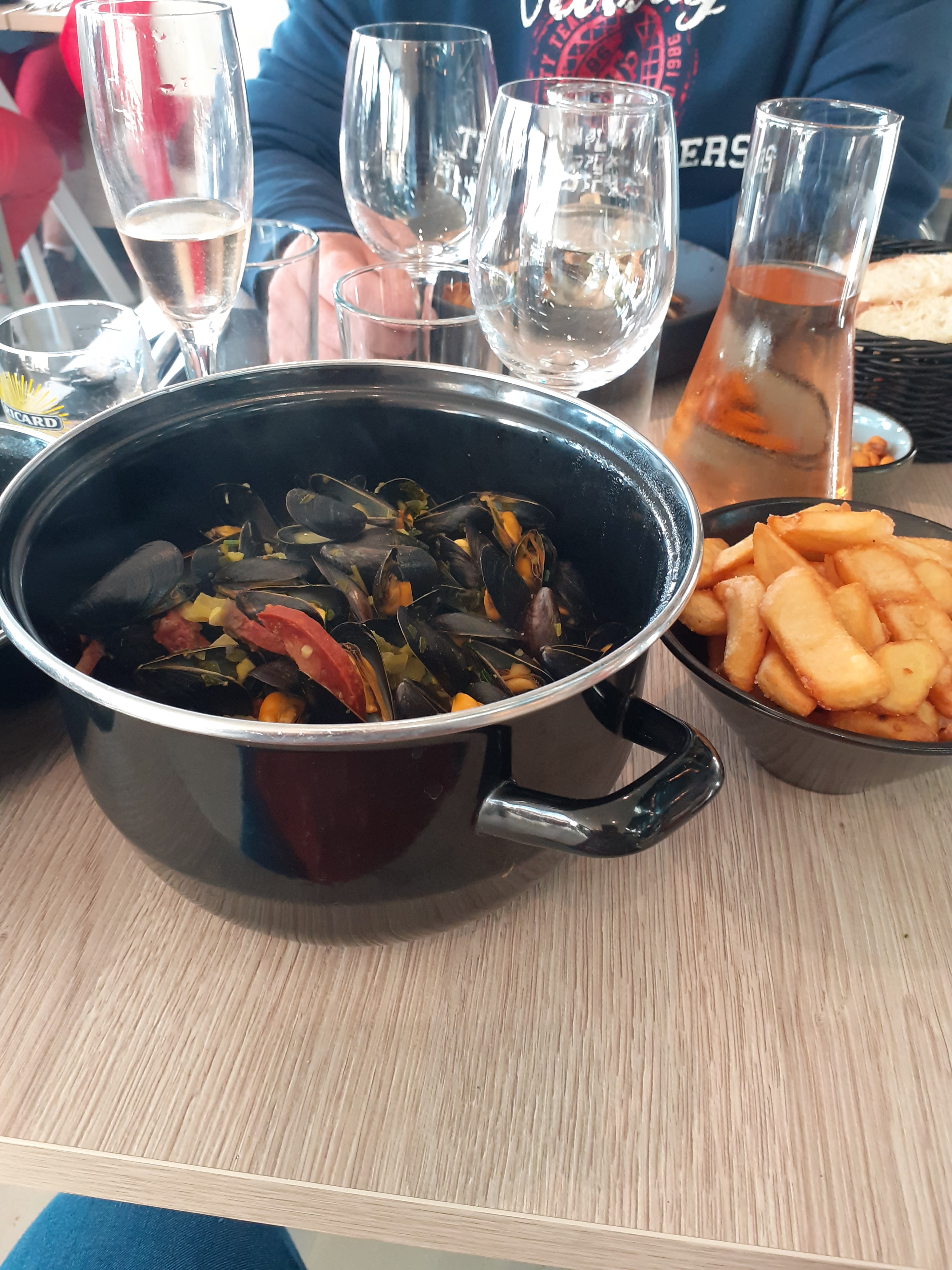 Nous sommes venus pour la troisième fois. Jamais déçus jusque là, mais aujourd’hui, pain pas frais (soit disant car beaucoup de monde aujourd’hui, donc pain réchauffé, nous sommes samedi soir, il fait beau, le monde au restaurant était prévisible) tataki très salé, peu de palourdes pour le prix, moules petites, sauce curry coco franchement décevante et frites surgelées….