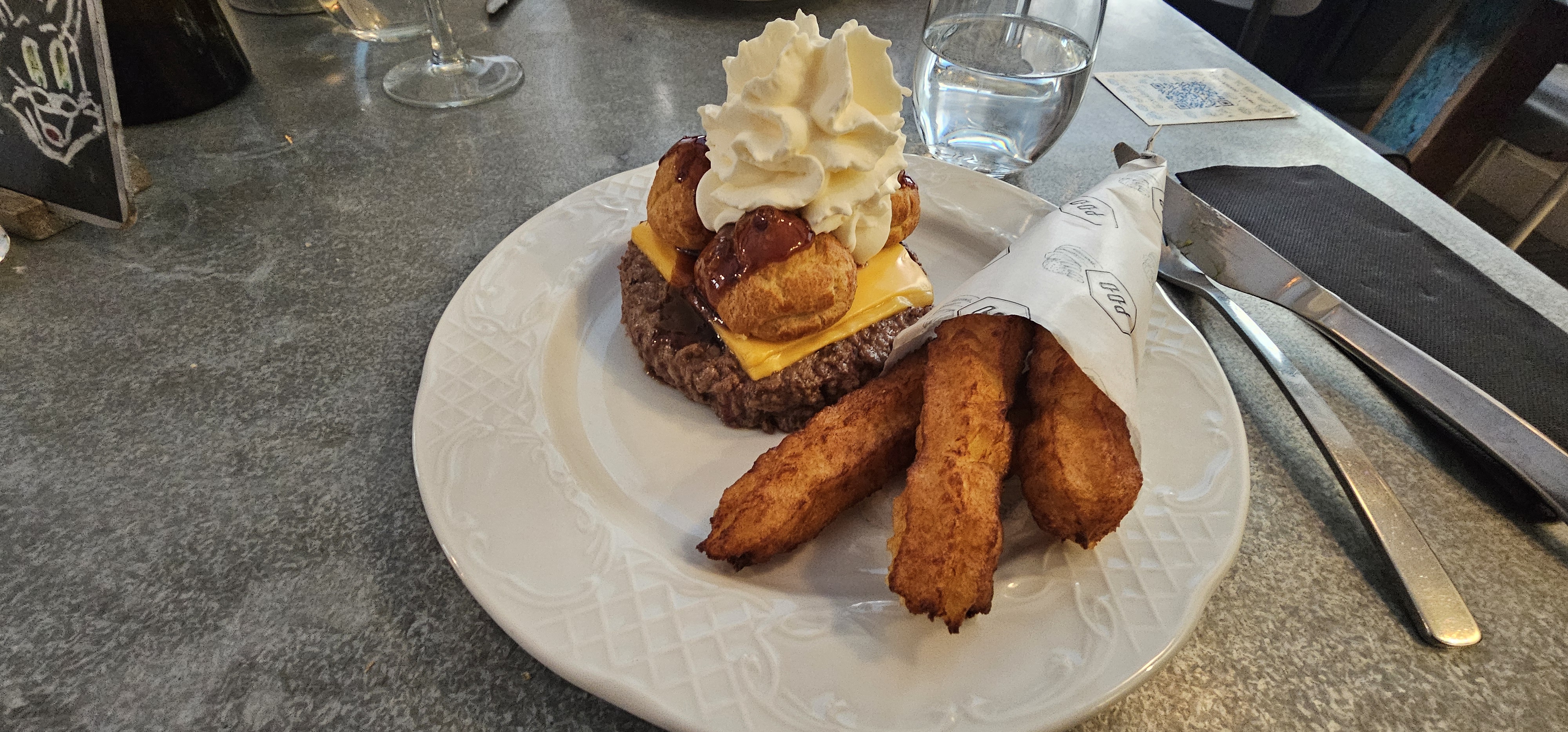 Un établissement que je recommande!!! En résumé, à tester !!! N’hésitez pas ! Un concept étonnant, une cuisine travaillée, une atmosphère accueillante, un service aux petits soins. Le concept est original, je ne m’attendais pas à ces dressages. En effet, on y croirait ! Pour ce qui est des plats, j’ai commandé un New York Roll en entrée (au saumon fumé, parsemé d’éclats de pistache). La garniture était bonne. Et la pâte également, croustillante! Le plat, j’ai pris le saint honoré (hamburger revisité), les produits étaient bon. Juste (mais c’est une question de goût) je n’ai pas aimé la chantilly de cheddar et les churros de patates douce. Et en dessert, j’ai pu manger une éponge… Mais une très bonne éponge ! Et son liquide vaisselle senteur orange passion !!