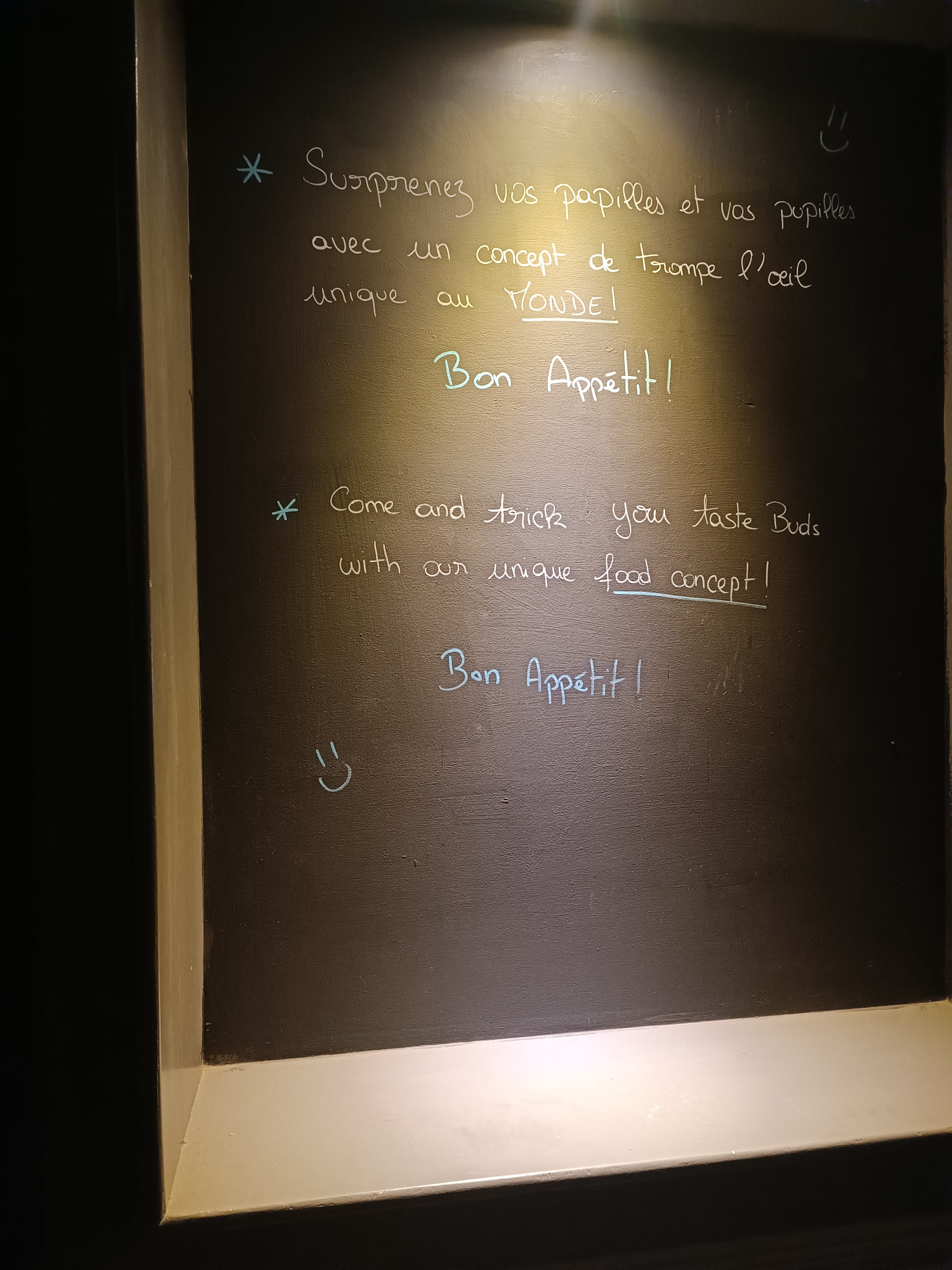 Comme prévu très troublant, l'effet trompe l'oeil fonctionne très bien, bluffant. Belle expérience culinaire. Le personnel était au top, très convivial, un moment de partage très agréable. A très bientôt. Pierre