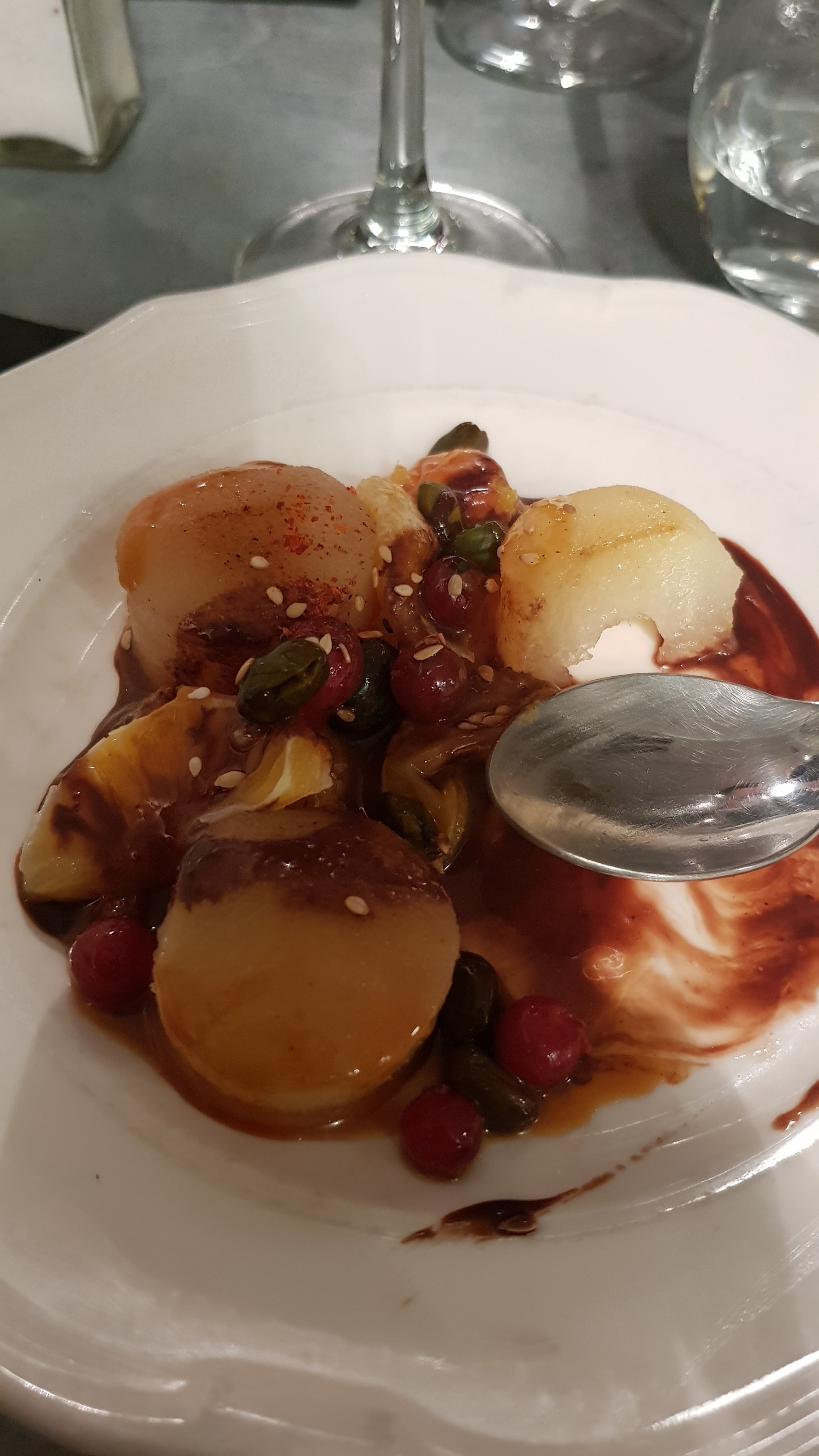 Accueil gentil, salle pleine à craquer (d'où un niveau sonore très élevé). Ça faisait un moment que j'avais envie d'essayer ce concept, et je craignais la grosse arnaque bobo... Il n'en est rien. C'est vraiment très bon. En prime, ma coquille St Jacques pourrait être la grande soeur parisienne pâtissière d'une petite coquille St Jacques vendue à Erquy chez un confiseur. Très bon concept
