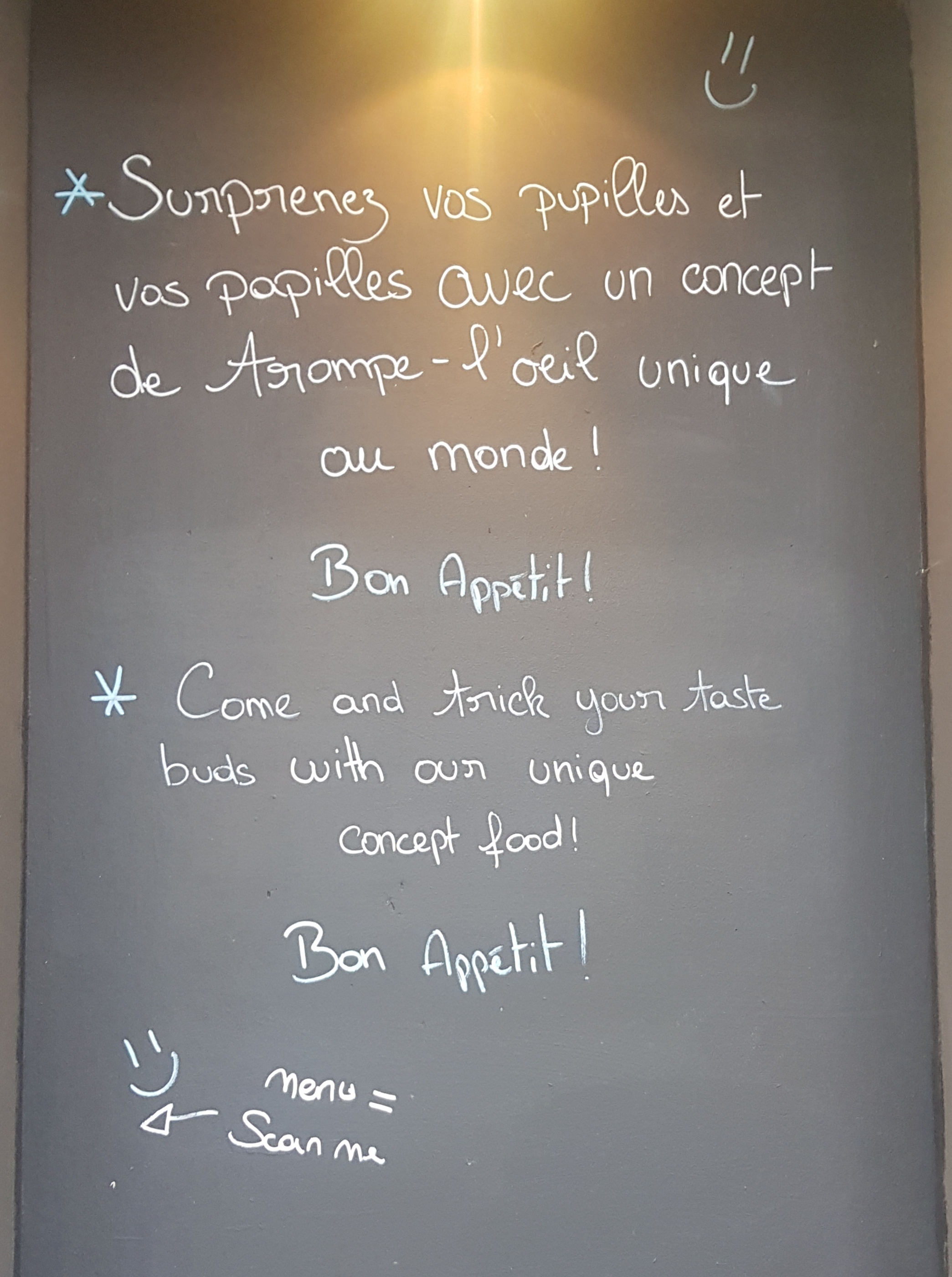 L'expérience était tentante ! Toutefois, nous sommes sorties assez mitigées de ce restaurant. En effet, même si l'effet illusion optique est fort ludique et réellement amusant, les plats manquaient de saveur. Une fois la stupéfaction rigolote de la présentation, le soufflet retombe. Absolument rien d'exceptionnel en bouche. Le risotto était fade, et le steak mal saisi. De plus, nous notons l'absence de décoration du restaurant. Le lieu est censé être plutôt conceptuel, et l'intérieur présente une déco assez froide, pas du tout cohérente. Pour ces prix, et ce concept, nous aurions apprécié un peu plus de cohérence entre la cuisine et l'univers décoratif. Cela renforce notre sentiment d'over-hyped. Toutefois, en terme de service, le personnel est très agréable, souriant. Le fait d'écrire sur des petites ardoises le nom de chaque client pour les réservations est très mignon. Si cette chaleur pouvait se retrouver dans la décoration ! 3/5