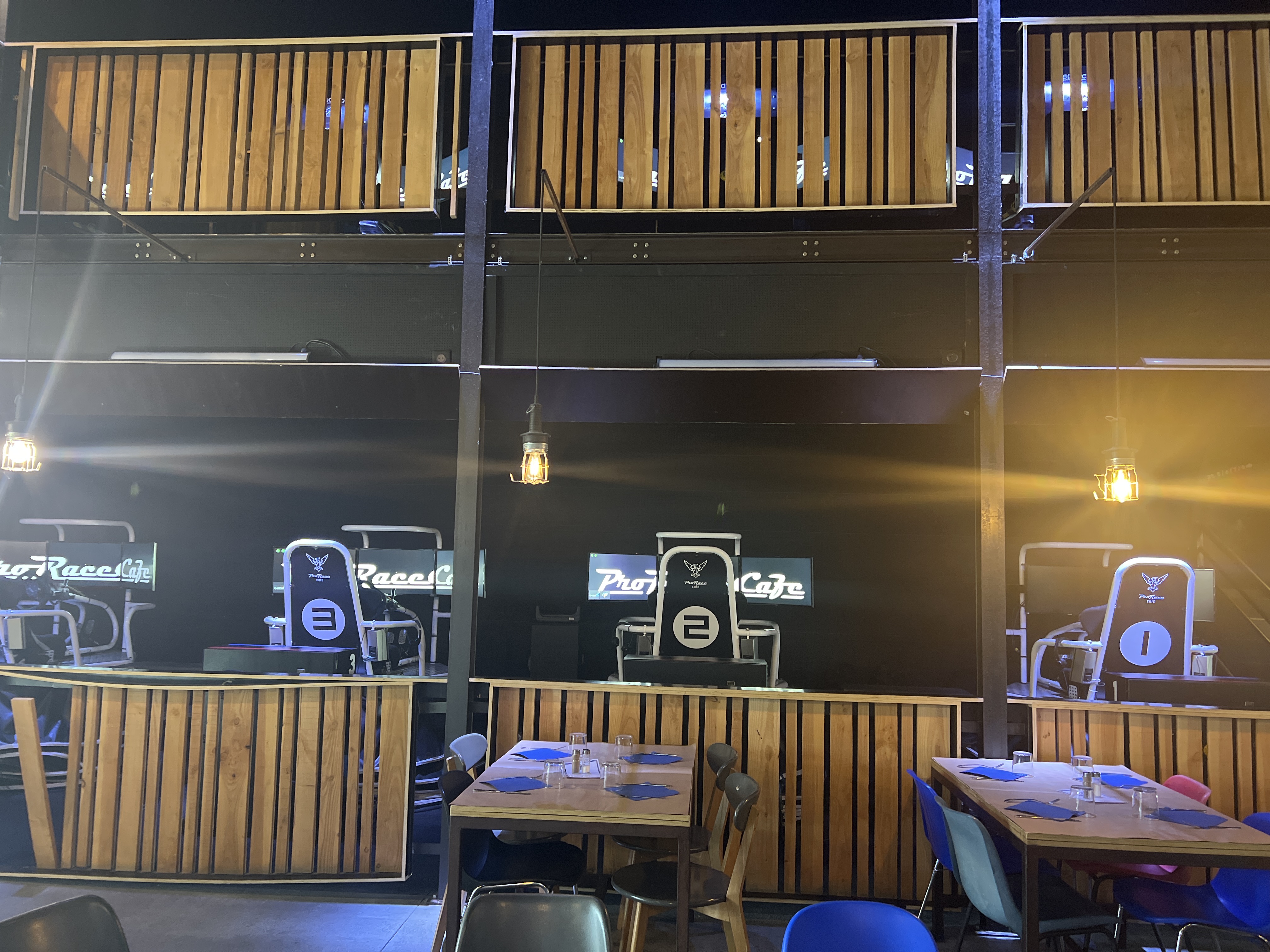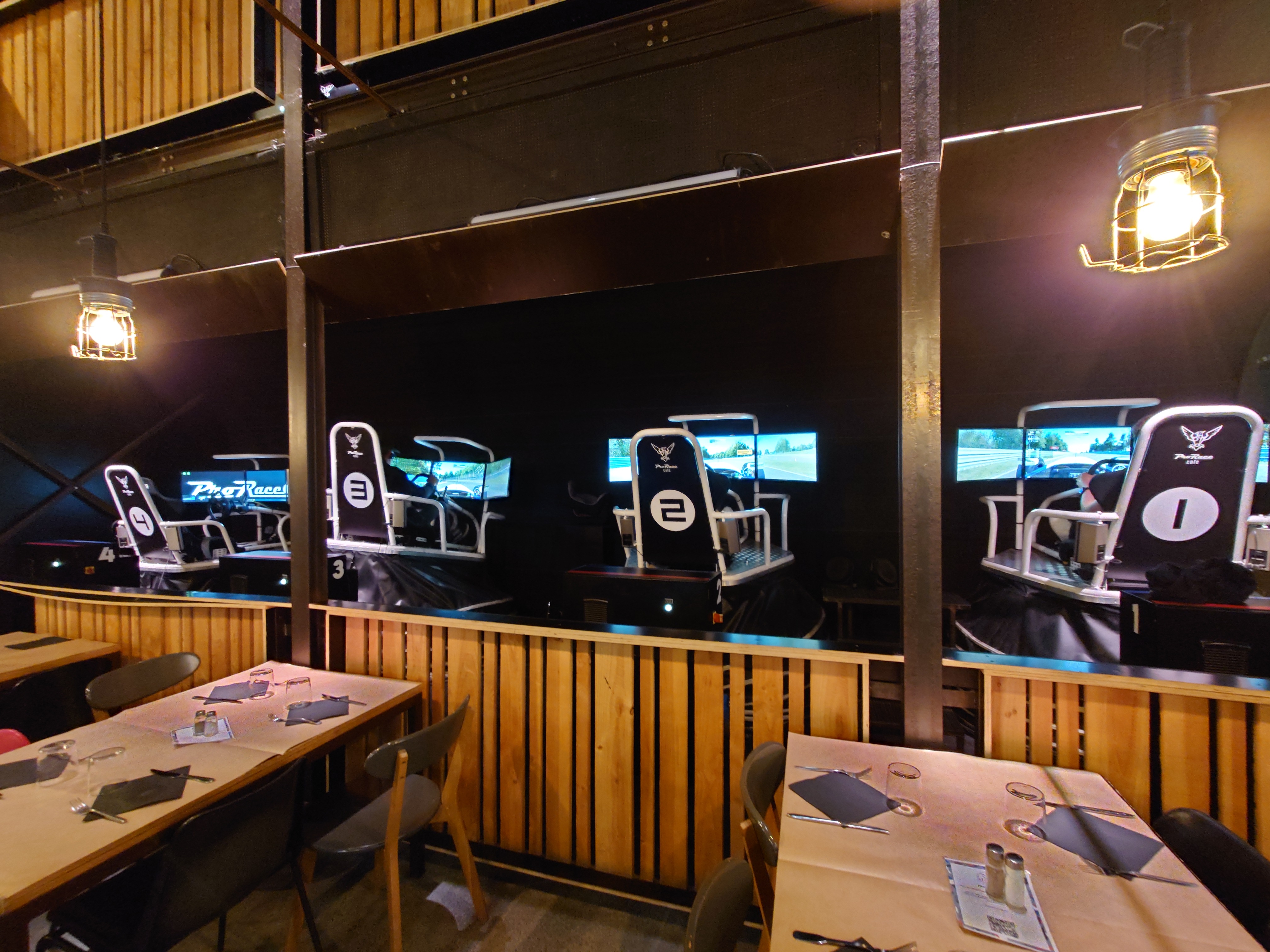 Belle endroit pour déjeuner entre amis famille en.mode décontracté avec des écrans géants et simulateurs voitures