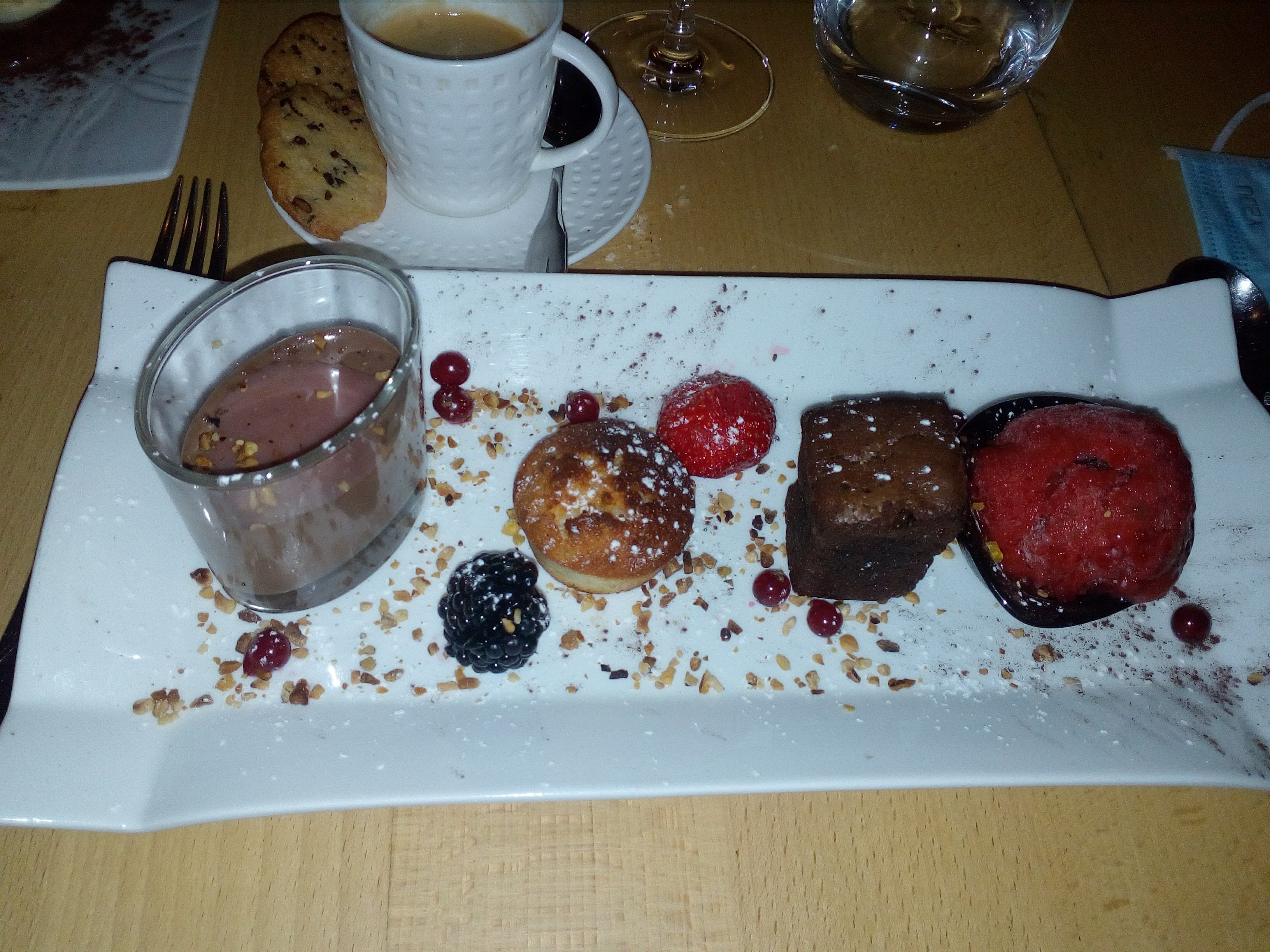 Entrée correcte, plat pour la viande ok mais poisson trop cuit quant aux desserts pas un pour racheter l'autre. Pour la bûche aux poires, on cherche encore la poire, le café gourmand est l'ombre de lui-même. Le clafouti aux pommes est en misère de pommes, le café lui-même heureusement sauve la mise.