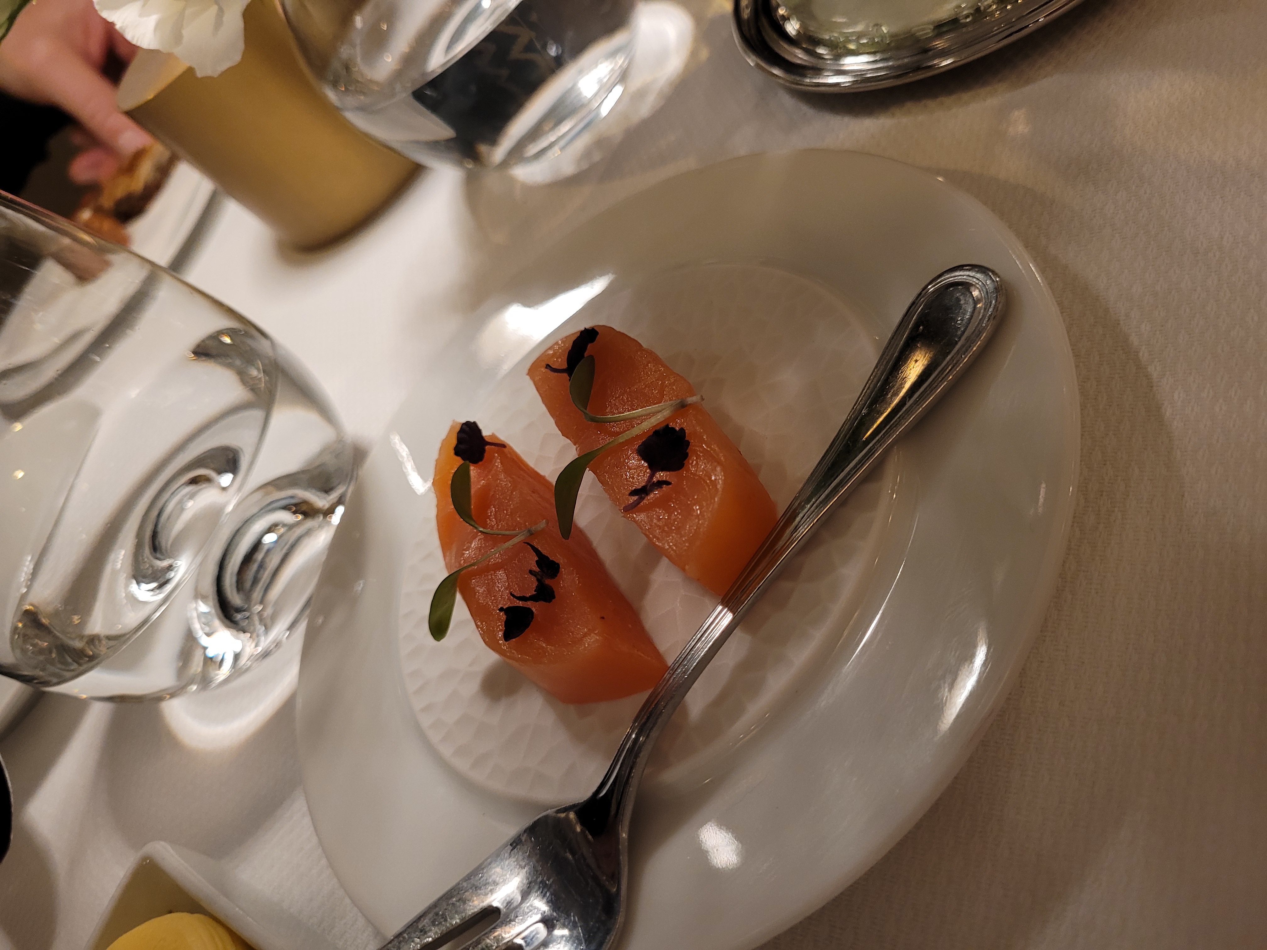 Ennuyeux. Cela résume notre repas. Chaque plat était fade. Pas de reflets, pas de complexité, pas d'éclats de saveur. Décevant. Au lieu de nous surprendre avec des bouchées supplémentaires que la plupart des restaurants incluent dans les menus de dégustation, nous avons plutôt été surpris par de multiples offres de « suppléments » moyennant un supplément. Sérieusement? Un cours de fromage en supplément ? Pour un menu dégustation à 190 euros ?
