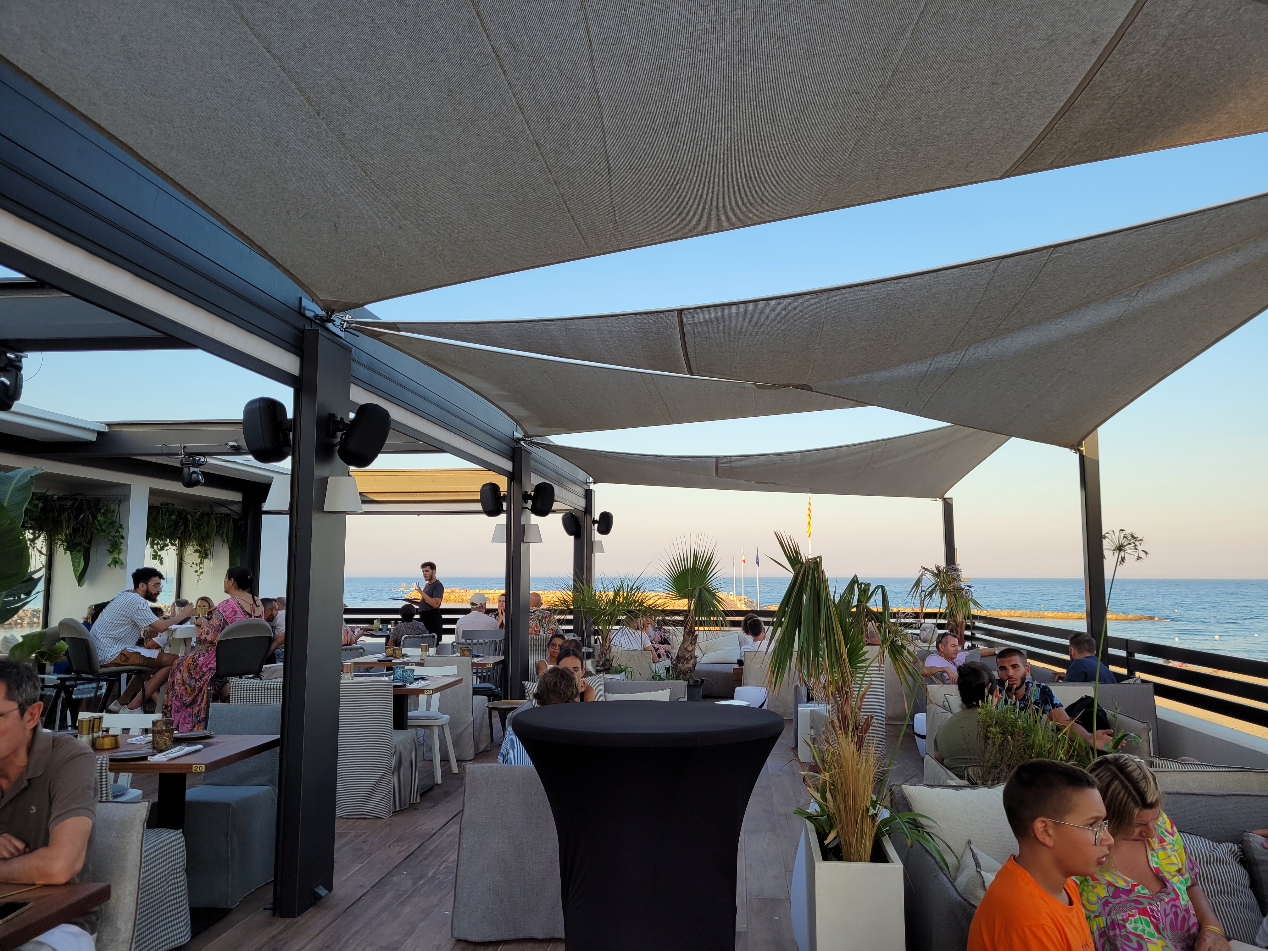 Bel endroit avec un restaurant au 1er étage. Puis un second étage avec un bar et de quoi grignoter. La terrasse à l'étage est agréable avec des tables basses et canapés suffisamment espacés pour garder un petit côté intimiste et privilégié grâce à la vue donnant sur la mer et la côte allant vers l'Espagne. Je n'ai pas testé le restaurant, mais les cocktails et les plateaux proposés à l'étage sont très bons, pour un tarif qui me paraît honnête (rappelons nous que nous sommes sur la côte 😅) . Le personnel était très accueillant, attentif et souriant, merci à eux.