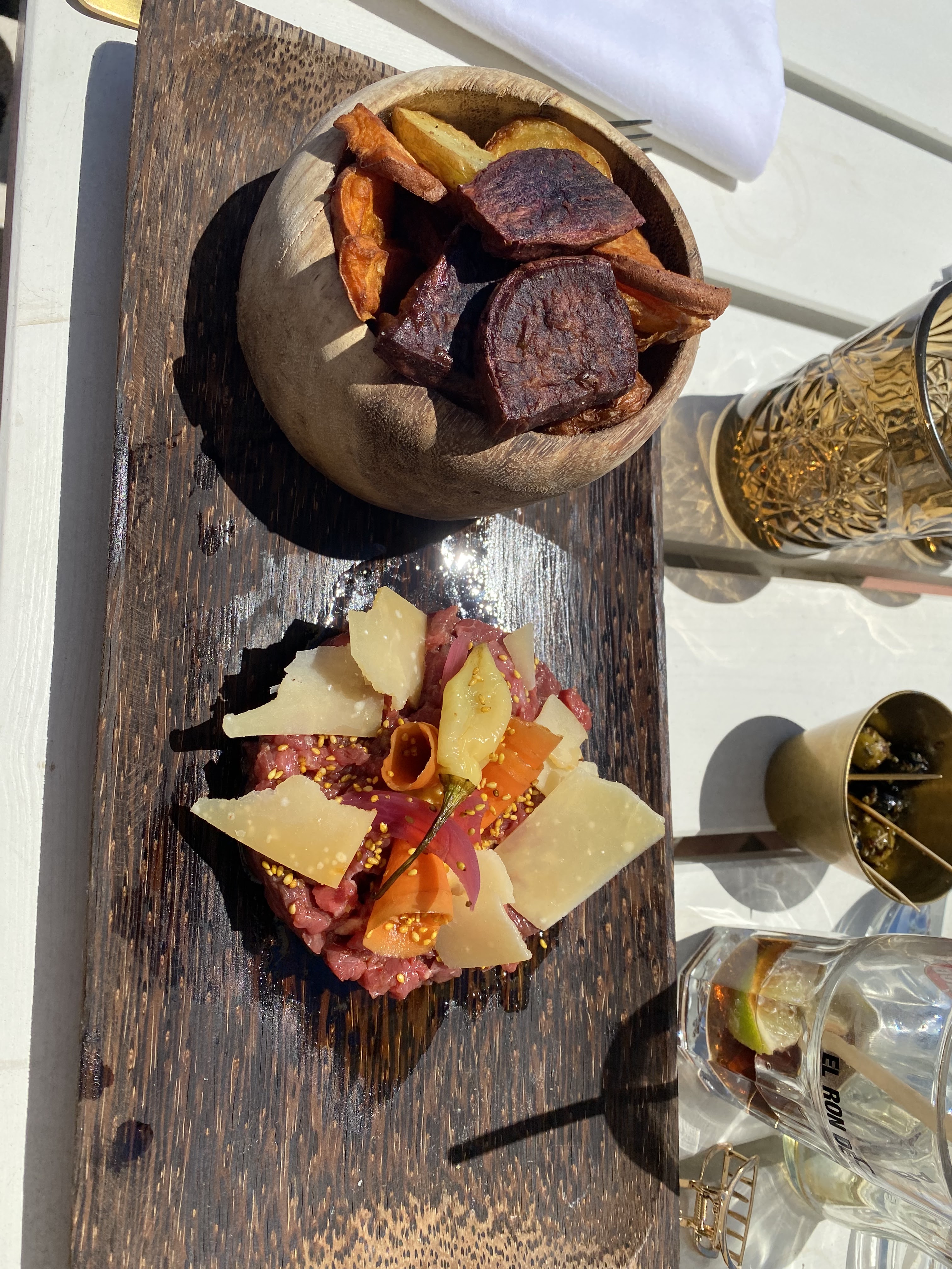 Repas avec 3 amis Service convenable, le personnel s'est montré serviable et disponible ( chargement de mon téléphone, explications simples des cocktails et plats de la carte ), un tout petit peu long mais ça peut se comprendre vu la qualité de certains plats Cadre sympathique, on ressent une forte inspiration provenant des nombreux bars de la zone hoteliere de Tulum au Mexique, musique latine en fond sonore ( du Reggeaton en passant par de la Salsa jusqu'à de la Samba ) Au niveau des saveurs c'était très bon, j'ai pris des carpaccios de boeuf ( c'était un autre nom sur la carte ), un wok en plat principal ( mélange de viande atypique de lard, poulet et gambas avec des légumes, goût de la sauce predominant et un peu trop sucré à mon goût ) et une creme brulée avocat-framboise ainsi qu'un cocktail rhum-amaretto / sirop de vanille et chocolat au lait que j'ai fortement apprécié . C'est assez cher mais je m'y attendais, et ça ne surprend pas car le lieu se positionne comme un établissement de standing . Il y aussi une terrasse a l'etage avec vue sur la plage, agréable