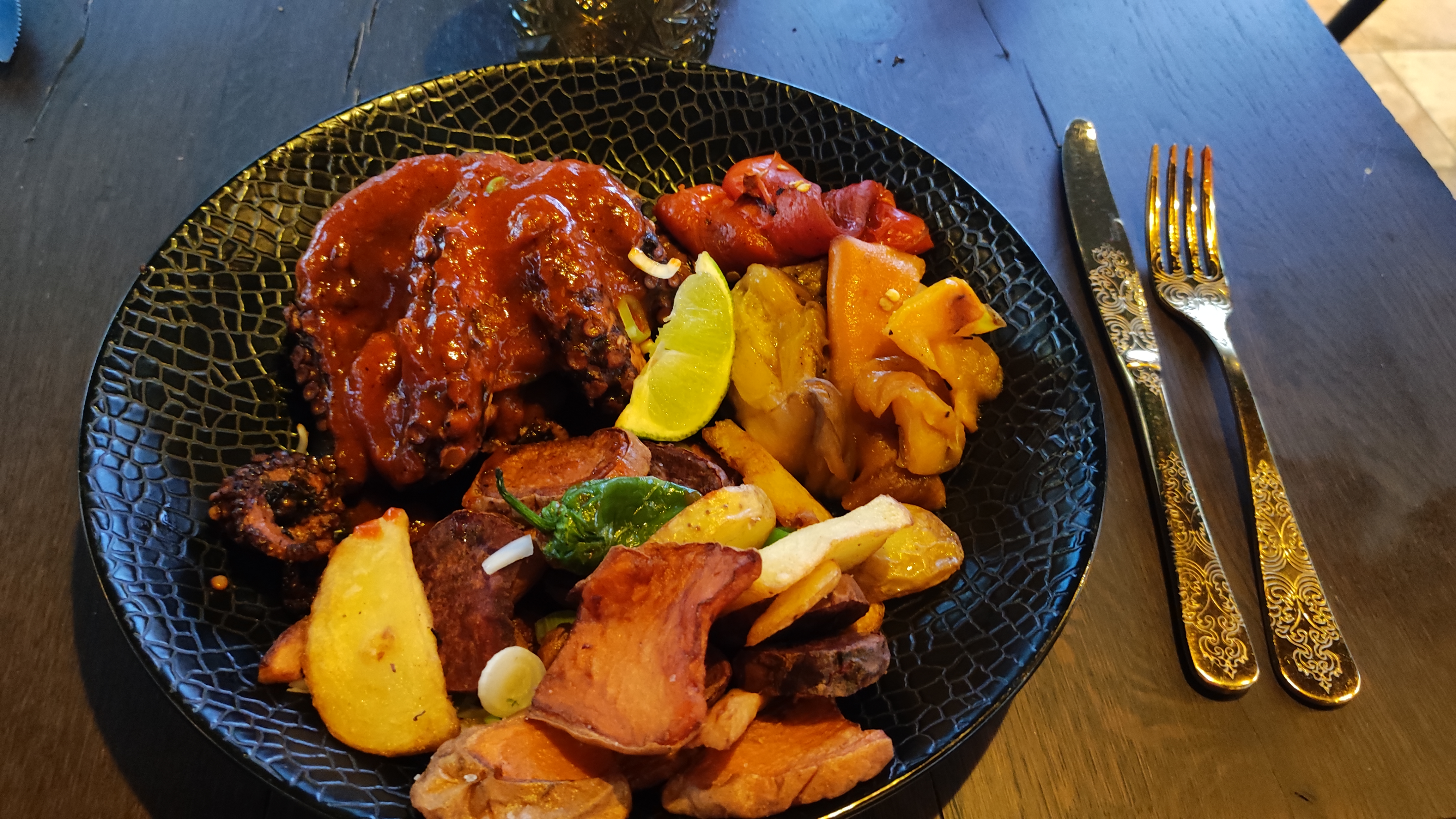 Je me suis régalé avec ce Demi-Poulpe servi avec des couverts en Or, et sans oublier une superbe vue