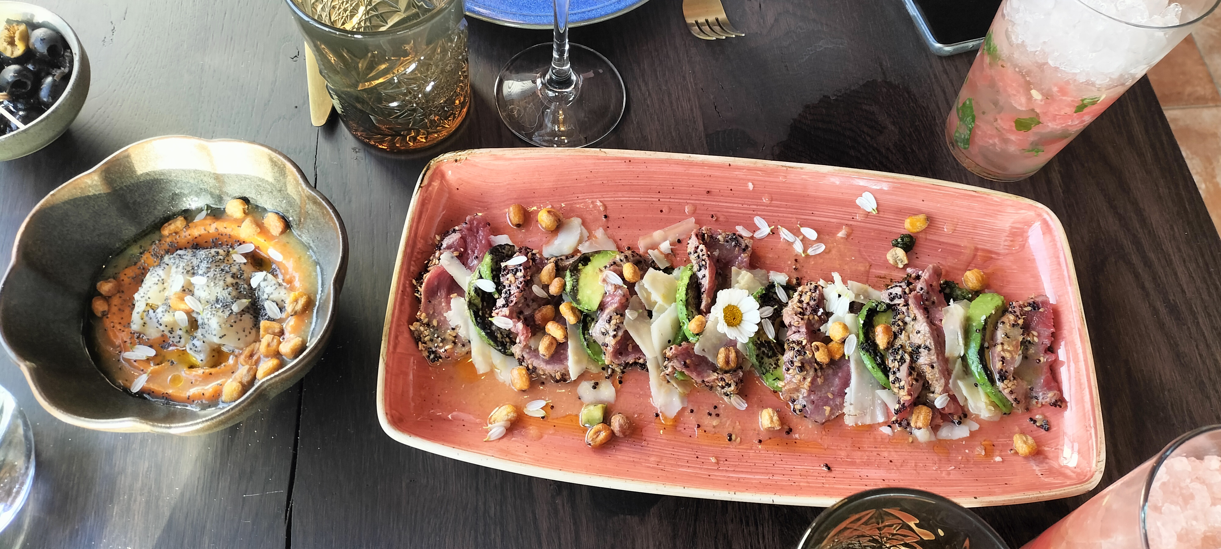 Des cocktails signatures à tomber.... C'est le gros plus de cette endroit en plus de la vue sur mer magnifique. Le service laissait à désirer ceci dit la repartition des serveurs un peu bizarre.,. Un commane, un autre sert et un autre ramasse... On attendait toujours celui pour la commande... C'est trouver Charlie 😂 les tapas que l'on a commandé etaient bon surtout la pinsa bonne découverte !