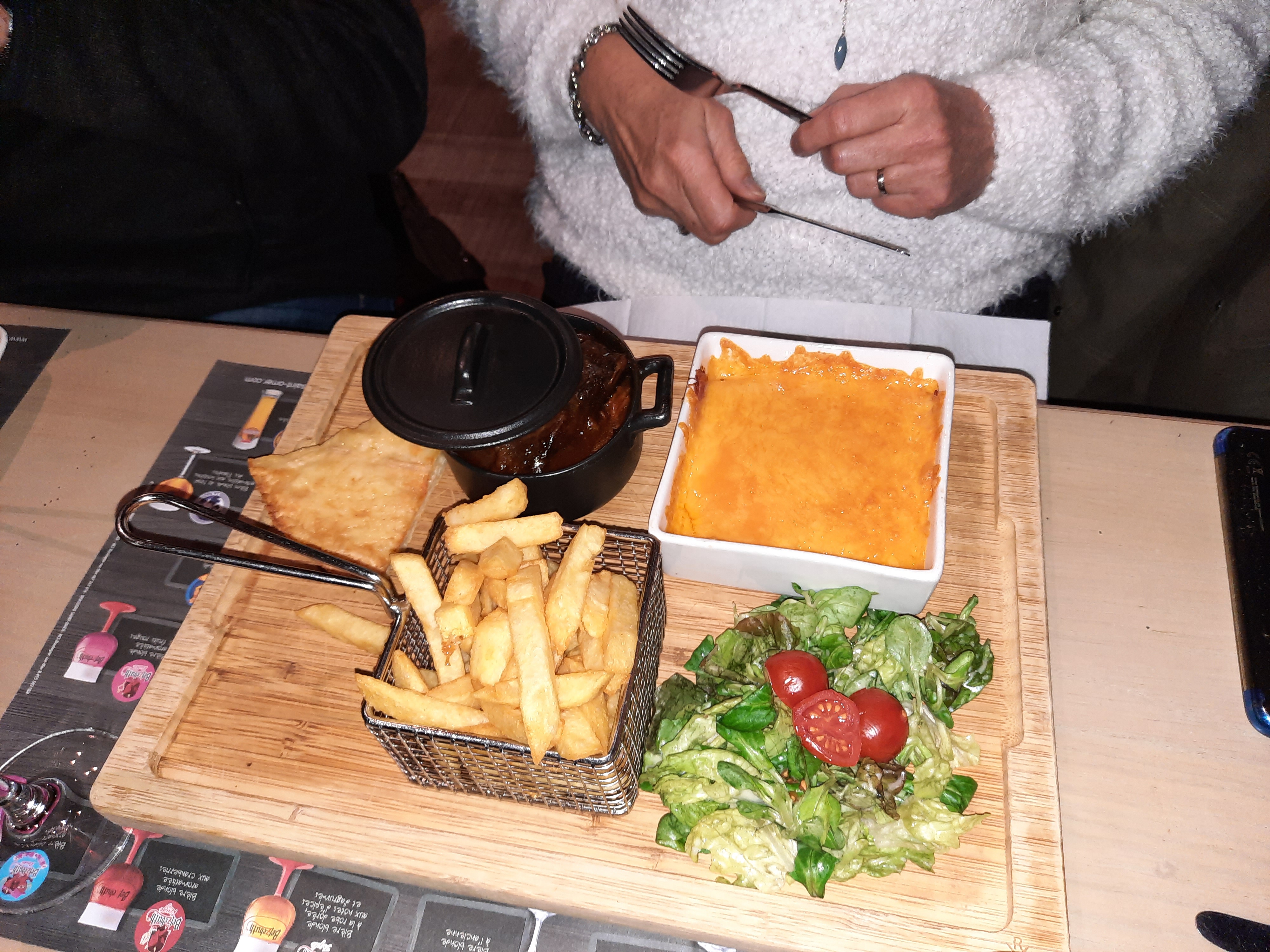 Bonjour. Très bon accueil c'est tout. Après très déçu. Planche apéro très correct produit non fait sur place.😕 Les plats hamburger au poulet avec sauce guacamole comment vous dire le poulet ne ressemblait pas du poulet la sauce guacamole on pouvait des neiges avec, le fromage dans l'hamburger on aurait dit du plastique. 😕 Assiette tartine grillée au reblochon le pain était spongieux... 😤 Vraiment déçu . l'accueil est super le décor aussi mais on voit que c'est l'industriel rien n'est fait sur sur place sa sort des boîtes soit sa sorti du congélateur.👎👎👎 64€ pour sa non merci . Malheureusement quand on a dit à serveuse son sourire chaleureux est vite parti. J'entends c'est pas agréable je comprends mais même pas un geste commercial rien vraiment dommage 😤