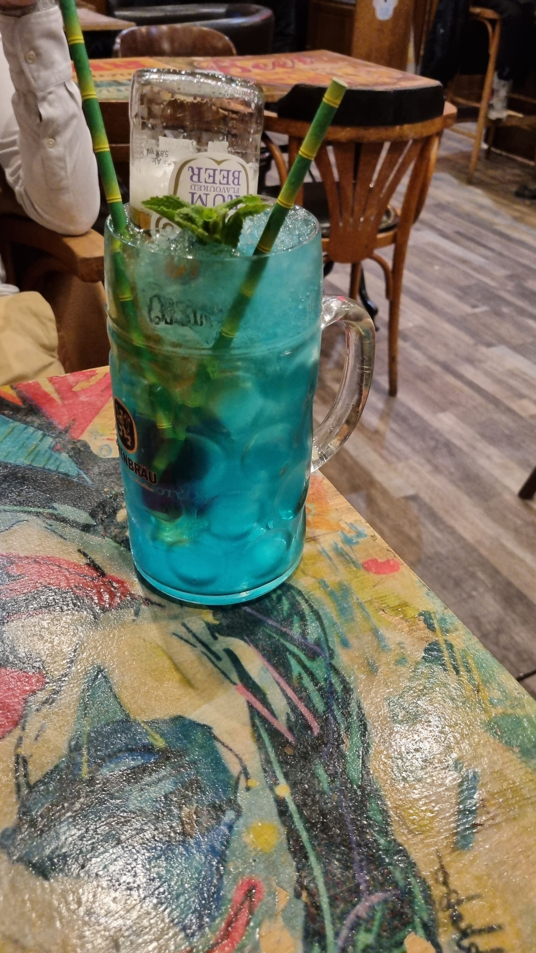 Le lieu à l'air sympa, l'ambiance aussi. Je regrette toutefois qu'il y ait des saletés dans mon verre ( on dirait des cendres et je suis en interieur) et l'insecte mort sur la table ou je suis.
