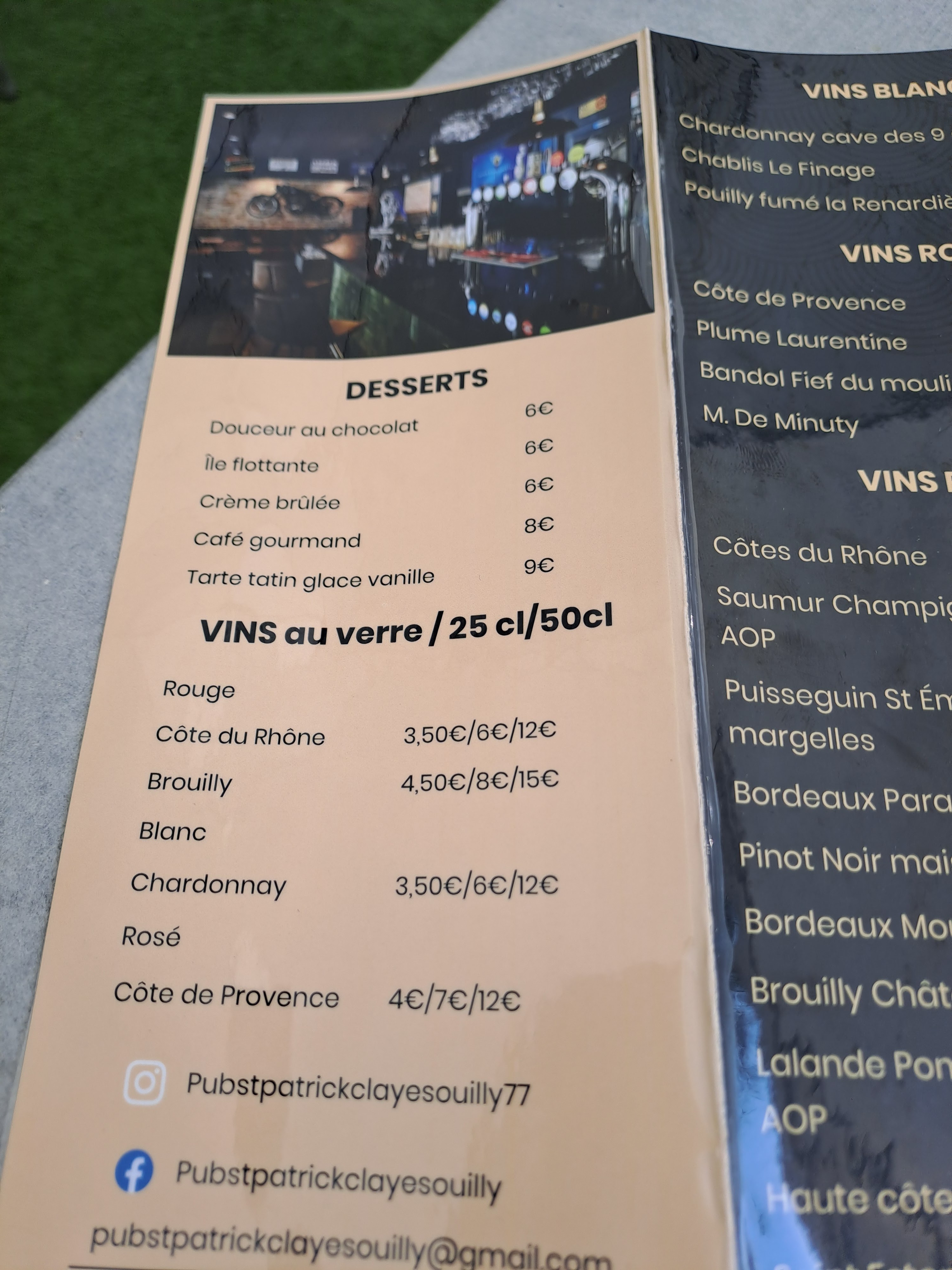 La note 0 aurais été approprié , si vous ne faite pas partit des « connaissances » du pub saint Patrick je vous souhaite beaucoup de patience pour être servie . Au bout de 15 min toujours personne pour prendre notre commande pour boire un verre mon conjoint se déplace donc au bar , ou on lui dit que l’on arrive .. 25 min après devant nous les tables ou les personnes connaissent le patron se font re servir une deuxième fois , puis une table a coter de nous et débarrasser pour pas les encombrer par les verres .. 2 serveuses , et deux serveurs à tourner en rond mais toujours personne pour prendre notre commande . Au bout de 30 min sans que personne veuille prendre notre commande obligé de redonner les cartes , avec l’air effaré de là serveuse . Vous faite bien de vendre votre fond de commerce . Laisser la place au professionnel à qui ça ne dérange pas de servir des clayois .