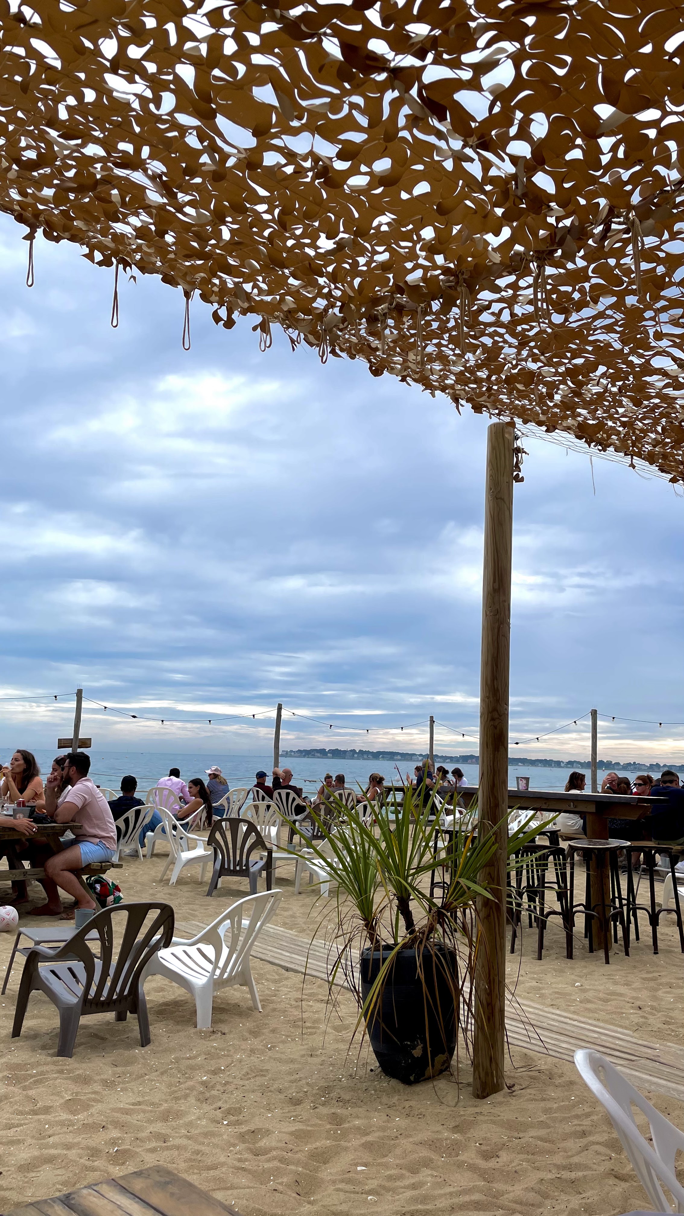 Sympa de boire un verre ou déjeuner sur le pouce les pieds dans le sable (huitres/vin blancs, salades, paninis,..) face à la mer, en famille ou entre amis. Les kids raffolent des paninis nutella au goûter et en soirée place aux apéros en musique. Prix abordables, service assez lent mais quand on est en vacances...