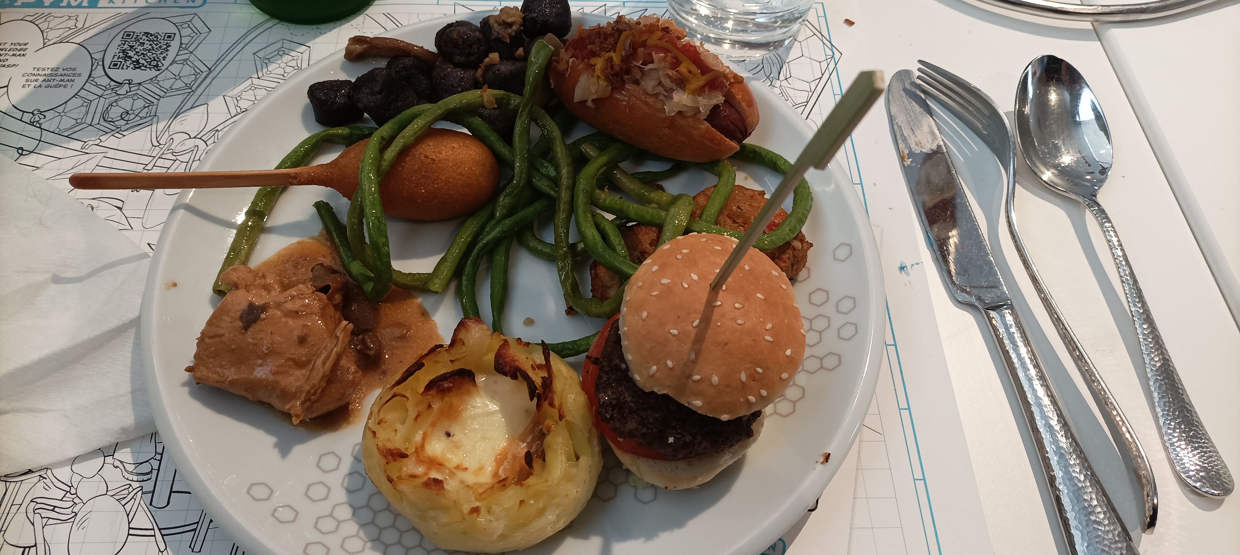 On a tout aimé ! Le concept est vraiment sympa et drôle. La déco est assez sobre mais les détails nous ont bien plu - on se croirait vraiment dans la cantine d'un labo, avec les condiments dans les tubes à essai, ainsi que plein de petits éléments du même type un peu partout. Les clins d'œil à la saga Ant-man sont amusants et bien pensés. Côté nourriture, c'est varié et très goûteux. Le jeu sur les proportions de nombreux plats et desserts est très ludique. Sandwich miniature ou géant, part de méga Oreo, giga bretzel, etc... Point très malin : les verrines, particulièrement adaptées aux enfants, de même que les mini hot dog et autres. Mention spéciale pour les travers de porc sauce barbecue, une vraie dinguerie ! Le prix est un peu élevé, mais parfaitement rentabilisé dans le cadre d'une formule type pension complète (ce fut le cas pour nous). Personnel sympathique, efficace et dynamique. Bon accueil. On a adoré pouvoir voir le personnel de cuisine à l'œuvre, grâce à la cuisine en partie ouverte. Bref on s'est régalés !