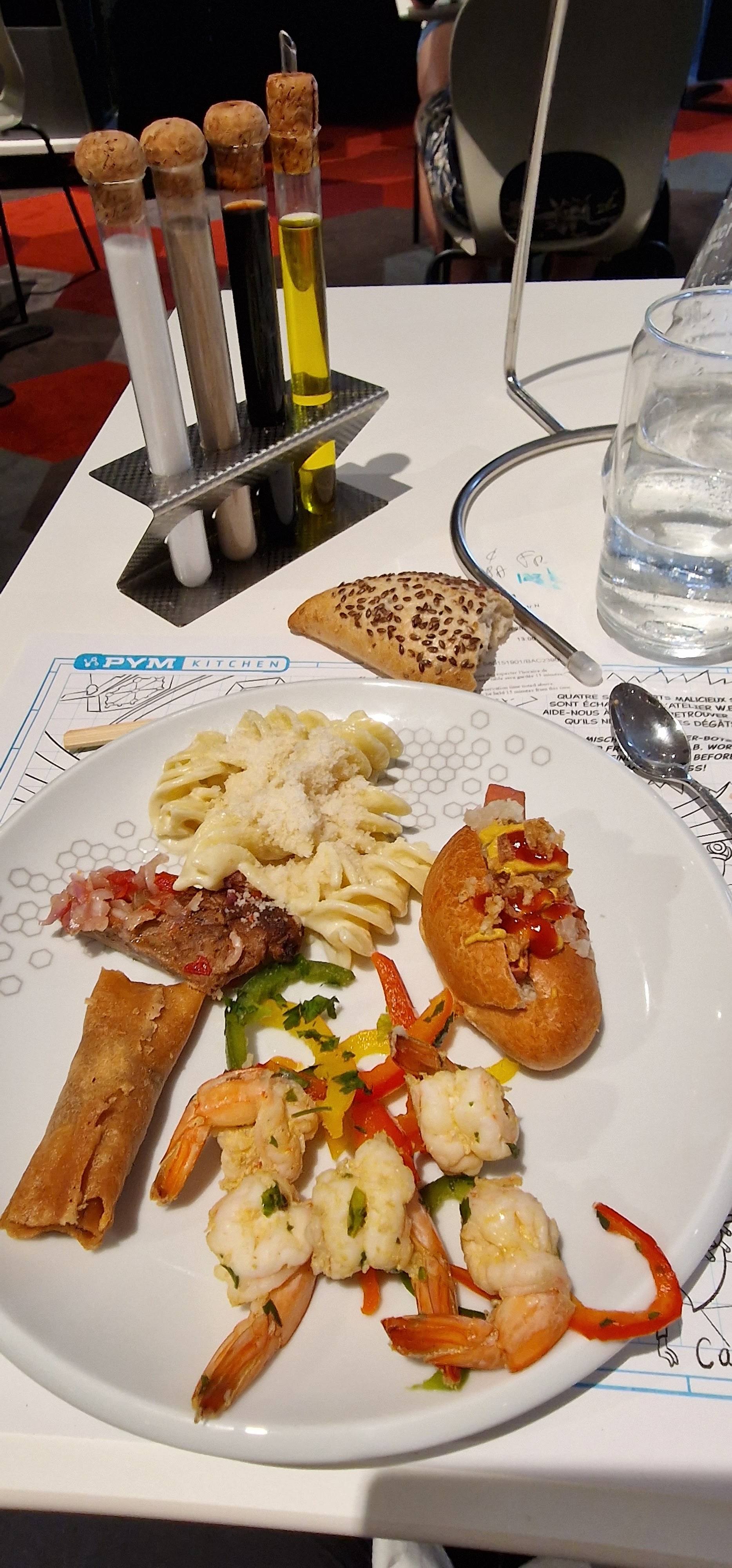Je vais être dur, mais je vais aussi préciser que je ne suis pas un hyper grand fan de l’univers Marvel, à vous de juger la suite de l’avis en conséquence :) PYM c’est un buffet à volonté dont j’ai beaucoup entendu parlé (en bien) et qui ne m’attirait pas du tout de prime abord. À force d’entendre à droite à gauche que l’expérience vaut vraiment le coup, j’ai décidé de mettre mon ego de côté et de laisser sa chance au lieu. Premièrement je tiens à vraiment préciser que le service, l’accueil, le personnel en général a été extraordinaire et véritablement le point fort de ce restau. Un grand merci à tous pour votre attention constante et vos sourires malgré le monde présent ce jour! Maintenant, l’esprit du buffet je n’ai pas réussi à le retrouver. Oui il y avait effectivement le gros et les mini burger, la mayo bleue, les petits corn dog et les croûtons géants dans la salade…. Mais à part ça, rien de fou. La carte semble changer plusieurs fois dans la semaine pour varier les plats. Je suis peut être tombé sur un jour où la cuisine ne m’a pas vraiment parlé. C’est resté simple, un poil sec, et timide au niveau des saveurs. L’ambiance je l’ai trouvée plutôt froide, mais encore une fois je ne suis pas sensible à l’univers et on est censé être dans un laboratoire 😅 Pour moi, le bretzel géant sur la table résume ce que j’ai vécu sur place. J’ai fais 2/3 allers retour au buffet, puis n’ayant rien trouvé à mon goût j’ai fini par rester à table pour manger ce fameux bretzel. Il m’a calé, il était bon, mais ça fait cher à 45€ (38 avec la réduction PA). J’ai donné sa chance suite recommandations, j’ai été déçu. Au moins maintenant, je sais que cet endroit n’est pas pour moi!