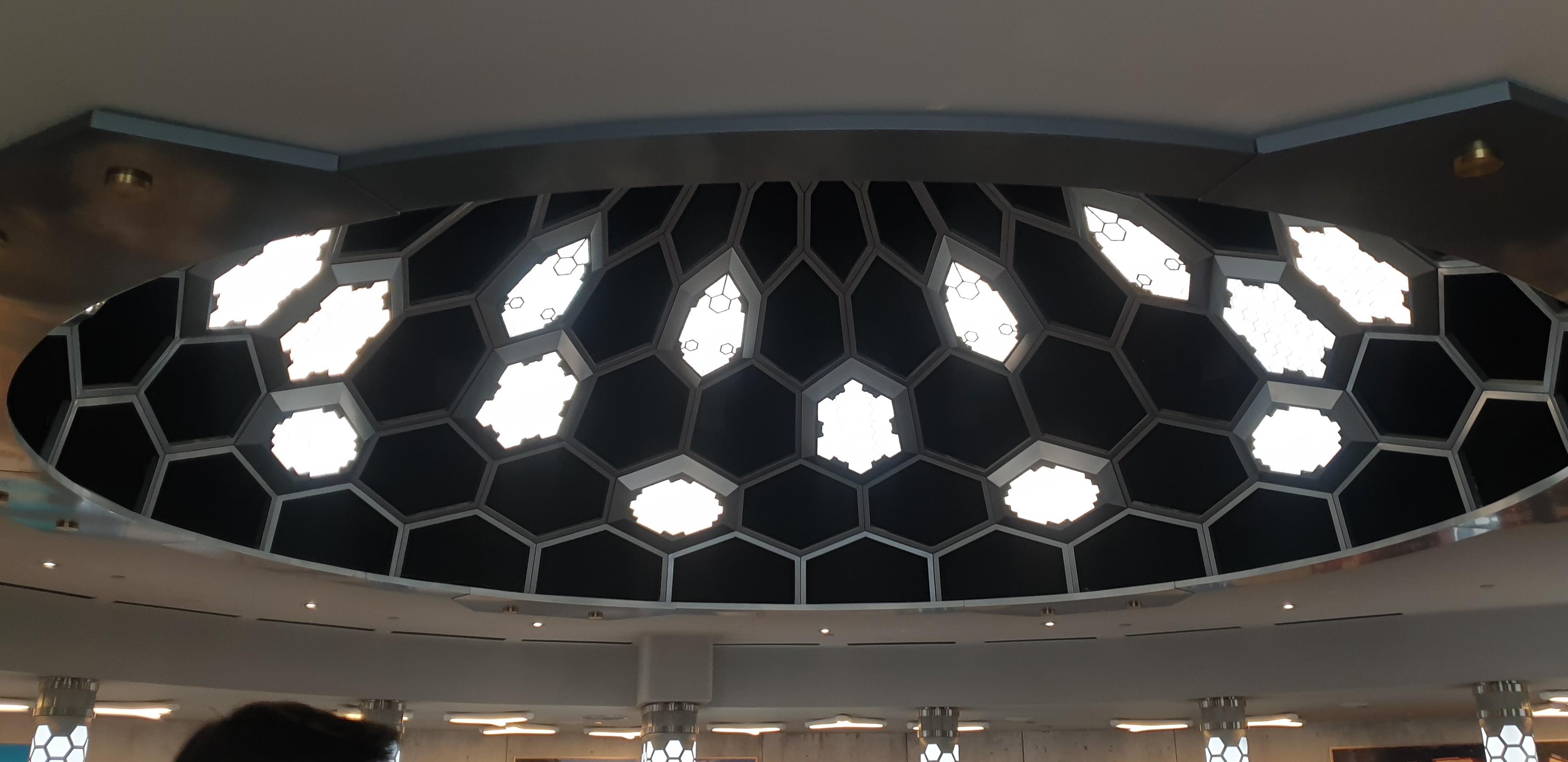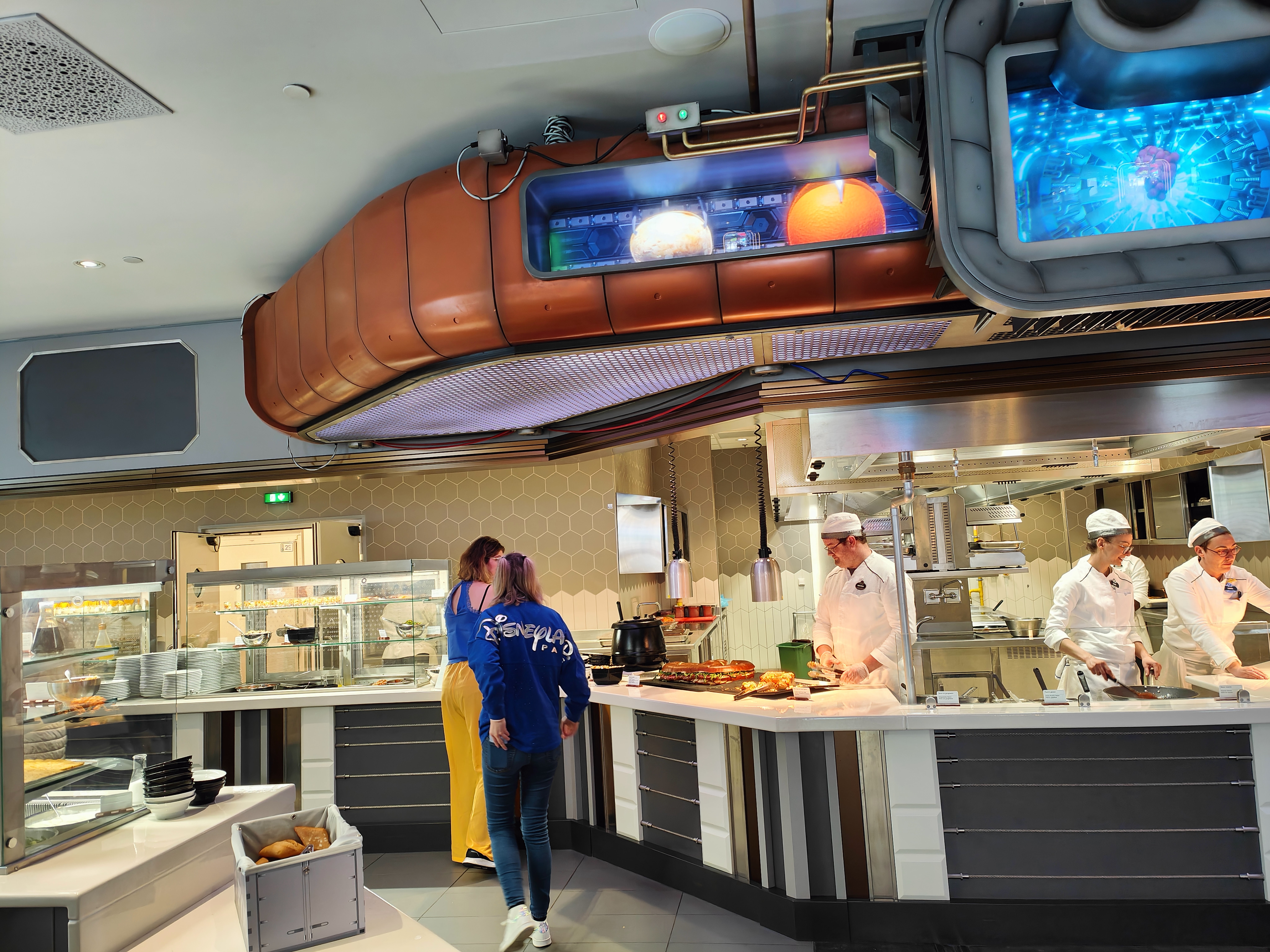 Ni plus ni moins qu une cafétéria ou un restaurant chinois version buffet à volonté. La déco est sommaire version hôpital et comme c est pratiquement un restaurant en continu le buffet est mal entretenu lié à tes clients indélicats et un laxisme du personnel. Pour ma part un serveur débordé qui a peine eu du temps pour nous et j attend encore mon bretzel.... je suis déçue de la décoration j attendait mieux de Disney vu les autres restaurants du parc et on parle pas du prix du menu😱....