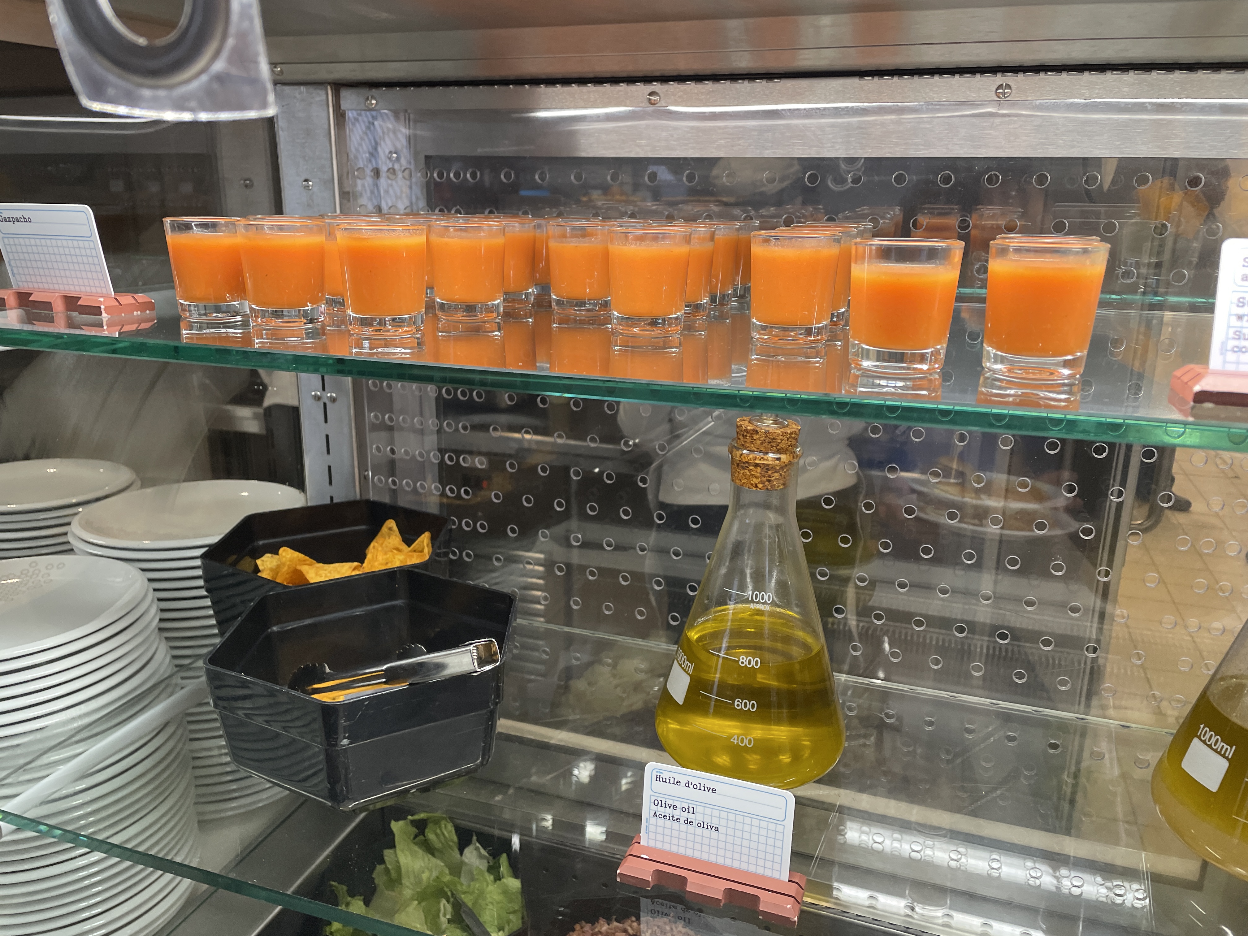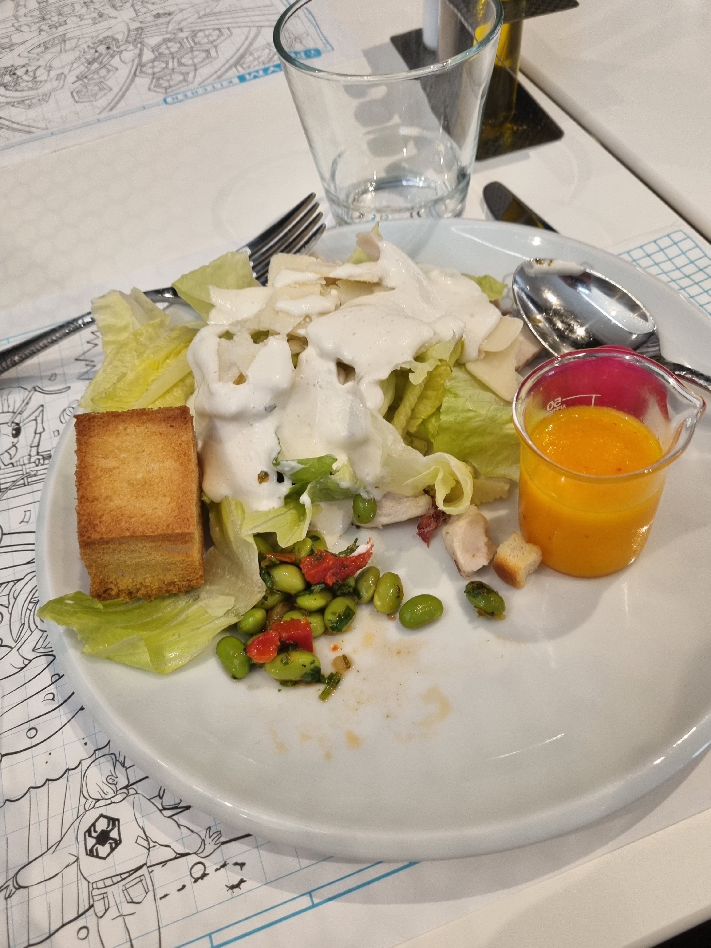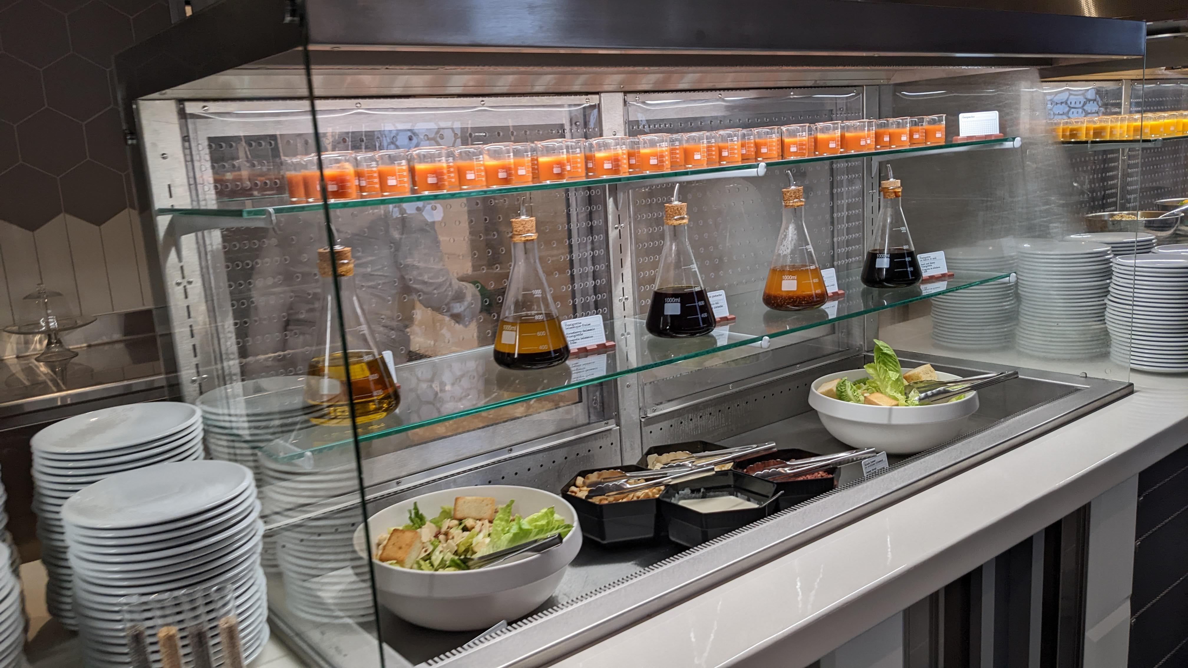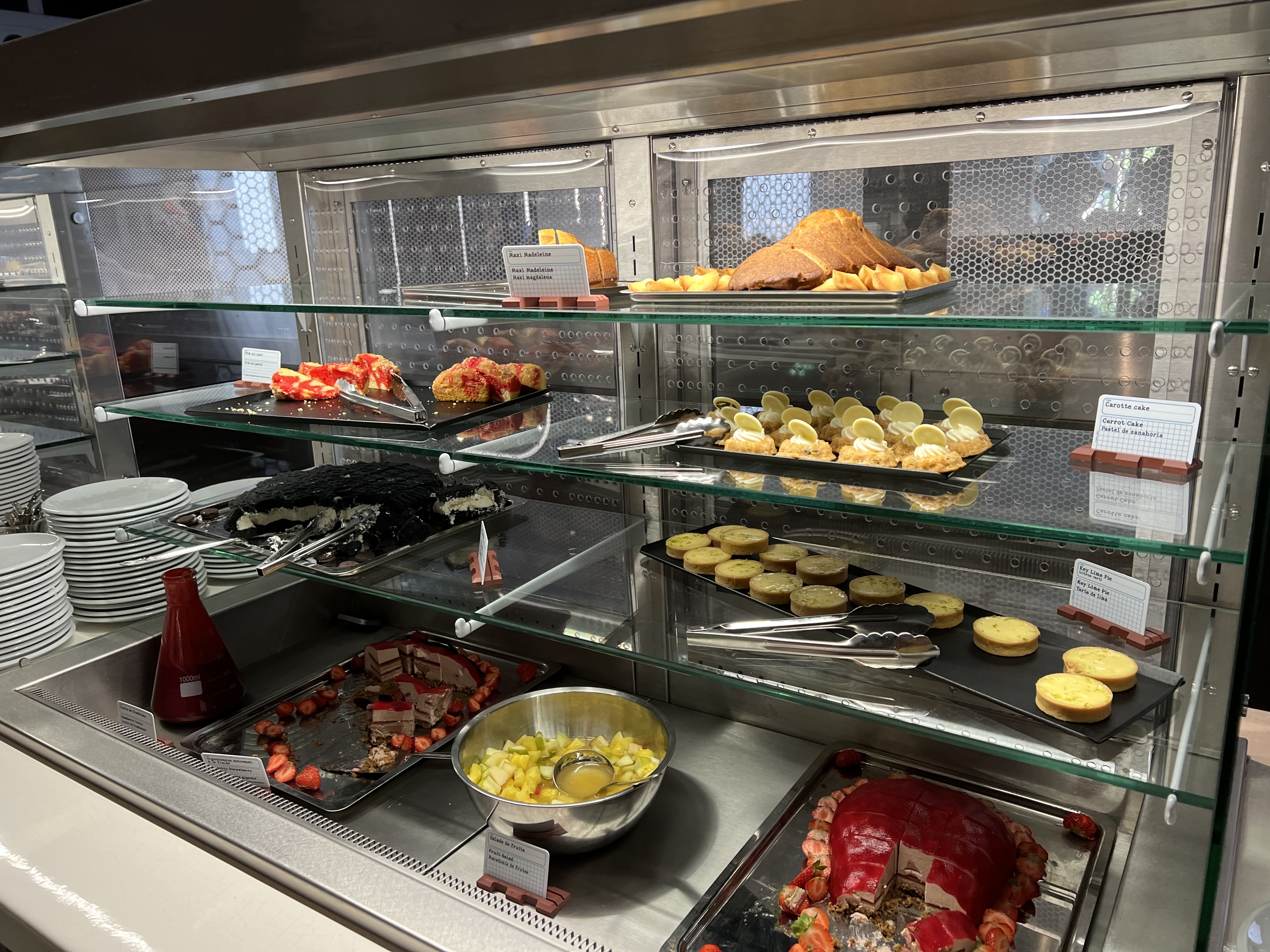 ++ le personnel : serveuse très prévenante et globalement personnel nombreux et agréable; + le concept / décor : cadre agréable (même si au final légèrement moins abouti que le bistro chez Rémi), certains plats en version mini ou maxi, boissons dans des éprouvettes et condiments en tube à essai; + la qualité de la nourriture globalement satisfaisante (même si l'exécution est assez basique pour une large part); - le choix trop limité pour un buffet; - le prix élevé, même pour un restaurant du parc. A faire une fois pour les inconditionnels, mais en sachant que pour ce prix, les plats sont (majoritairement) simples et que l'offre n'est pas pléthorique.
