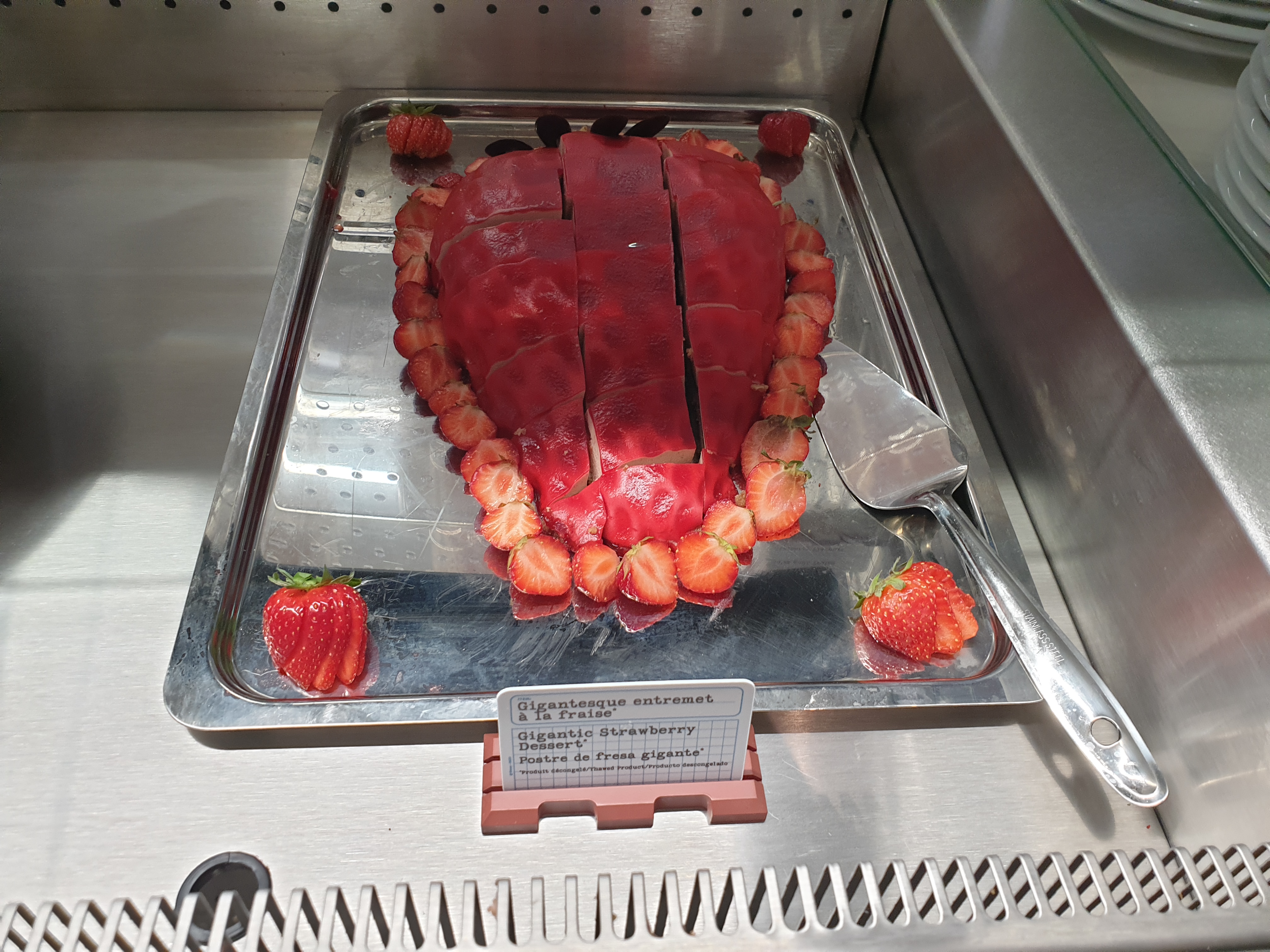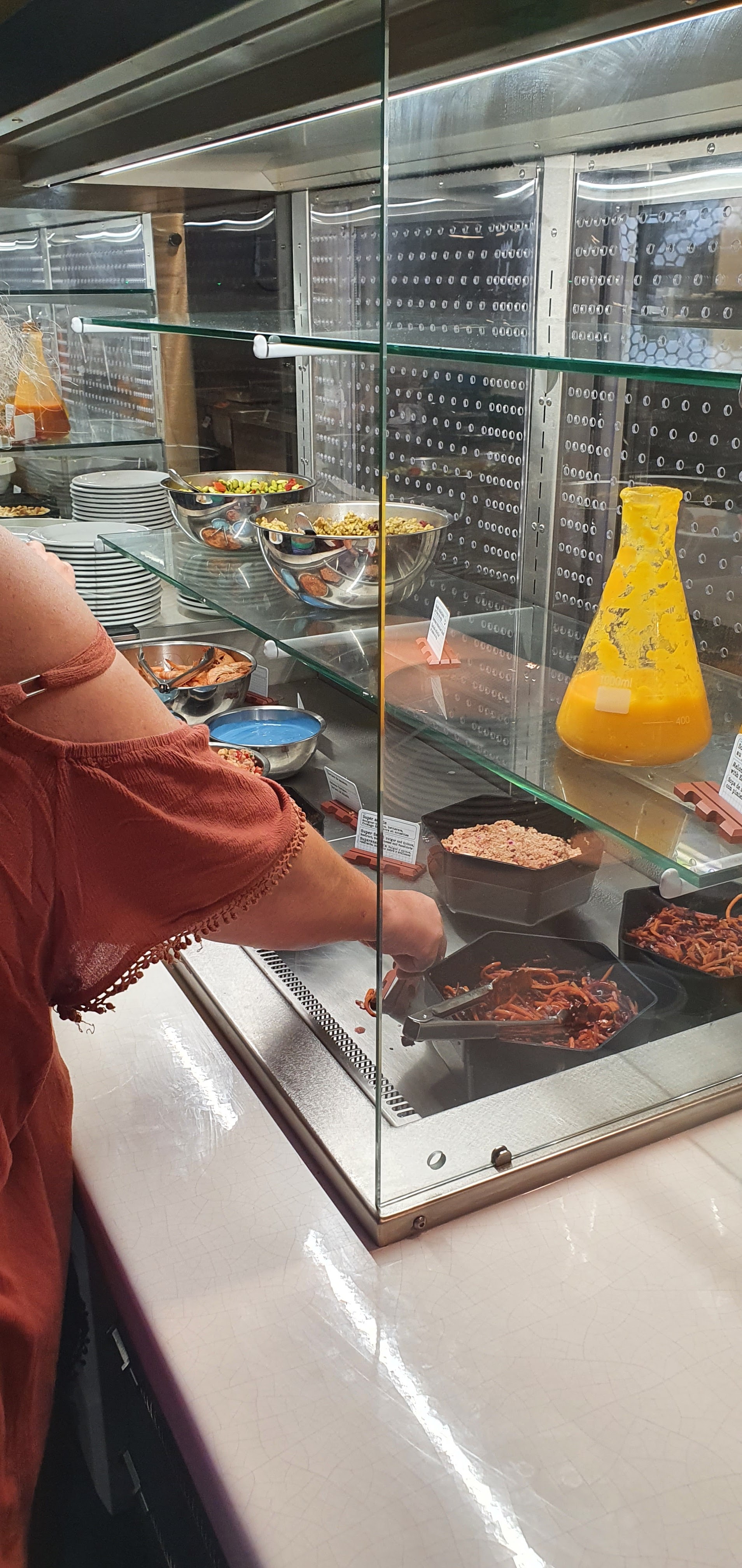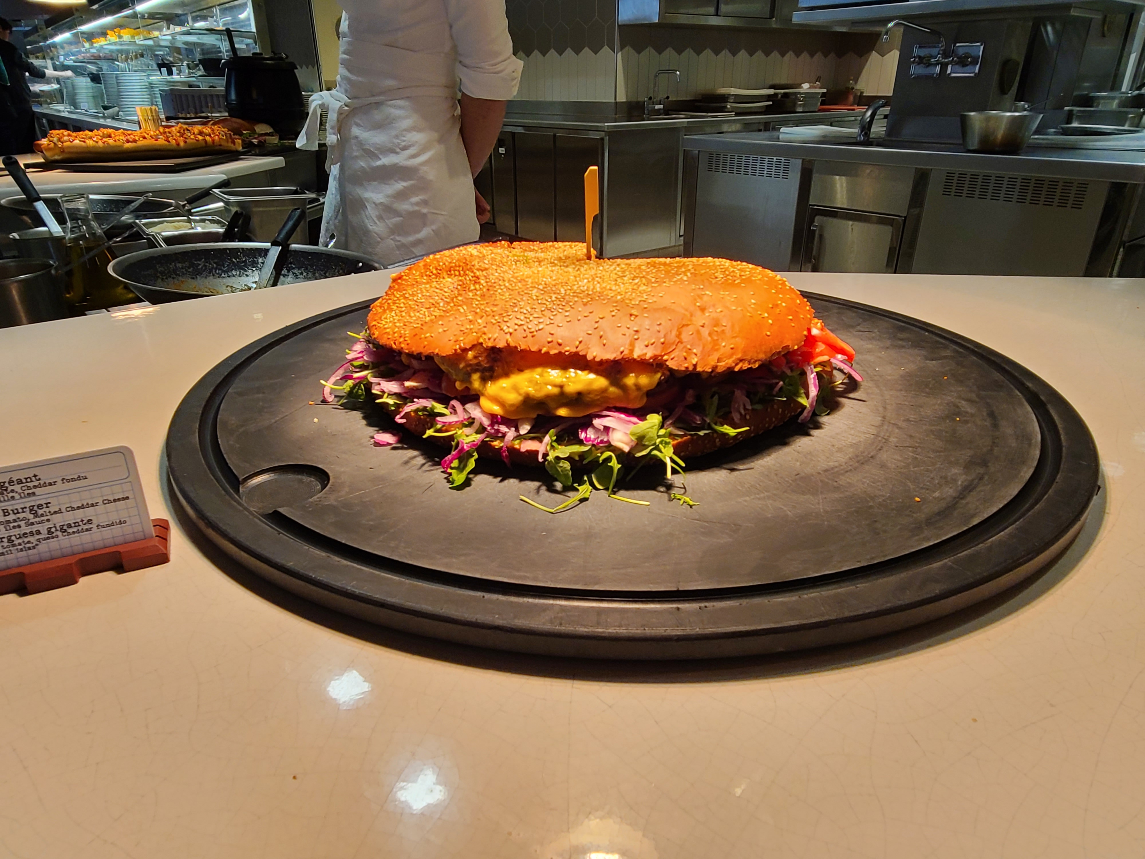 Buffet à volonté avec des plats soit géants soit petits. Il y a des choses très originales comme la mayonnaise bleue ou les haricots verts géants. La personne qui nous a emmené à table nous n‘a rien expliqué. Suivi par un malentendu avec la serveuse sur les boissons et sur le nombre de personne. Elle voulait nous encaisser une personne de plus malgré qu‘une place a resté libre car la première personne n‘avait pas enlevé les couverts. C’est original mais le prix reste élevé avec 42€ par adulte.
