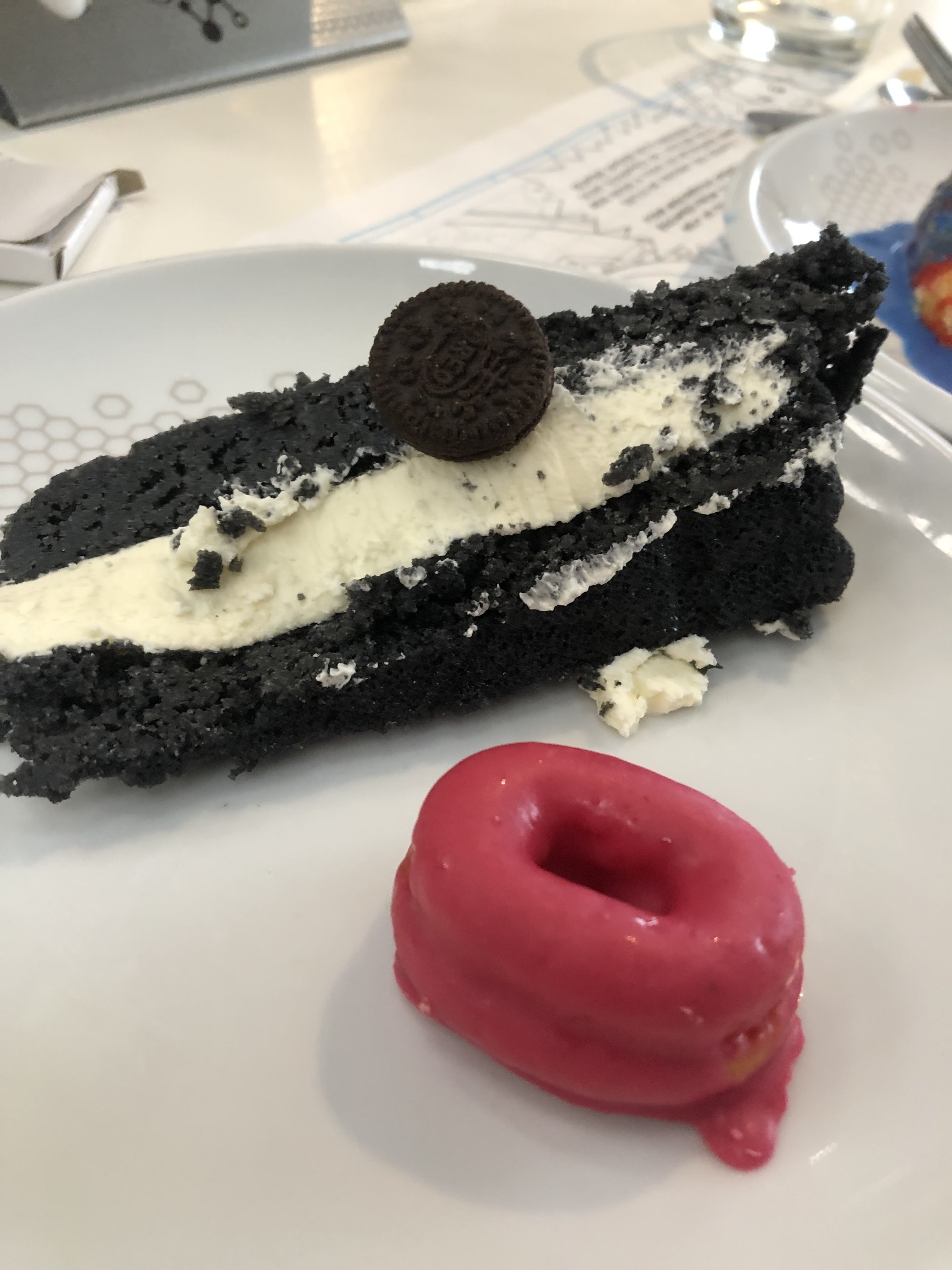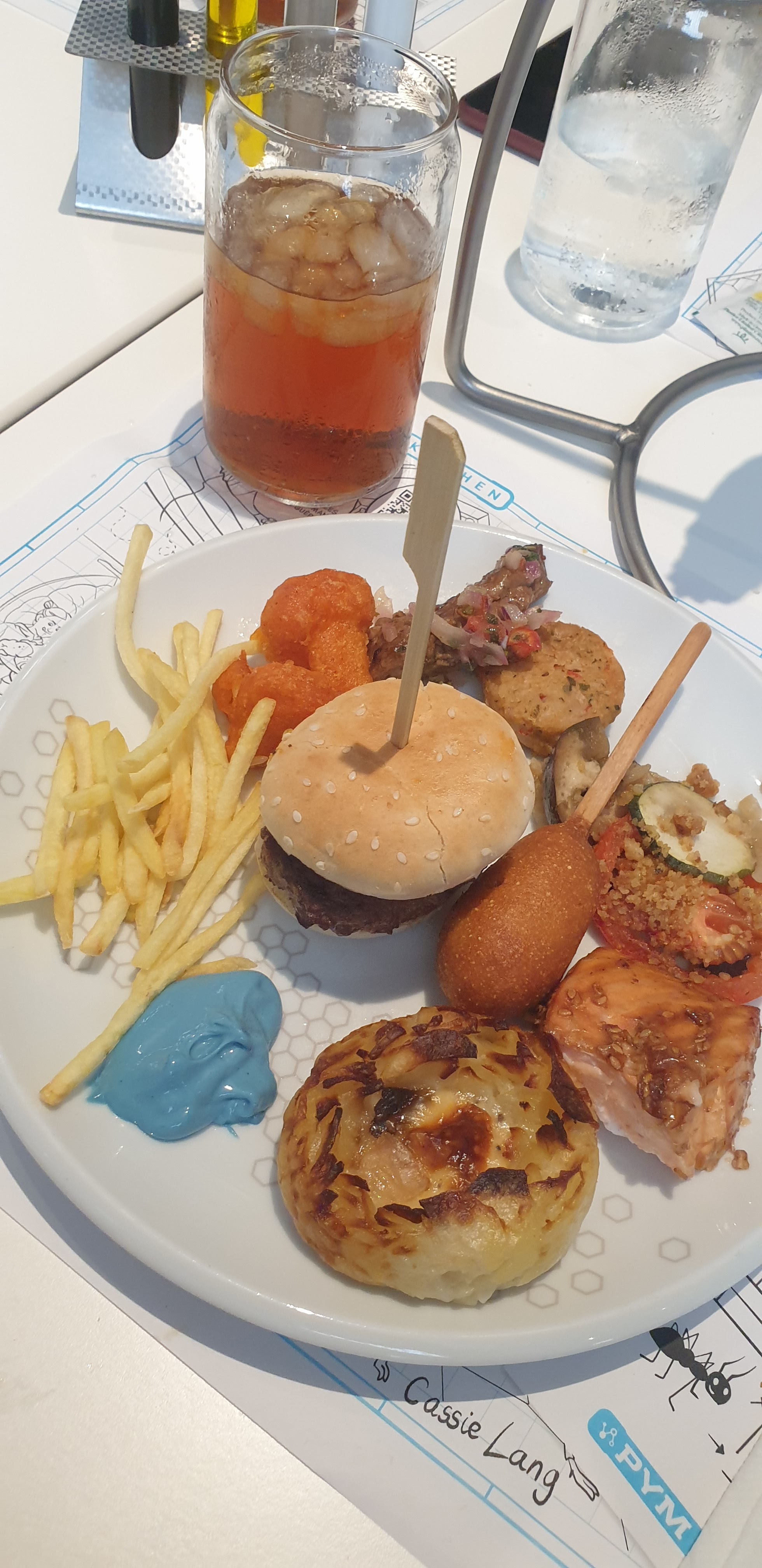 On a adoré le concept de nourriture gigantesque ou minuscule, boire dans des bechers, le sel dans des tubes à essai, la mayo bleue ou encore crème anglaise bleue... Beaucoup de choix de nourriture, super décor et le personnel est adorable, mention spéciale à Elves notre serveur et Luc un des cuisinier.