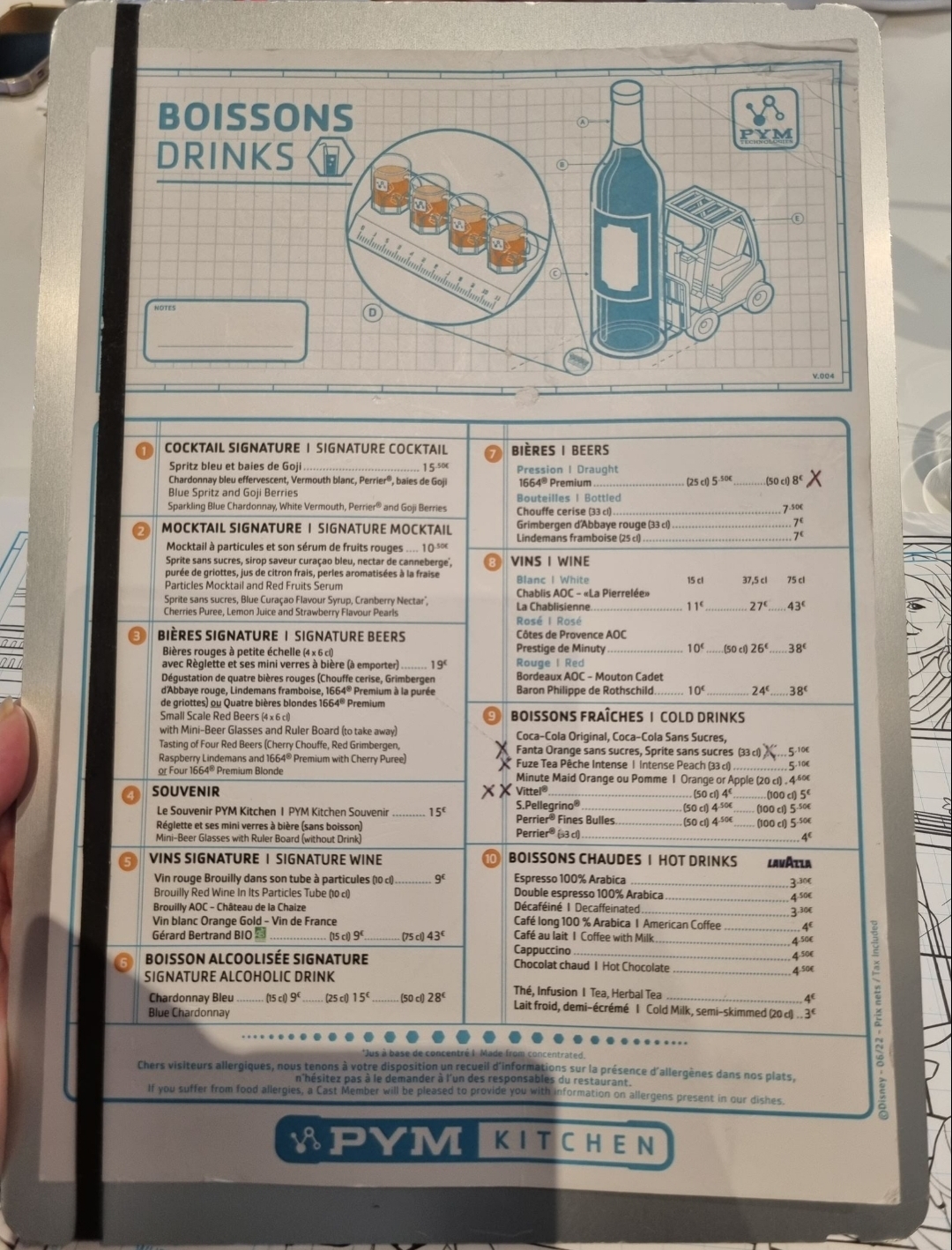 Le PYM Kitchen c'est un restaurant concept. Le buffet à volonté est à 42€ avec 1 soft inclus. Vous entrez dans le monde du Dr PYM qui agrandit et rétrécit les choses comme il a rétréci Ant-Man. Le restaurant se situe donc dans l'Avengers Campus. Niveau déco, c'est très joli, dans le détail du monde de Ant-man, très épuré aussi. Je prends à chaque fois le cocktail sans alcool. Première fois sans trop de goût. Mais cette fois-ci : très bon! Il faut verser le liquide rouge dans le verre contenant le liquide bleu. Assez sympa. 10€ certes, le prix d'un mocktail donc. Concernant le buffet, je suis très exigeante. Mais ce buffet est définitivement un de mes préférés. Bien loin devant par exemple celui du Plaza Garden qui fait très Lunch Garden. Ici, chacun a la possibilité de trouver quelque chose qui lui plaît. Corn-dog, Jambalaya (j'apprécie particulièrement), du saumon, du porc, du poulet, des plats végétariens, un hamburger géant accompagné de ses mini hamburgers, un hot-dog géant accompagné de ses mini hot-dogs, un Bretzel au pastrami géant... En show cooking, il y a également 2 types de pâtes. J'ai choisi les pâtes au gorgonzola... un délice ! Il y a aussi un large éventail d'entrées froides. Un délicieux tartare de saumon, du saumon fumé, du houmous à la menthe (un véritable delice), de quoi se préparer une belle salade César (avec des croûtons géants et mini), du pâté en croûte, différents jambon, salami.... Un assortiment de fromages assez étayé ! De quoi se faire plaisir ! Et un buffet de desserts.... à tomber ! Mini madeleines et sa version géante, fraises et sa fraise géante en bavarois, du Key Lime Pie, du Carrot Cake, de la Pecan Pie, de la salade de fruits, un gâteau au miel en façon ruche (référence à Ant-man et la guêpe), des moelleux chocolat, du red velvet... Et j'en passe. Bref, pour 42€ par personne c'est un très beau buffet très varié. De plus vous avez 1 soft inclus. Pour moi, un des meilleurs buffets de Disneyland Paris avec le Agrabah et les Inventions.