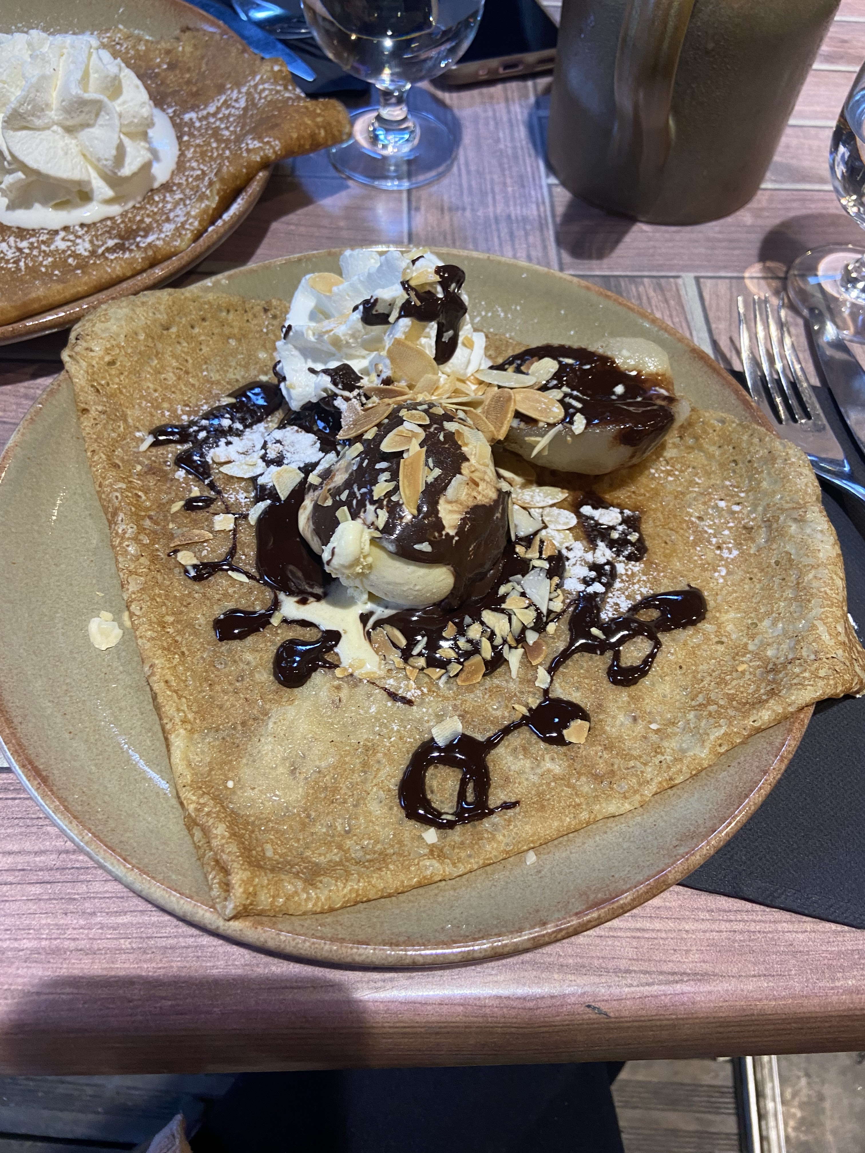 Excellente expérience ! Accueil et service souriant et efficace. Très bonne nourriture : les galettes (tartiflette et Guéméné), les crêpes dessert et le moelleux au chocolat. Le menu enfant inclut un vrai bon steak haché du boucher - c'est bon, c'est copieux, c'est frais. Bonus : la carafe d'eau et la corbeille de petits pains tout chauds arrivent sans avoir rien demandé. La terrasse est très agréable, avec vue sur le Casino. On reviendra très volontiers. Repas à 5 personnes : 2 adultes et 3 enfants (8 à 5 ans).