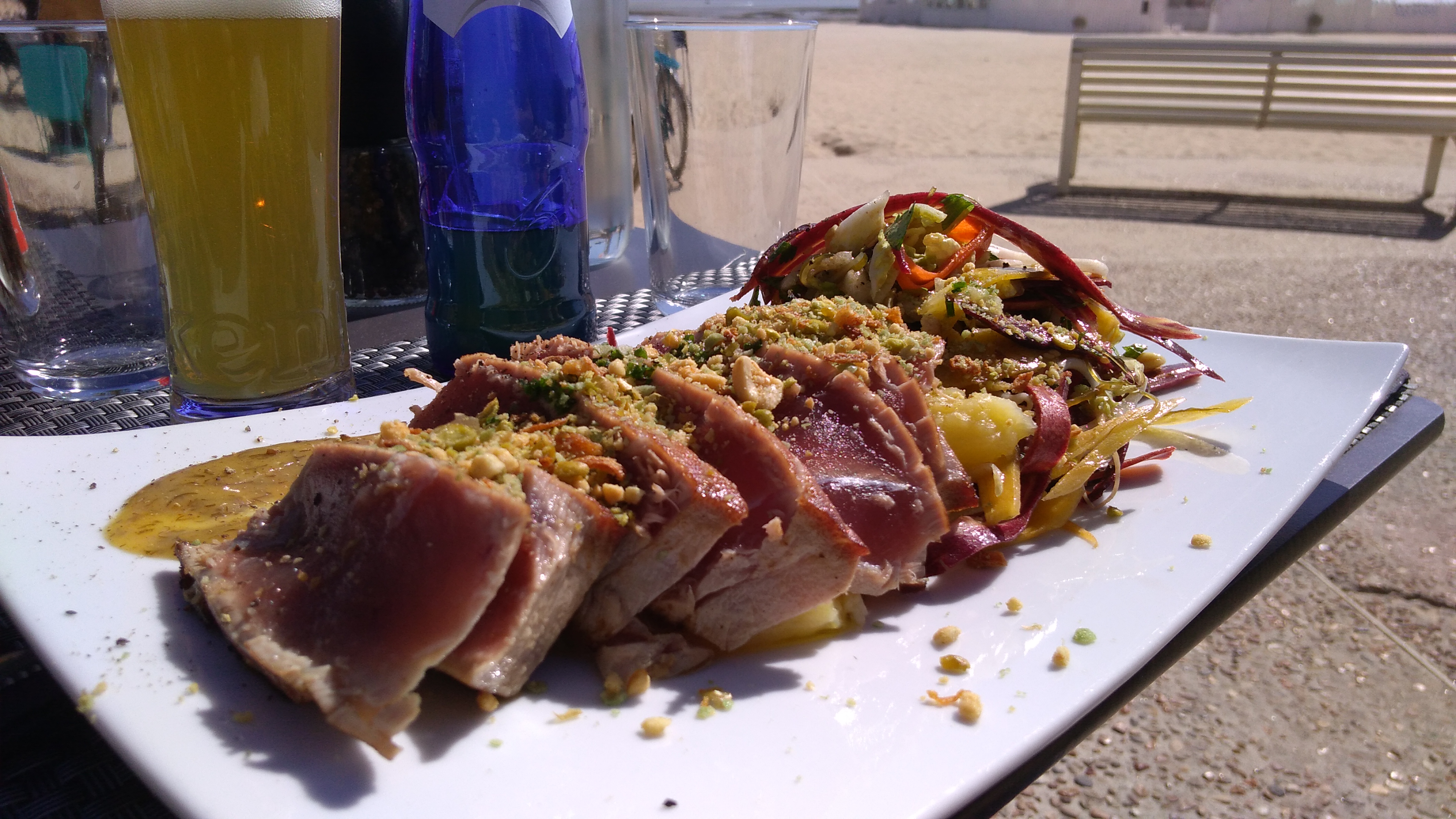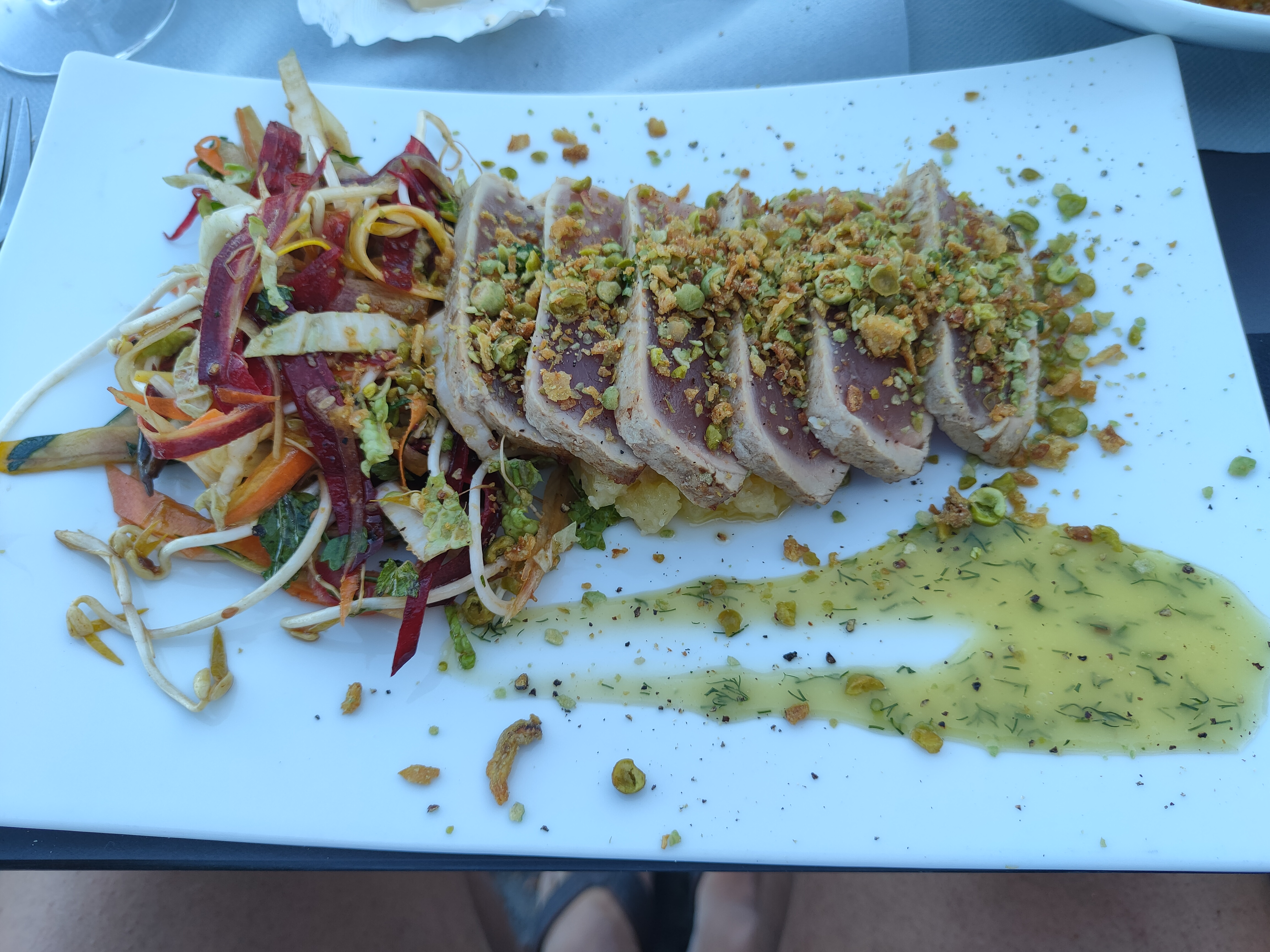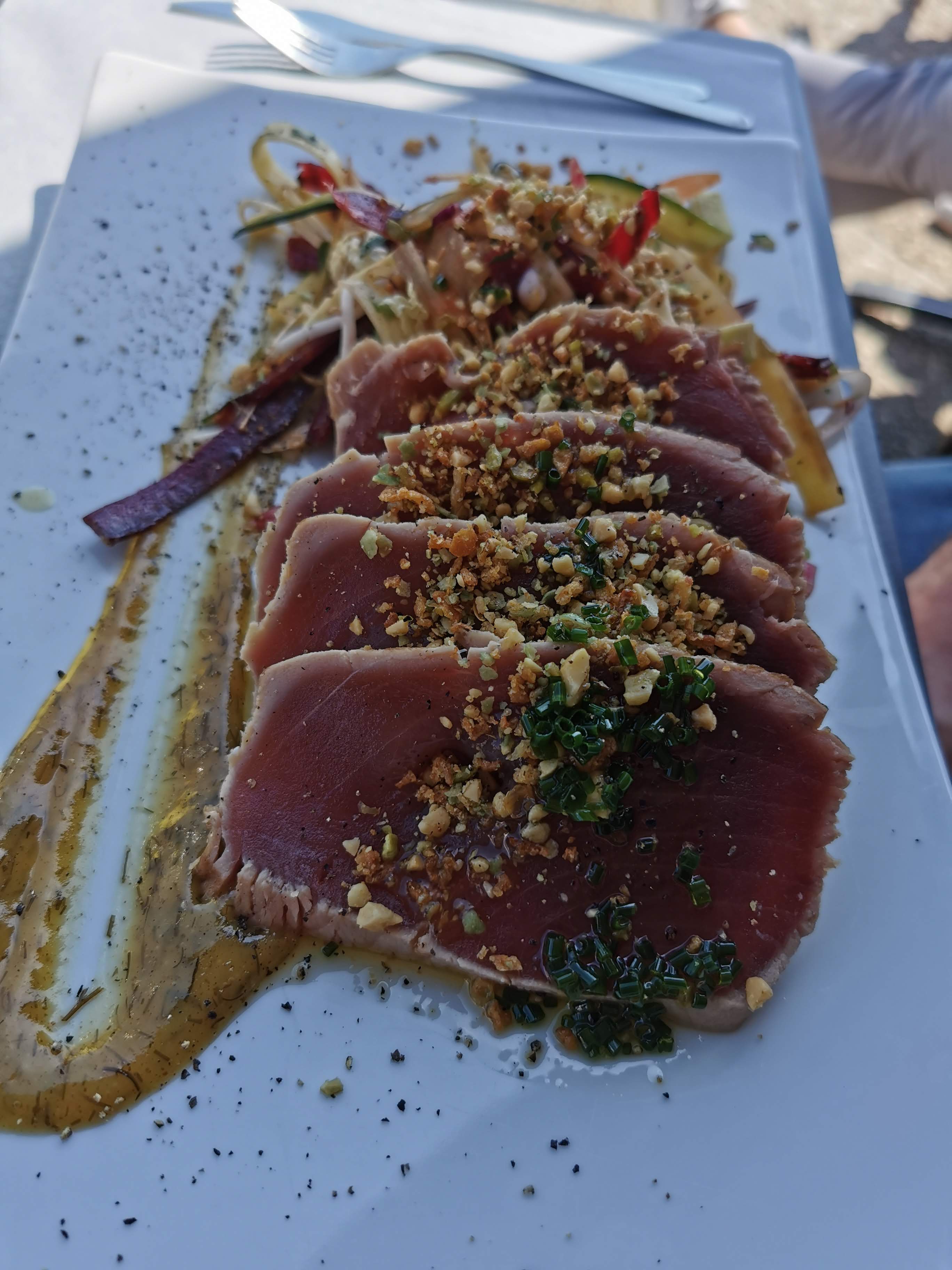 Après avoir pris un verre au soleil le jour de notre arrivée, nous y sommes retournés pour déjeuner ce vendredi midi. Très bien accueillis, nous y avons aussi très bien mangé. Nous avons partagé une salade de poulpe façon cebice puis sur les conseils de la serveuse qui nous a bien présenté les différents plats (peu nombreux mais souvent gage de qualité !), nous avons choisi un tataki de thon et une assiette de maigre et ses petits légumes. Juste EXCELLENTS, que des produits frais, cuisinés quasiment sous nos yeux. Pour finir, un petit café gourmand. Une adresse à retenir. Nous reviendrons si nous séjournons de nouveau dans les environs.