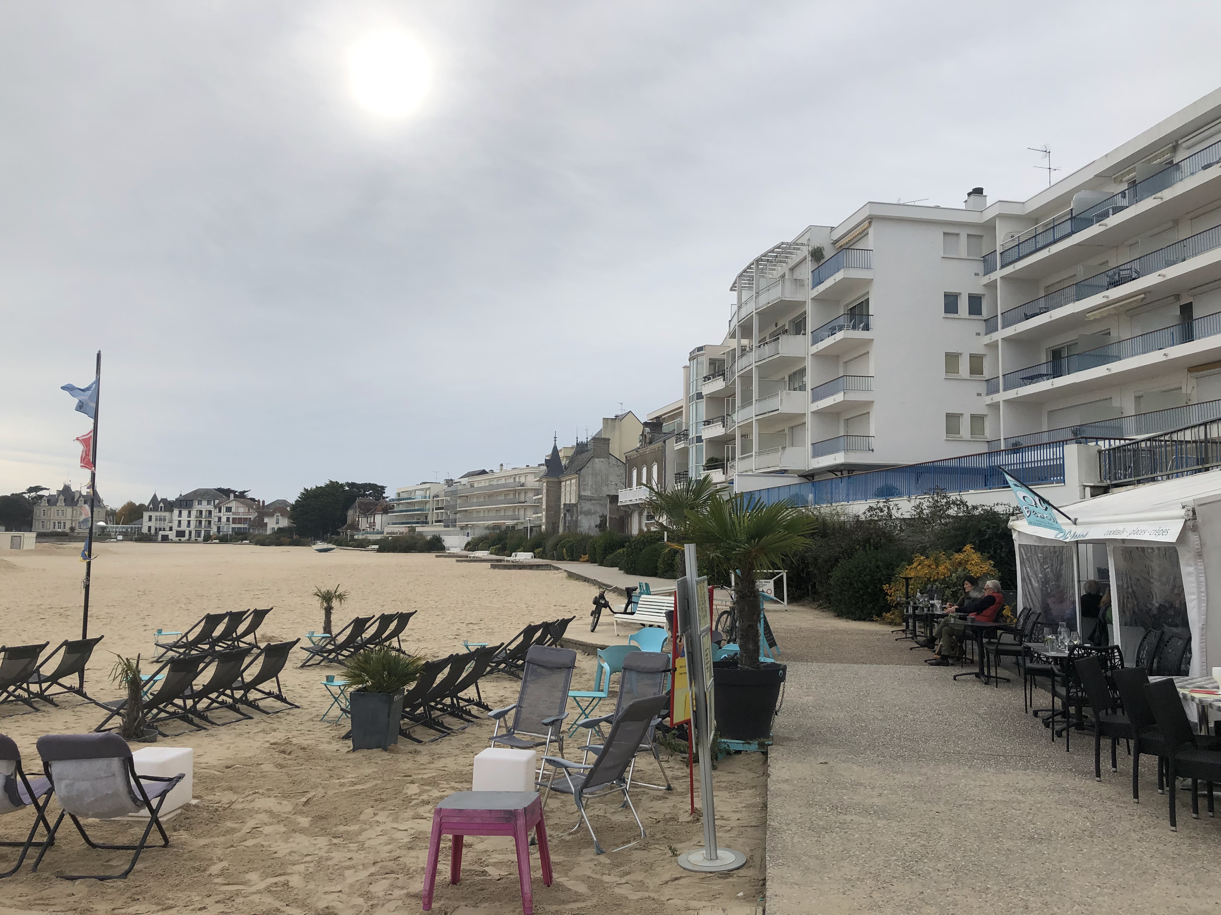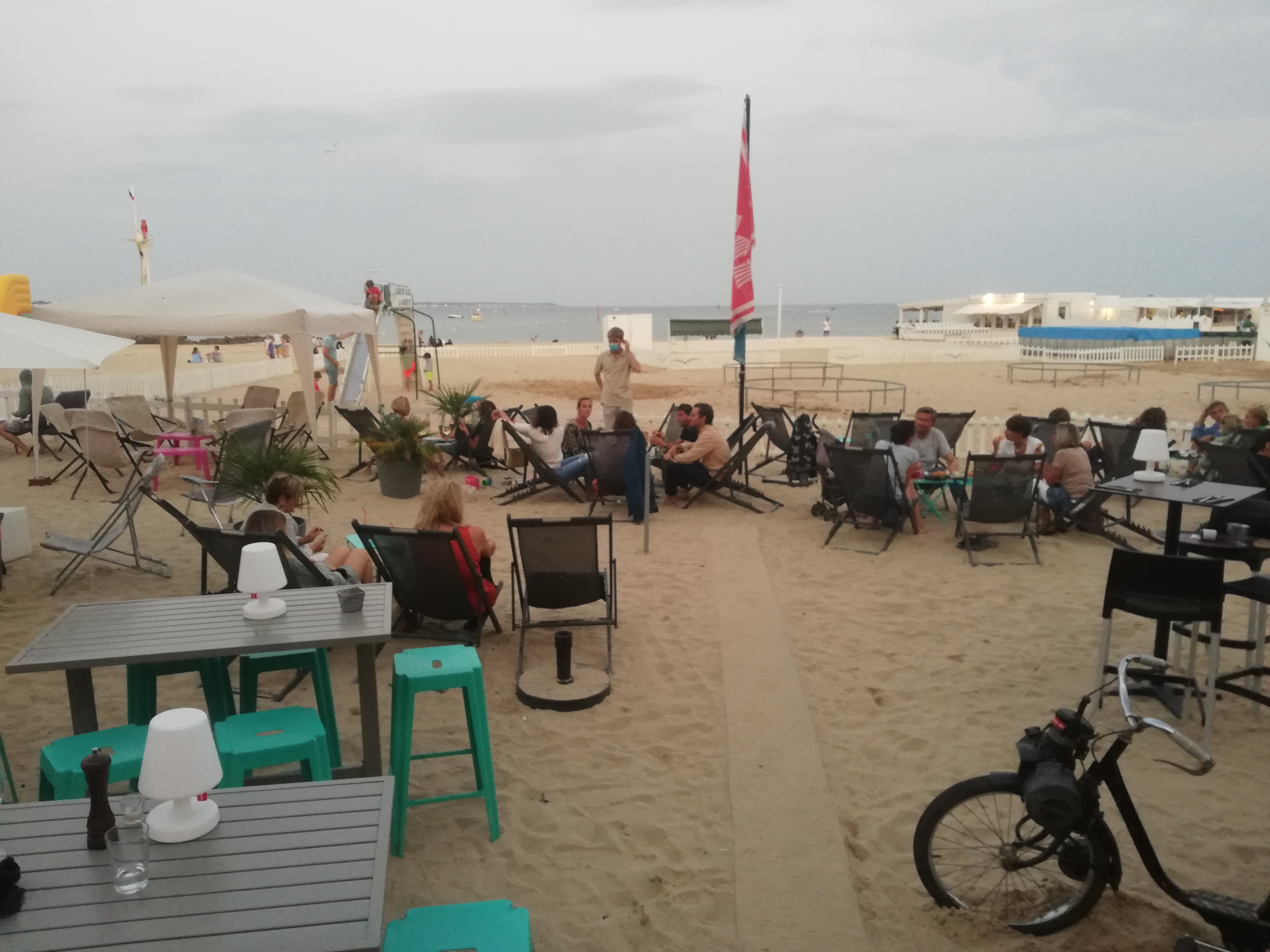 Bar sur la plage du Pouliguen, terrasse et bel espace chaises longues sur la plage. Mais pas de parasols ce jour là donc en plein soleil. Nous souhaitions grignoter car une pancarte affichait crêpes et glaces mais il n y avait rien ! Donc, superbe emplacement mal exploité (on a attendu 20mm dans nos transats avant l arrivée d une serveuse )