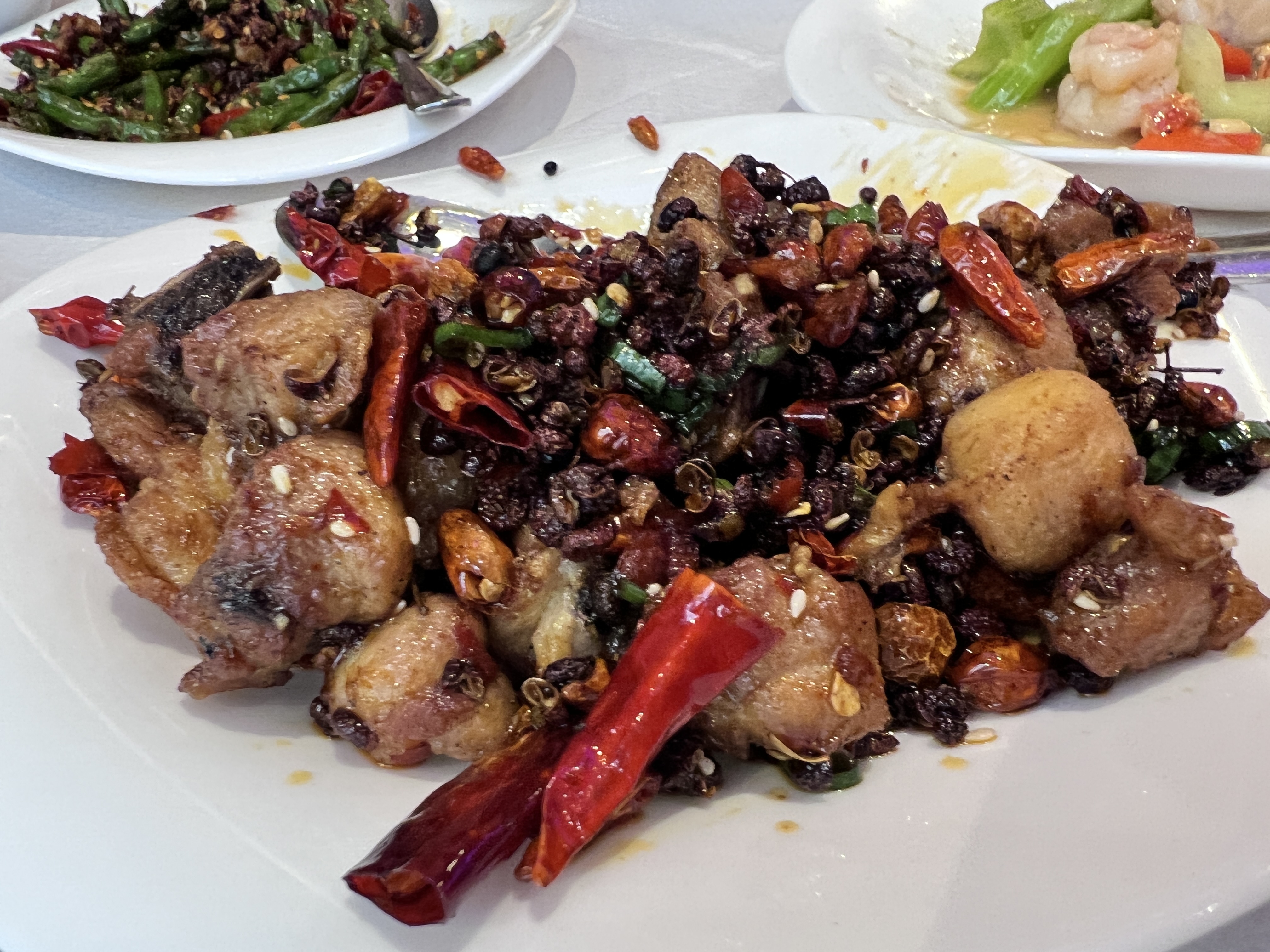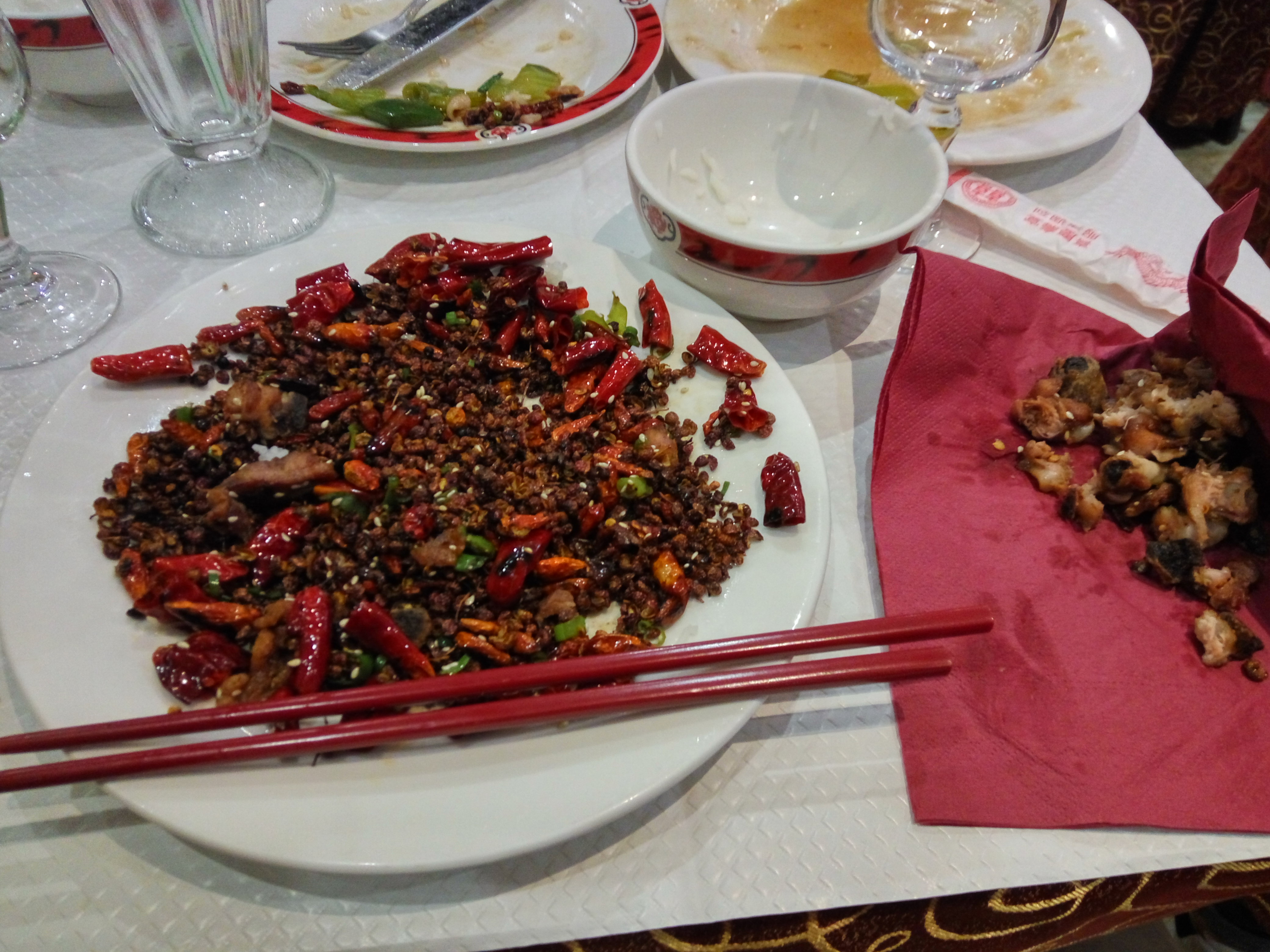 Un peu trop chinois à mon goût. Il y avait du poulet croustillant et des petits morceaux de poulet et toujours avec des os. Le poulet était frit avec un bol entier de grains de poivre et de piments avec beaucoup d'exhausteur d'arôme. J'ai aimé le niveau de piquant, mais ce n'est pas que mes lèvres soient devenues engourdies à cause du message. Le poulet était également difficile à manger, car séparer les os des petits morceaux de manière civilisée était presque impossible.