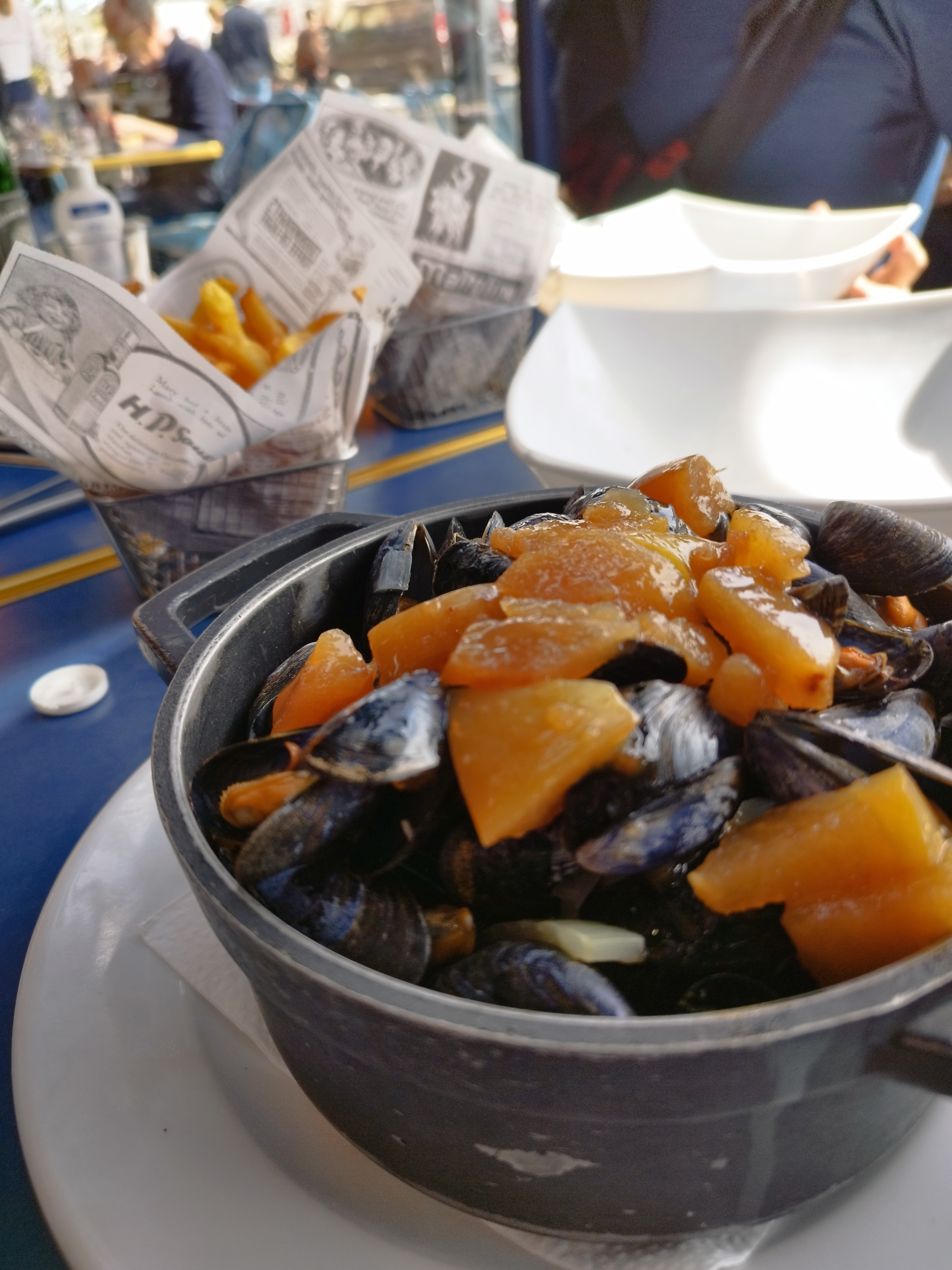 Pour répondre aux précédents avis datant de quelques jours... Soyez indulgent pendant le festival de cerf volant, certes un peu d'attente peut-être (pas notre cas car nous avons regardé l'affluence la veille). Notre expérience : 3 formules a 27,90€. Très bien mangé Saumon gravlax très bon Crottin chèvre très bon Moules a différentes sauces copieuses, plein de sauce ( petit bémol pour moi, les dieppoise annoncées avec des crevettes, trop peu trouvées) Service accueillant, et non pas speed ou limite aimable comme j'ai pu lire. Pour faire simple on pourrait y retourner sans problème. En photo le reste de la sauce après le passages des moules et des frites.