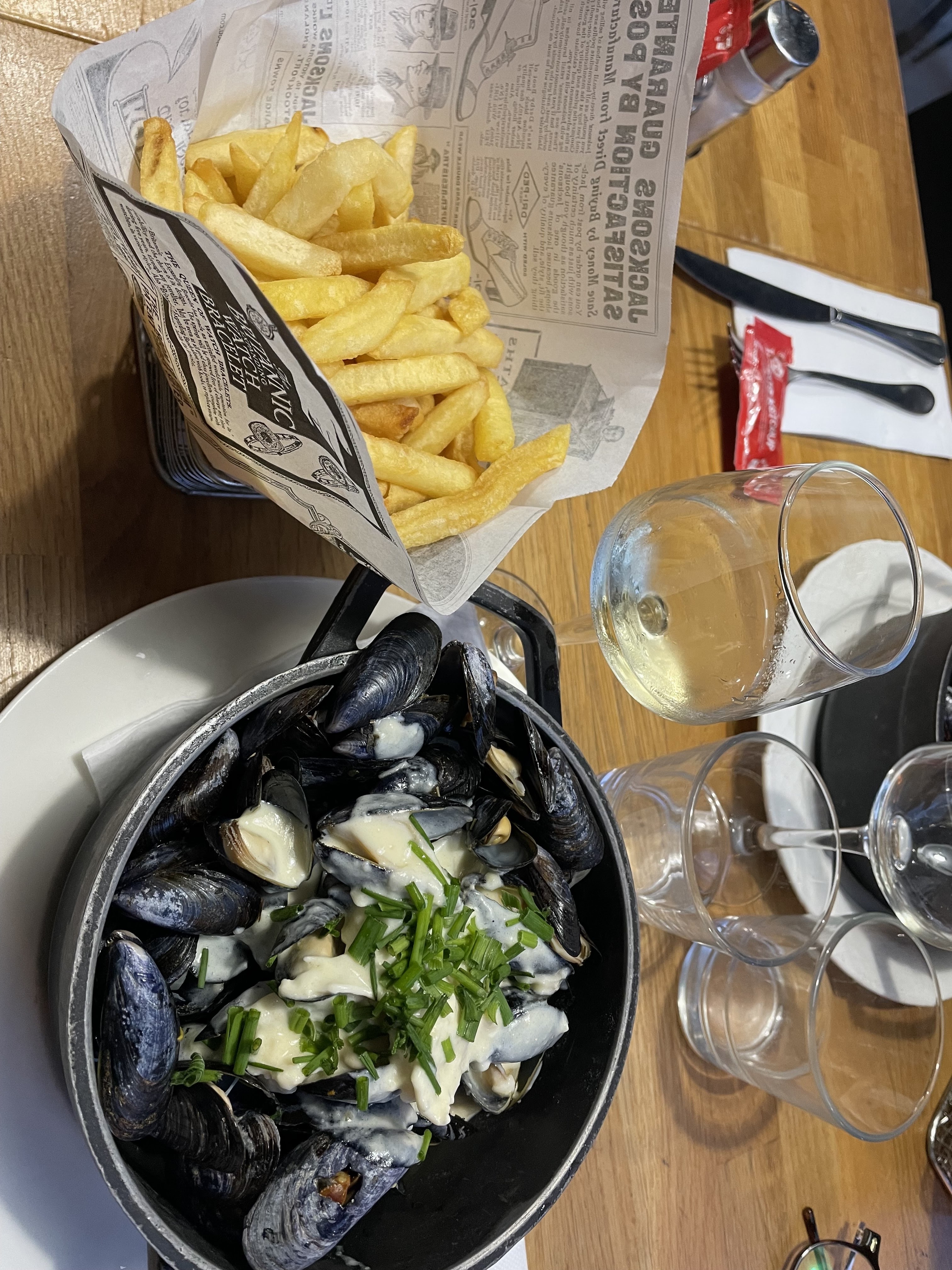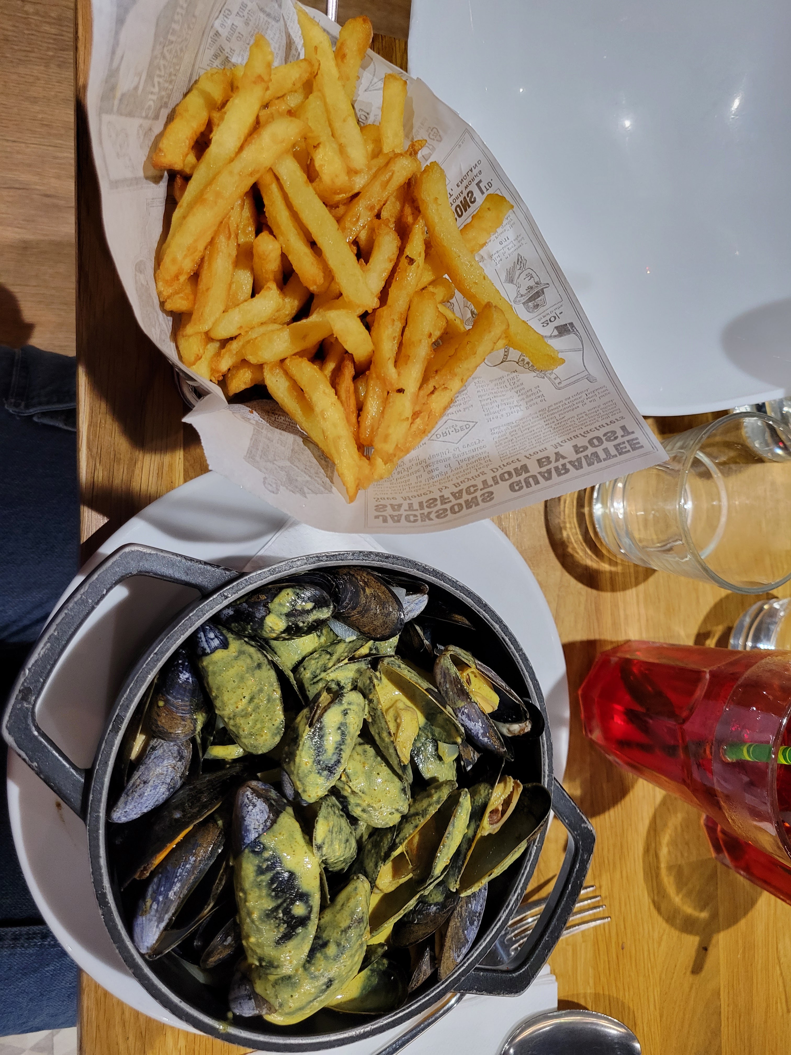 Très bon restaurant, nous avons pris des moules au curry fraîches et délicieuses avec des frites maison très bonnes ! En dessert un tiramisu bon et un crumble un peu trop cuit mais délicieux. Le serveur était très à l'écoute, disponible et agréable, il n'a pas hésité à nous rajouter du sirop sur simple demande dans nos boissons !