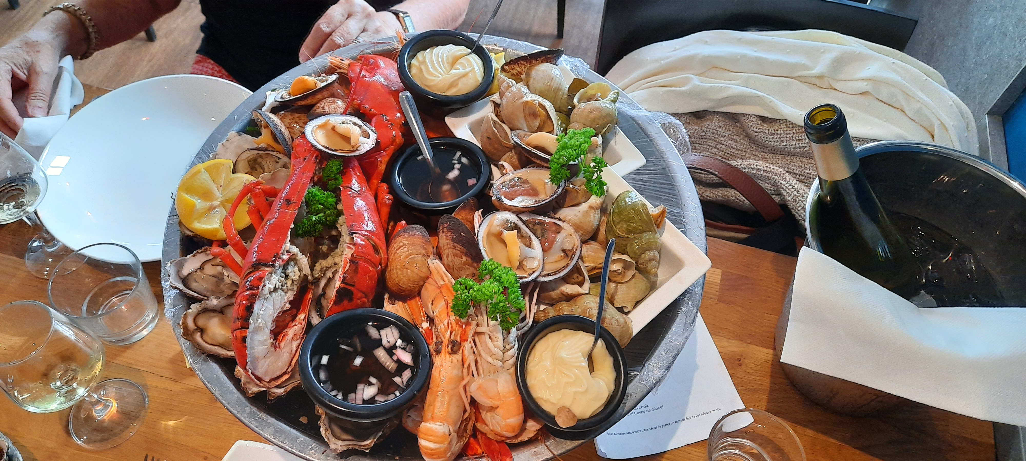 La terrasse n’est pas silencieuse, mais c’est le quai qui veut ça. Accueil indifférent, prise de commande désabusée, service inattentif, au revoir murmuré. Une fraction minoritaire du personnel semble un peu plus motivée. Vin au verre correct. La carte propose de la diversité. L’assiette dégustation de fruits de mer ou le homard et ses légumes de saison ne requièrent pas de commentaires superflus. La fraîcheur règne. Là, c’est plus appréciable, dirais-je !
