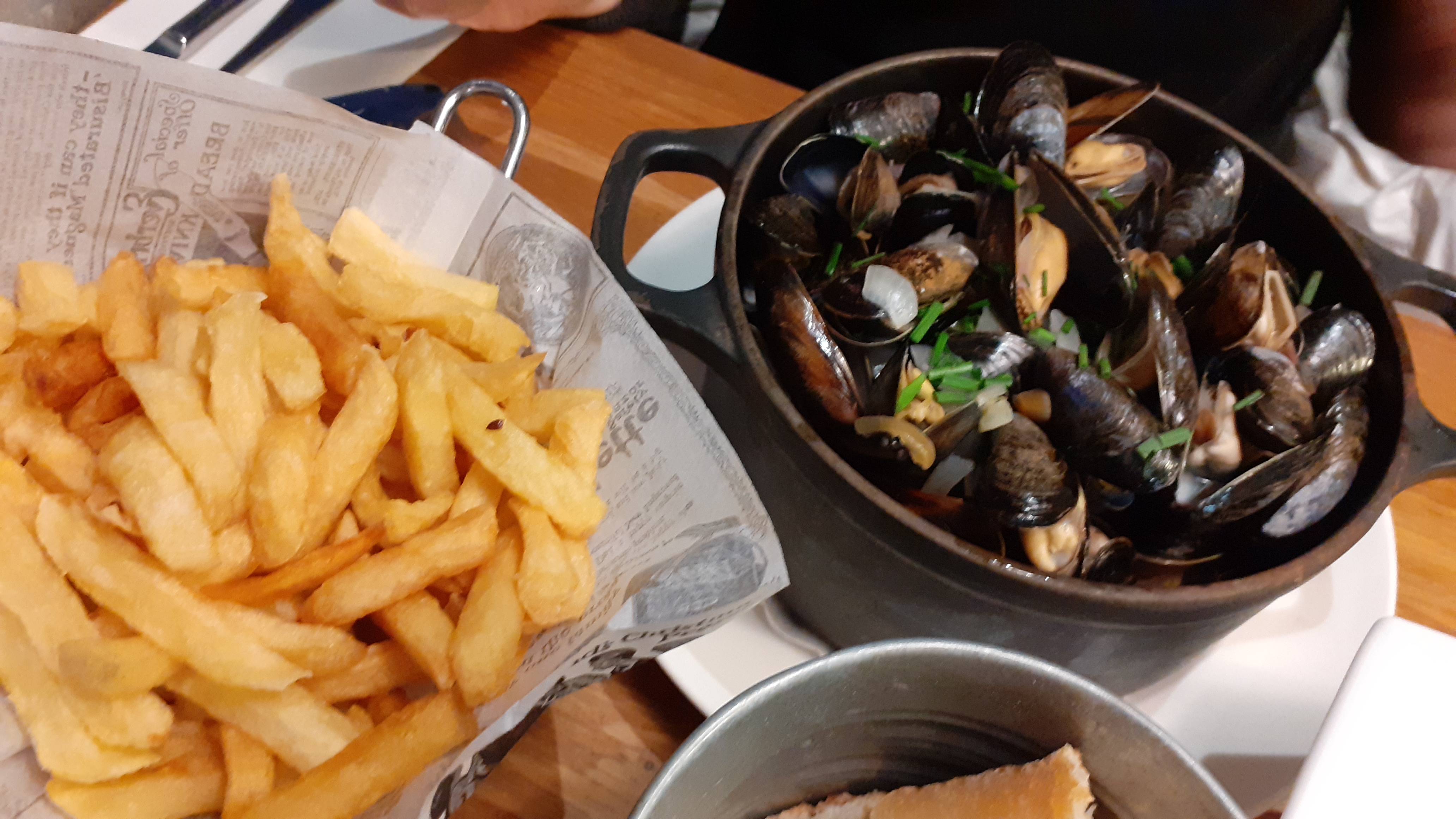 Manque de chaleur à l'accueil mais également au service. Vite fait! Bien fait! Des moules marinières dans lesquelles on ne goûte ni le vin blanc ni le céleri mais on constate un soupçon d'oignons. Le tout accompagnés par des frites molles. Pas de pain à table ni proposition. Très déçue! Seul point positif : la déco.