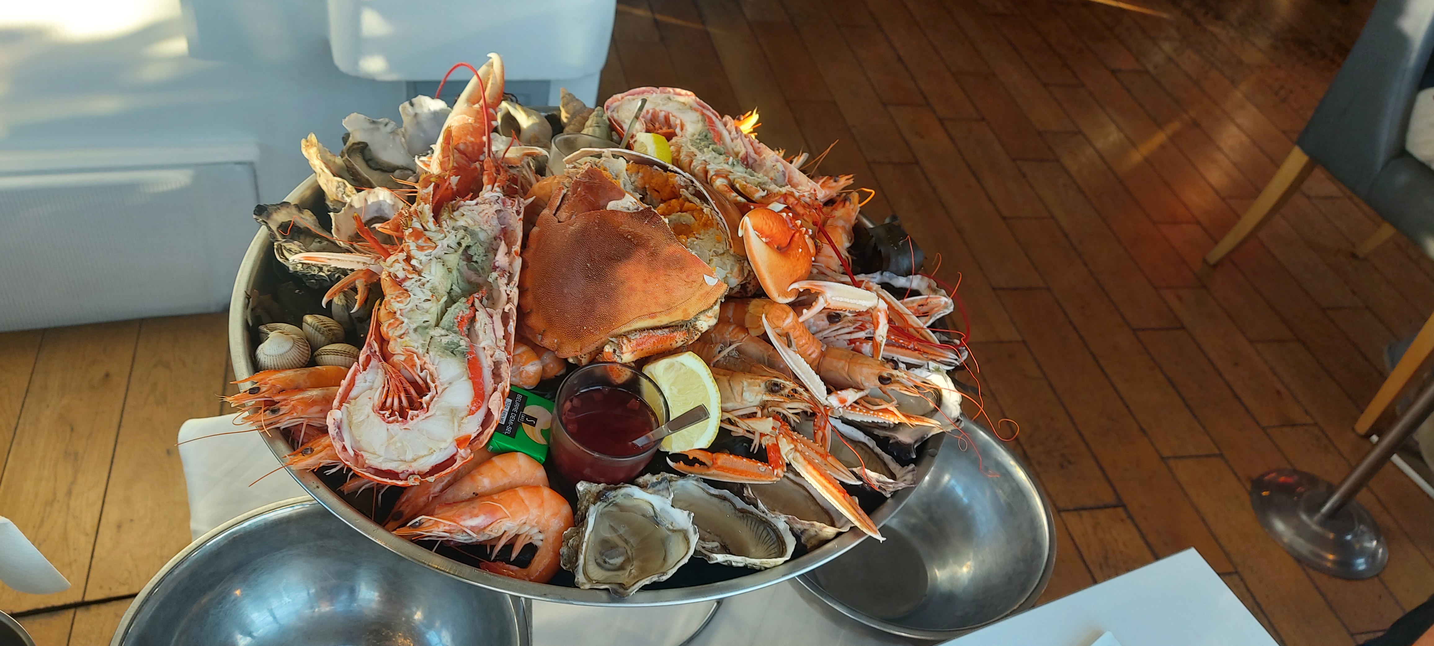 Personnel accueillant et souriant, cadre super sympa avec vu sur le couché de soleil sur le port. Le plateau de fruits de mer est varié et excellent, en particulier les huitres. (Homard, tourteau, palourdes japonnaises, crevettes, langoustines, coques, bigorneaux, huitres). Le homard bleu breton flambé au cognac est une superbe découverte, vraiment excellent. Les produits marins sont de proximité et très bons. Le carpaccio de sole a la betterave est très bon bien qu'un peu salé. Le tartare de beuf était lui aussi bon et origial. Les vins et champagne sont bons. Le prix est élevé mais pour une occasion spéciale je pense que ça vaut le coût. Je recommande fortement.