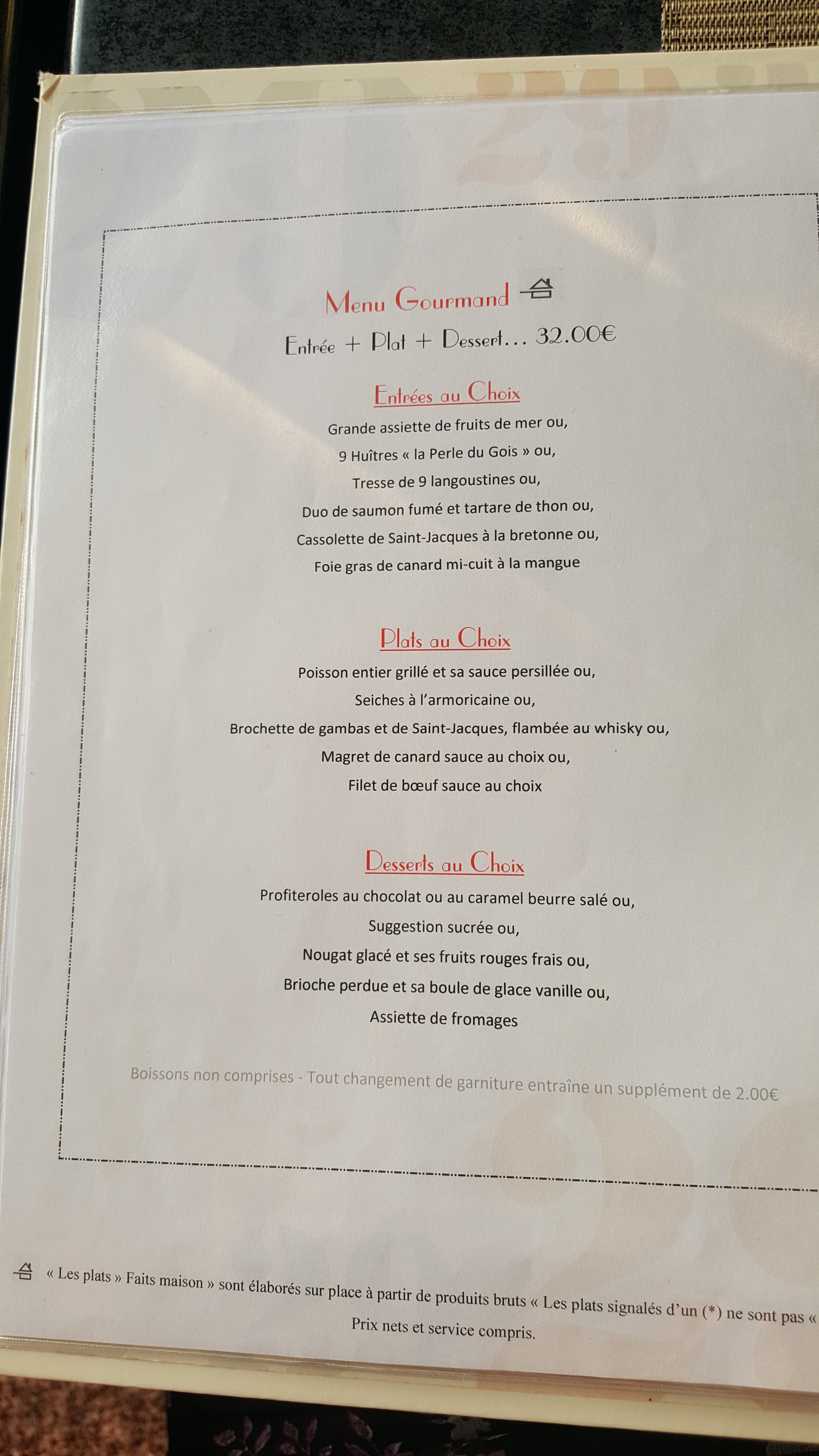 Dommage de prendre un menu à 34€ pour se retrouver avec des langoustines surgelées, une honte en bordure de mer 👎la viande était correcte, par compte le dessert profiteroles avec glace vanille les choix sont acheter chez leclerc en boîte non c'est pas du bon boulot .