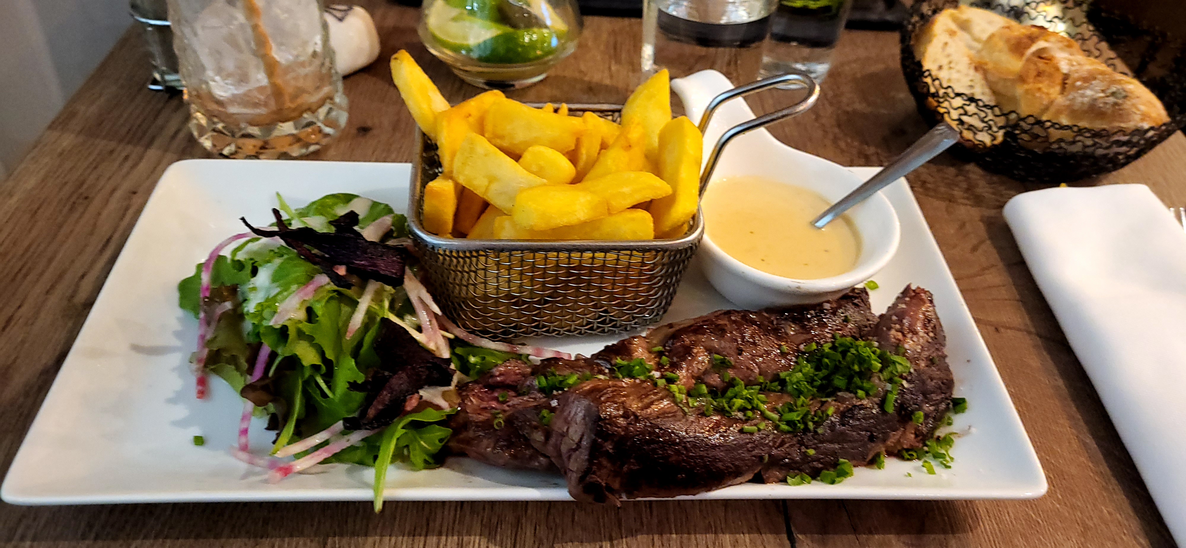 Bonne cuisine et cadre agréable !! Bon cocktail maison. Attention avec les intitulés des plats qui ne reflètent pas trop ce qu'on retrouve dans l'assiette (faux-filet légumes de saison et frites => petit panier avec des frites correct mais 4 très petits morceaux de légumes qui pour moi étaientdonc plus de la décoration que de l'accompagnement) Dessert moyen (pour le mille feuille caramel beurre salé que j'ai pris mais les autres semblaient meilleurs)