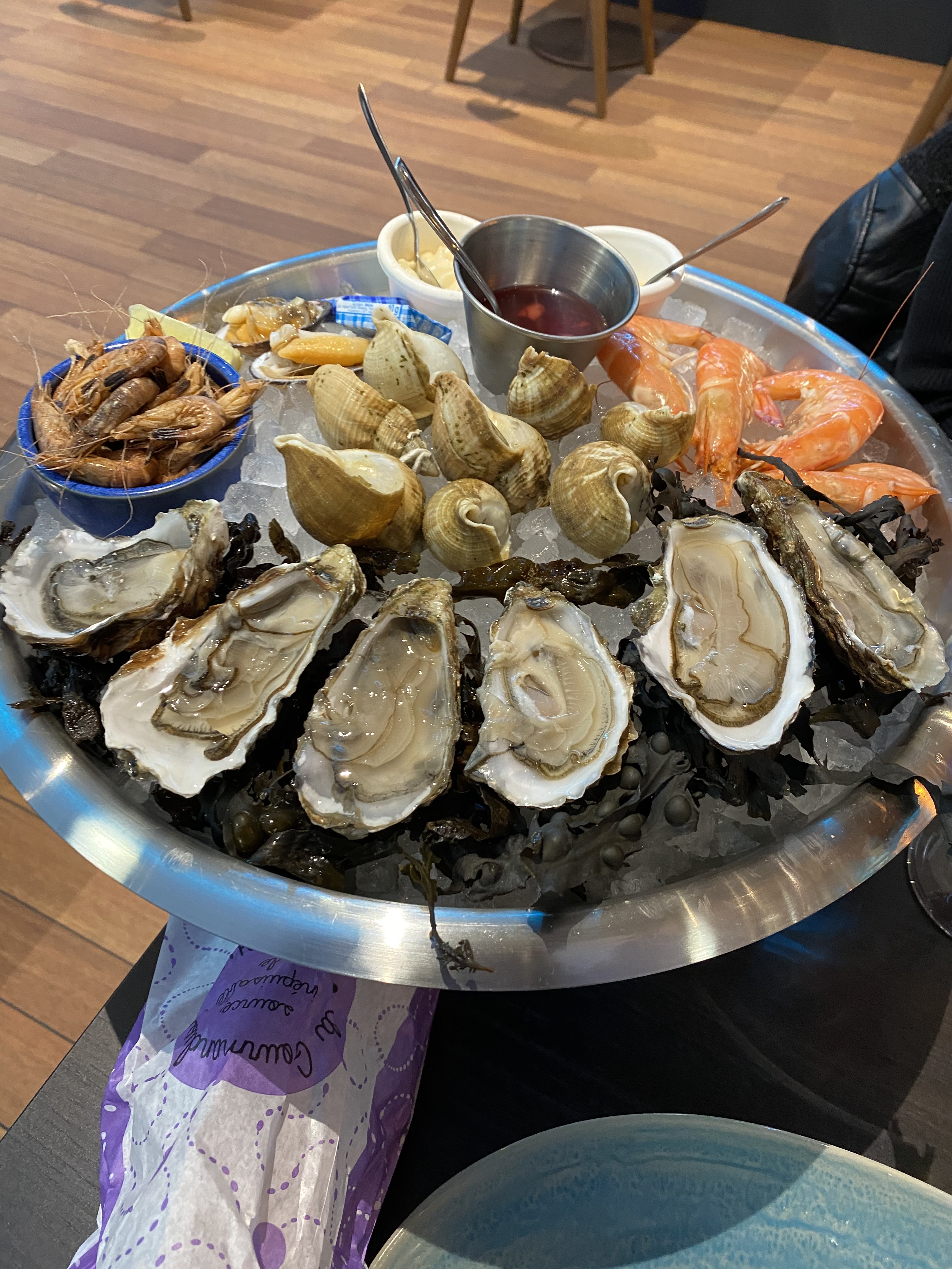 le vin et les huîtres étaient très bien mais le reste (tourteau, crevettes etc) sont médiocres : aucun goût si ce n'est celui de l'eau. je ne retournerai pas dans ce restaurant.
